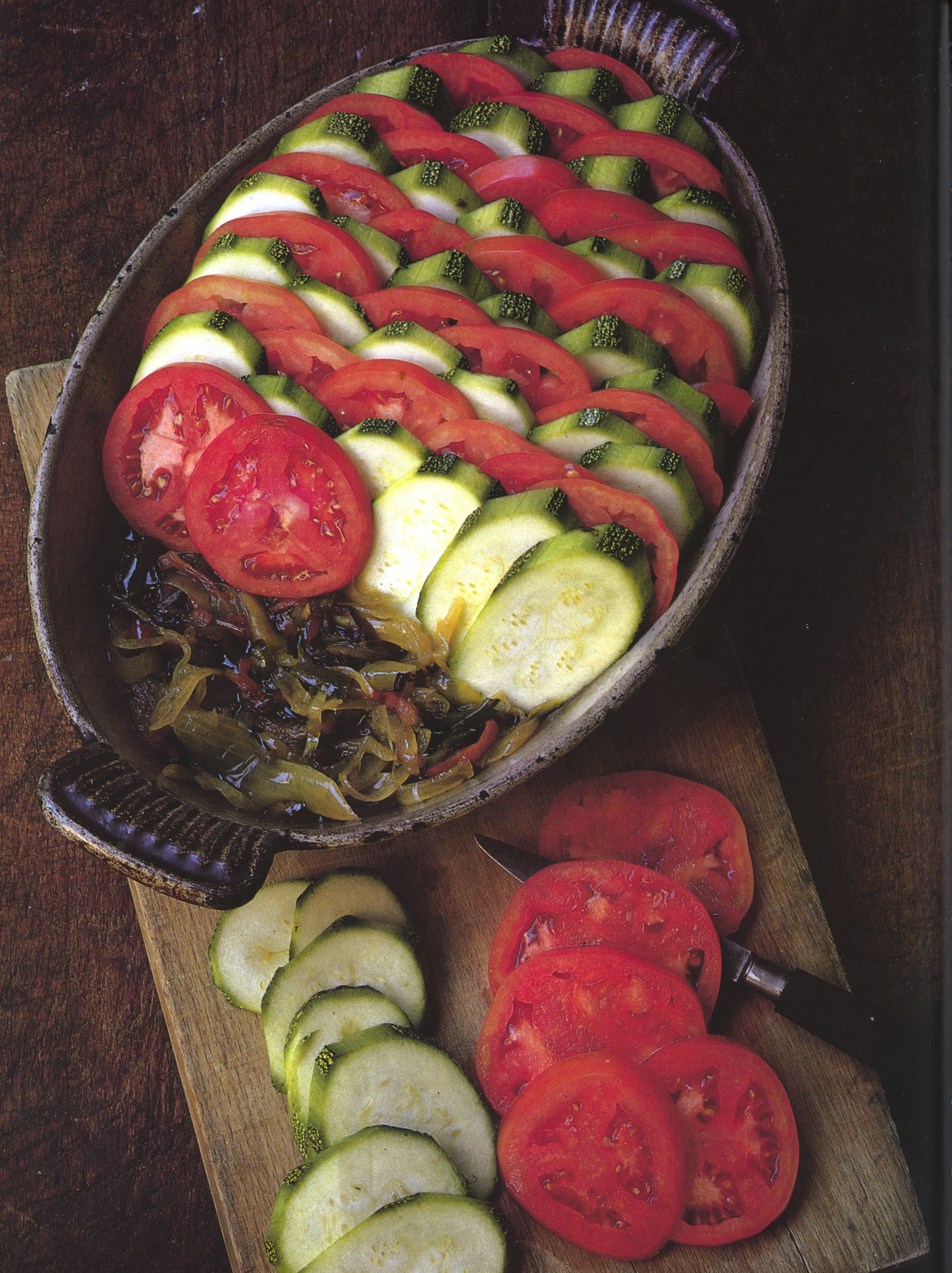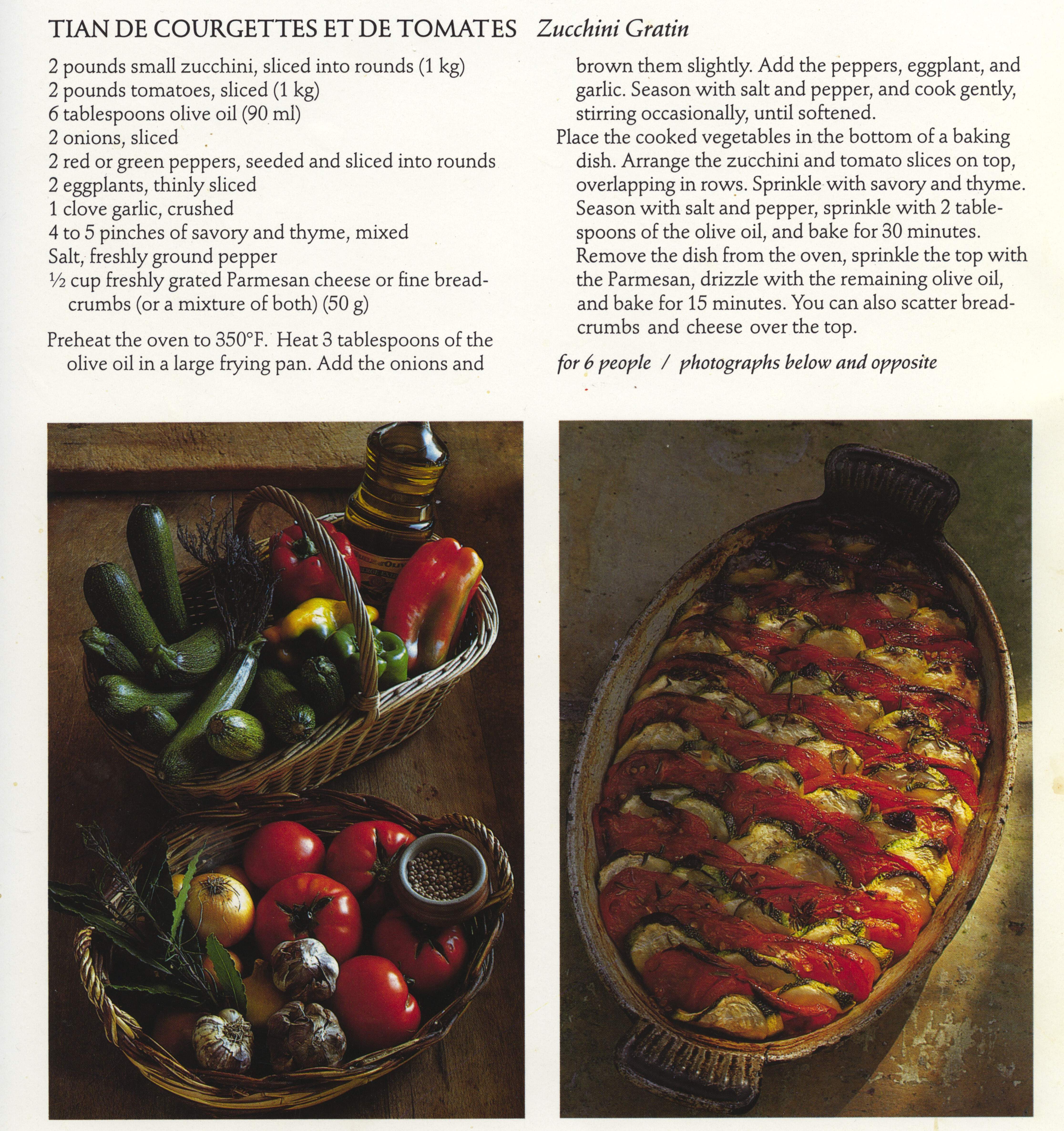 OK, sports fans, it’s time for something different tonight. I was flipping through one of my favorite old photo/cookbooks, A Taste of France by Robert Freson (printed 30 years ago). First, I found exactly what I wanted — a Tian de Courgettes et de Tomates from Provence — which I will make for a dinner contribution on Saturday night, with fresh produce from our farmers’ market that morning. This part is the “sublime”.