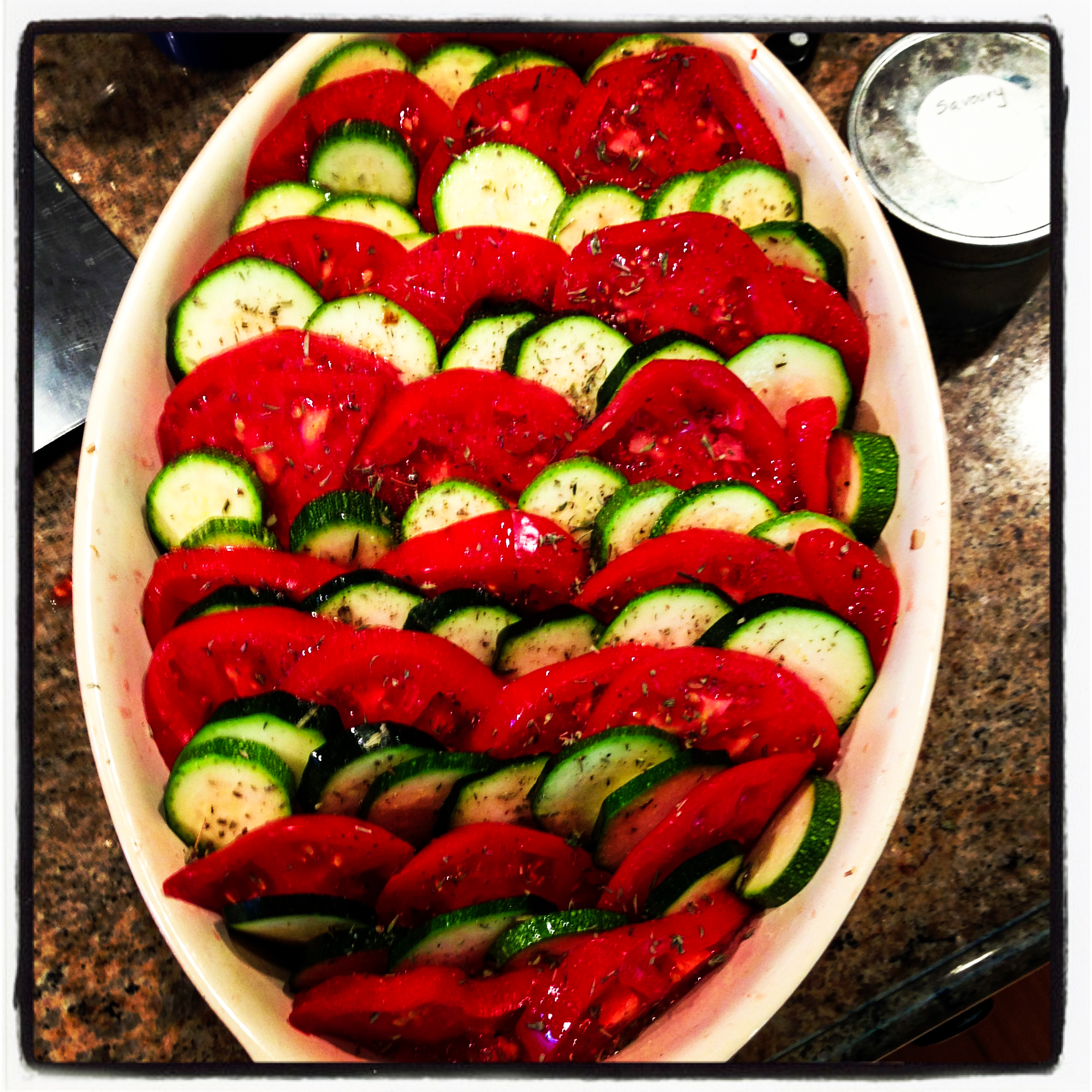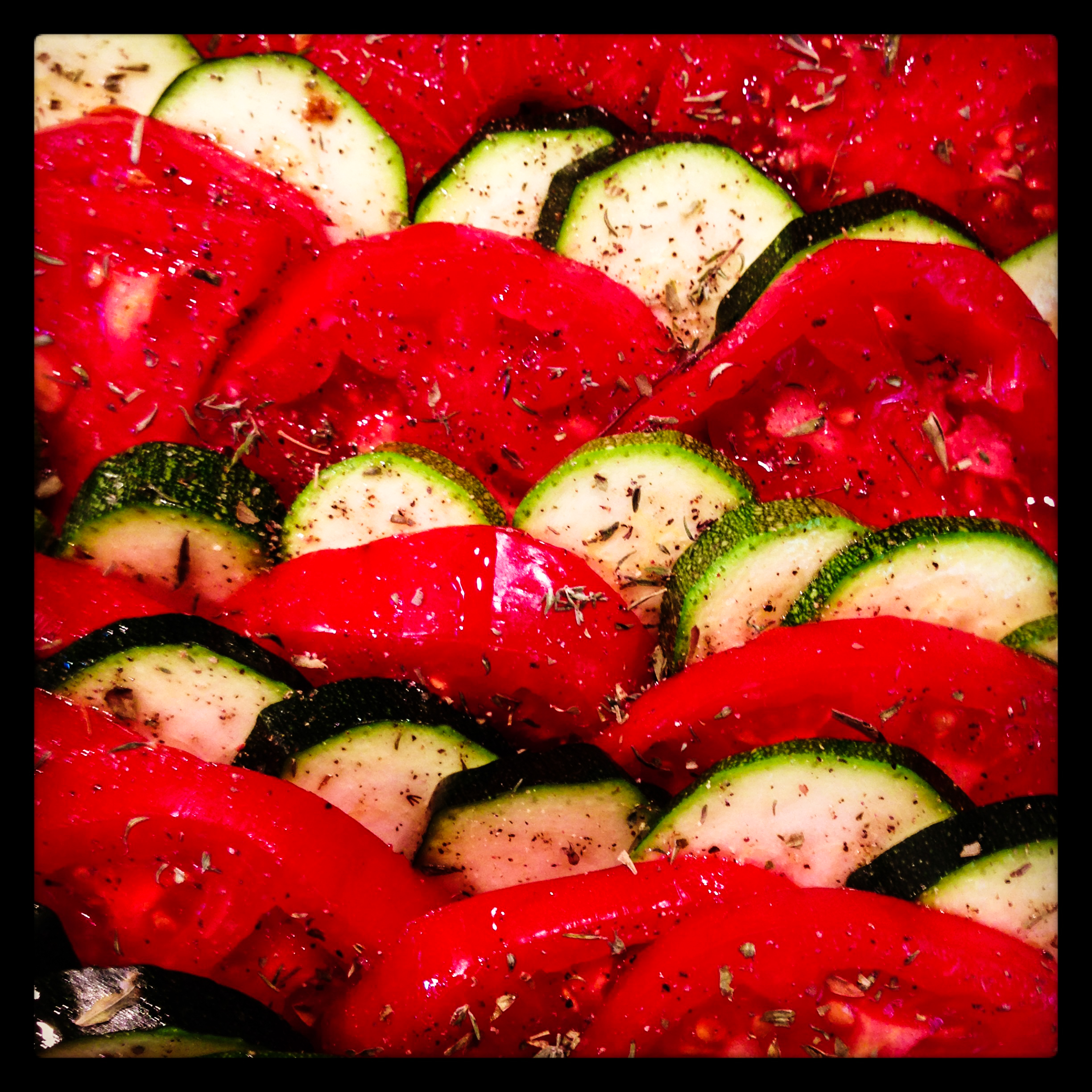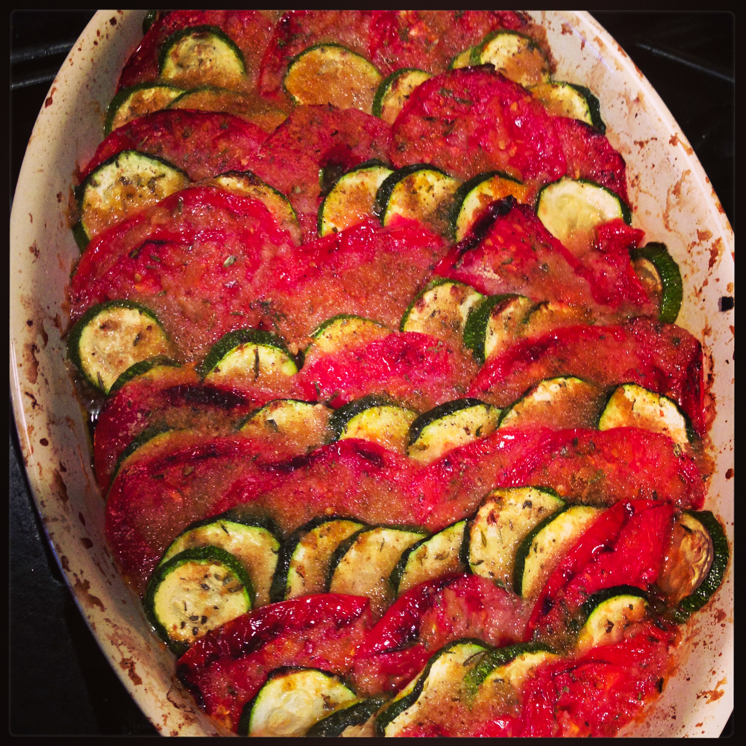 We made a small contribution to the meal — the Tian de Courgettes et de Tomates — a zucchini gratin, partly to allay our host’s concerns about making a fine dinner for us foodie vegans. Her fears were without any basis. Here are her words about the meal: