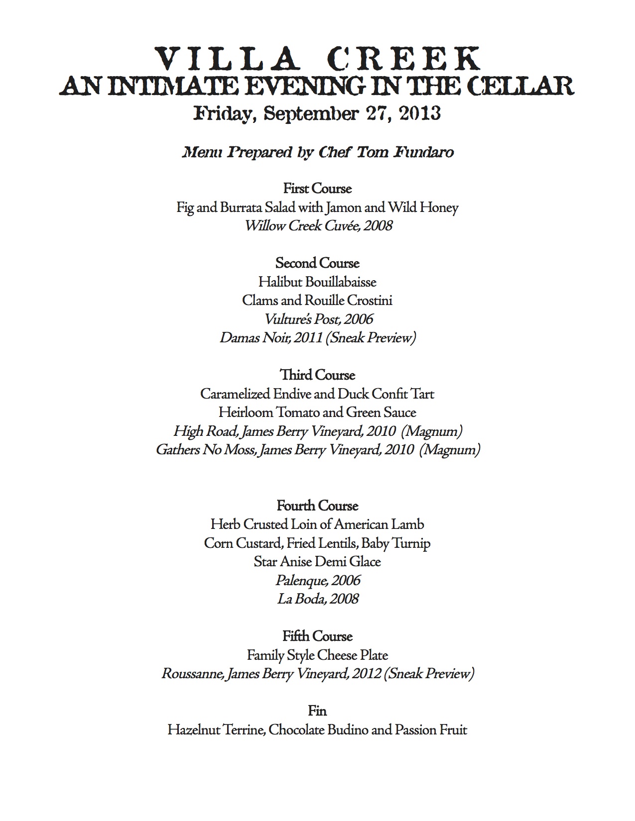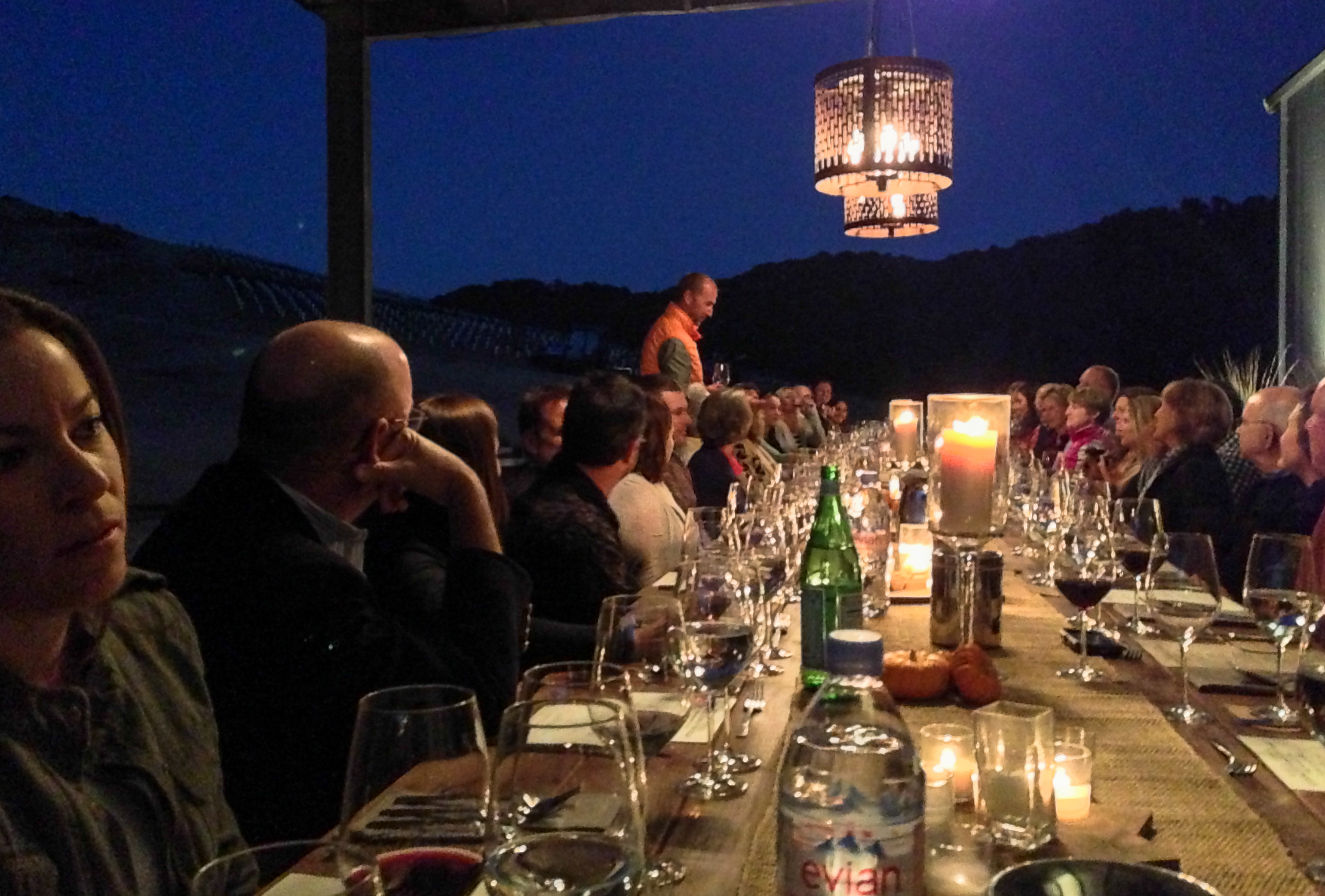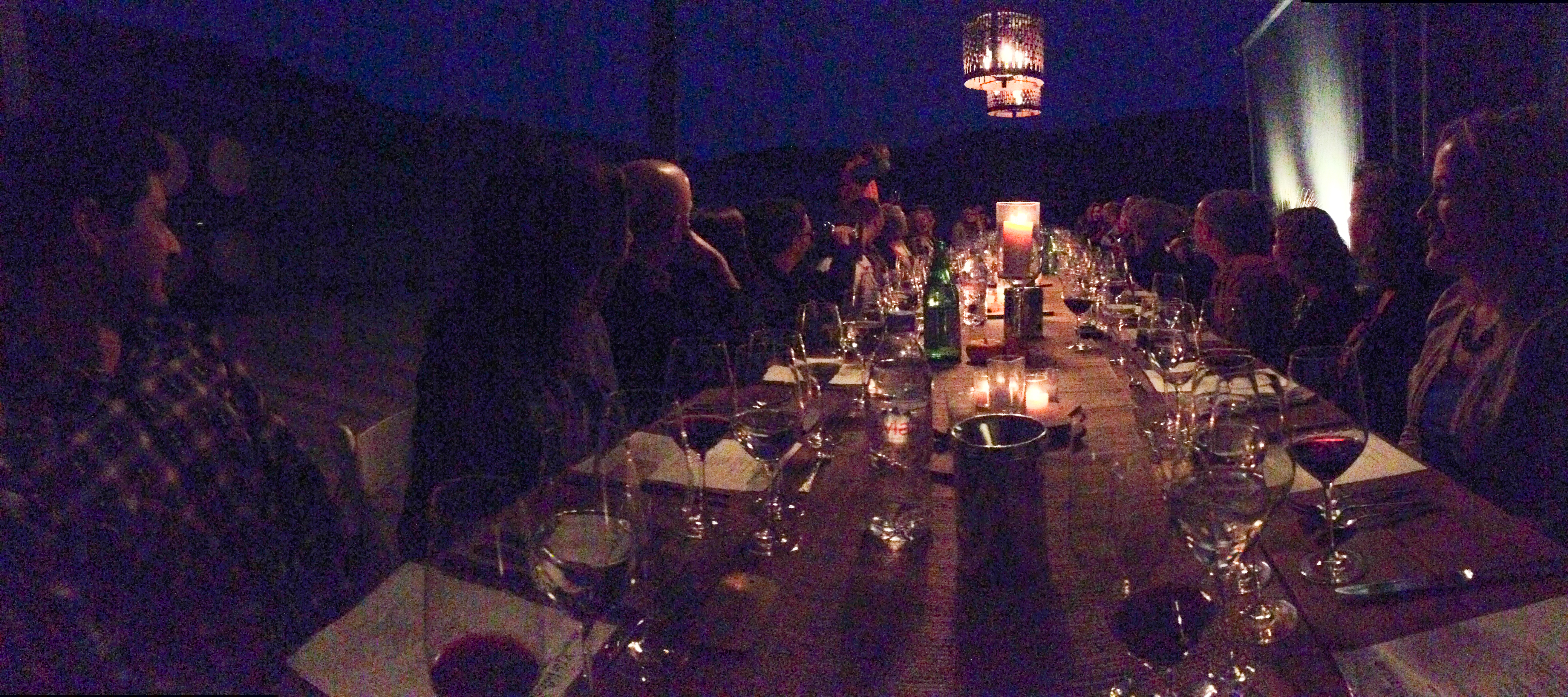 As you can see, there was a full complement of new wines and some from the library. The food, service, wines, guests and ambiance were all delightful. Cris said a few words to the group at the long table, and the rest of the time we just enjoyed.