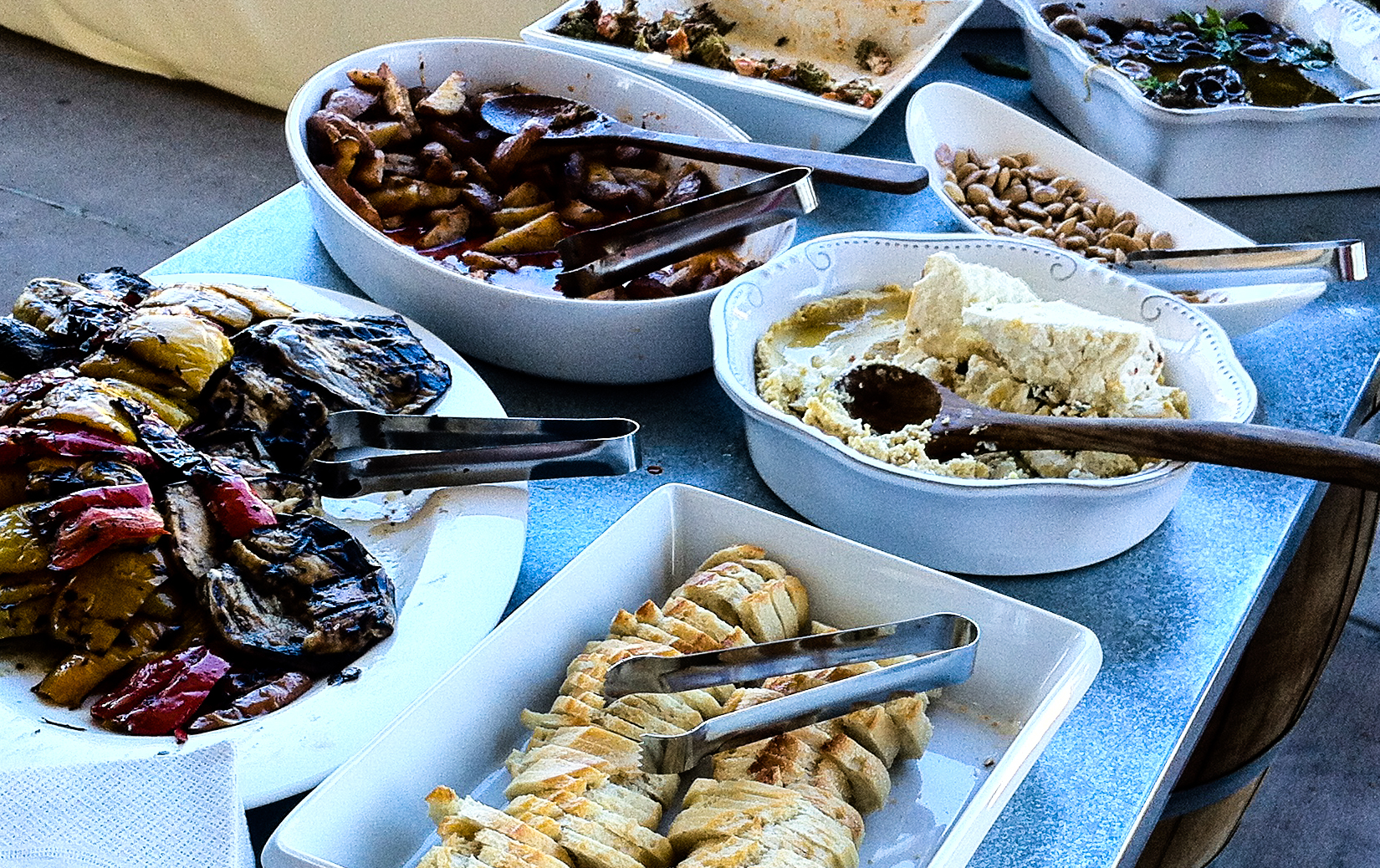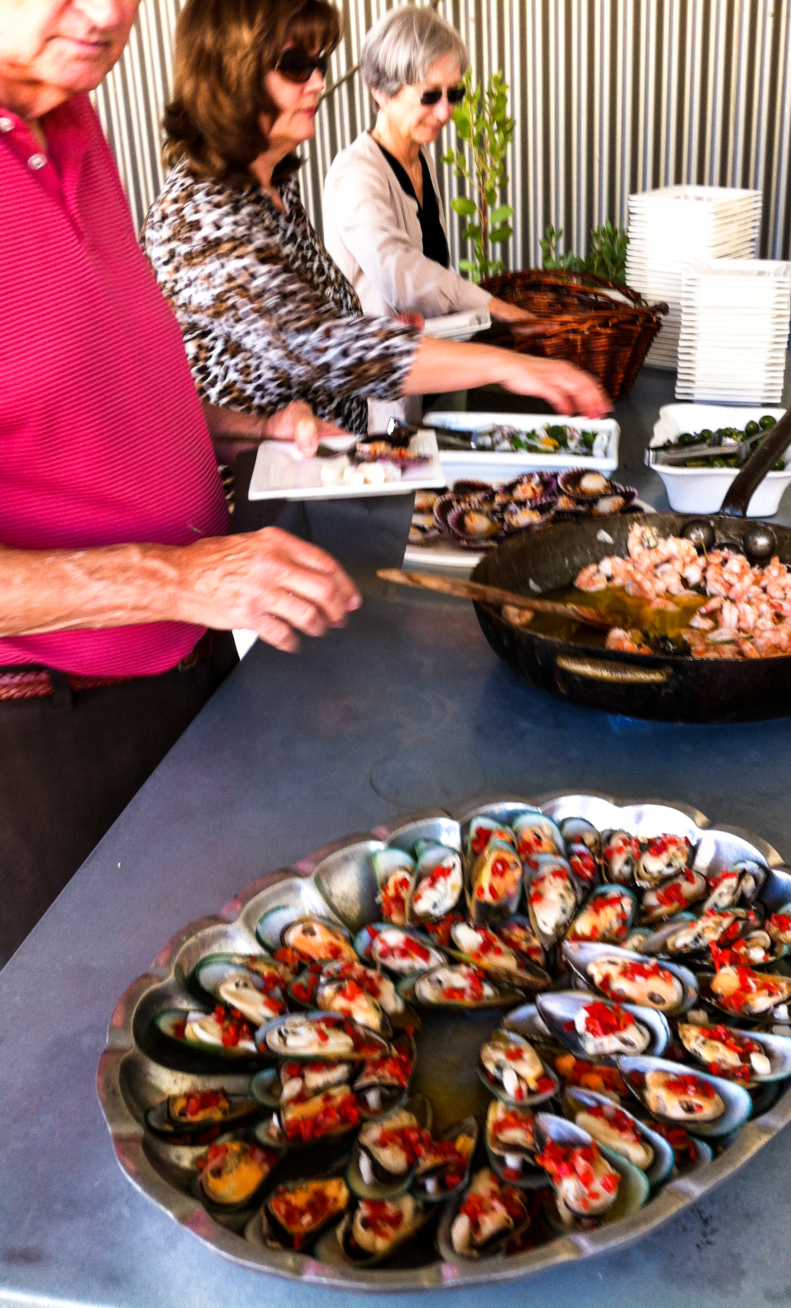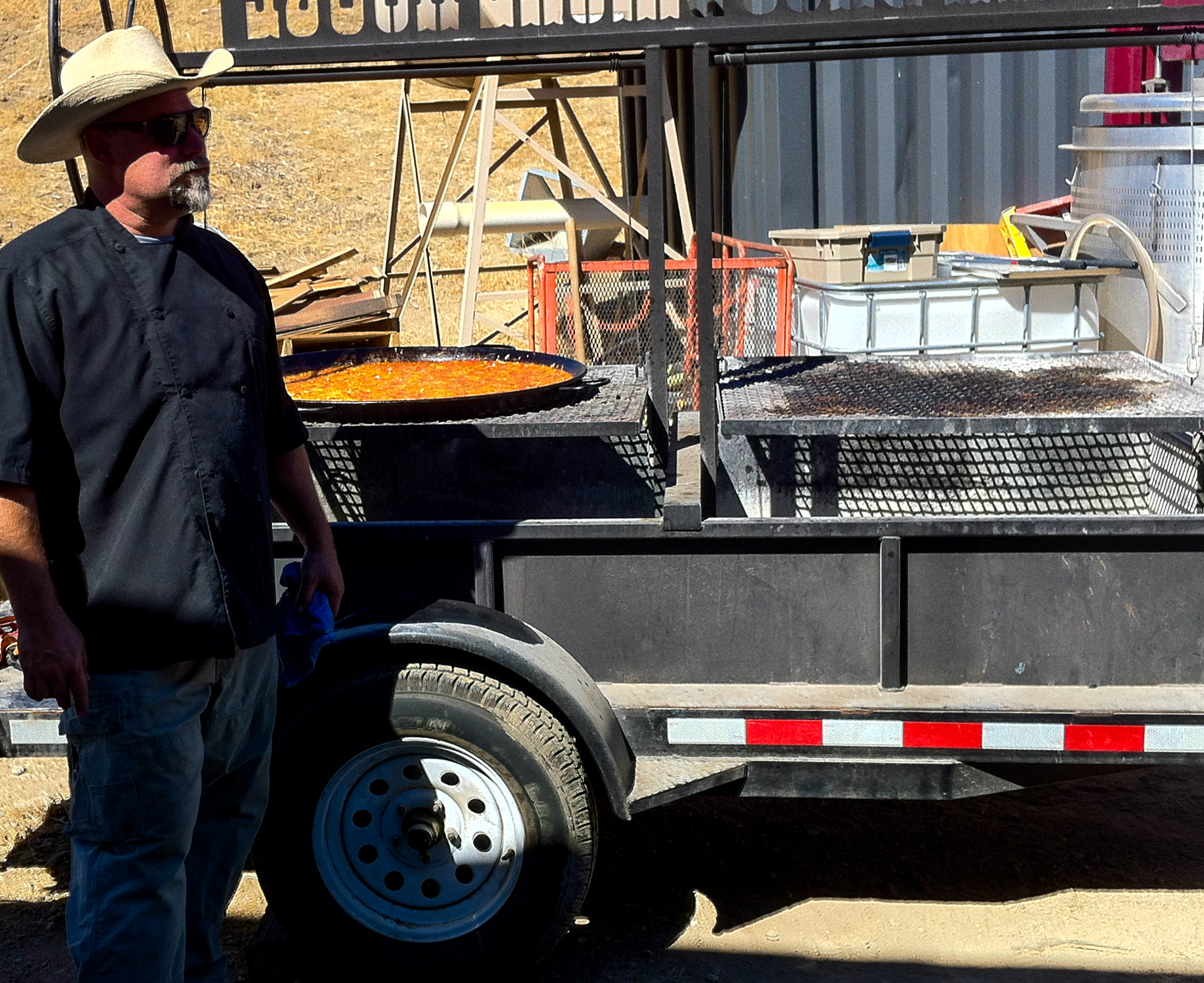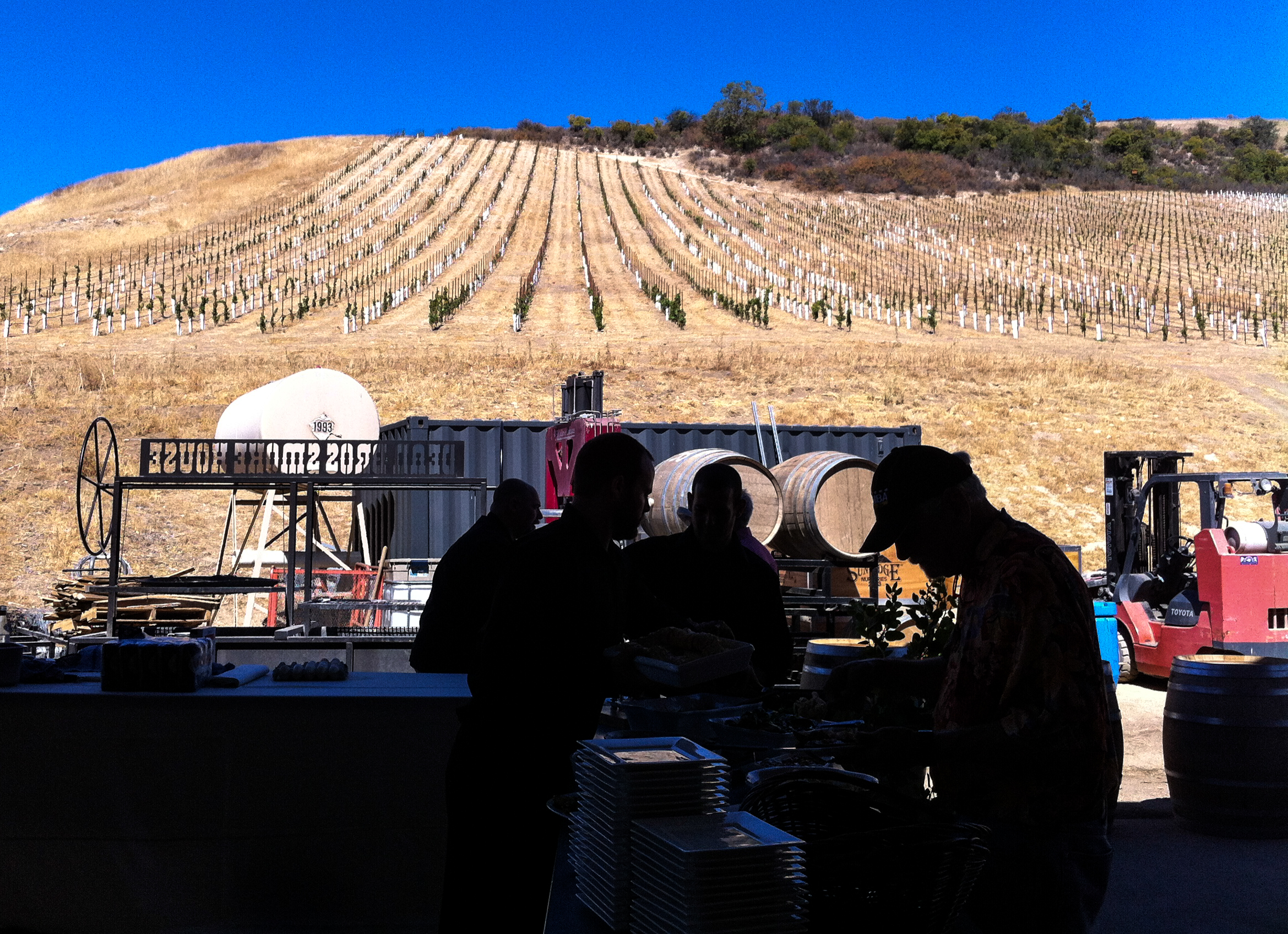 Saturday morning I had a brief visit and tasting at Linne Calodo, with Erica’s hospitality. She even let me taste a few Syrah grapes that were picked at 7:00 that morning. They were a lot sweeter than I expected, and she also showed me how the color of the seeds in the grapes connoted ripeness. In the afternoon it was back to Villa Creek for the release party. Chef Tom did another outstanding job feeding over 100 people that glorious afternoon. I met new people, as well as got a chance to talk more with some nice folks I met the previous evening, too. The photos are below. I was particularly taken with the paella grilling rig on the back of Chef Tom’s truck. I’m also eager to try Tom’s technique for grilling/roasting white globe eggplant slices. The texture and flavor were excellent.