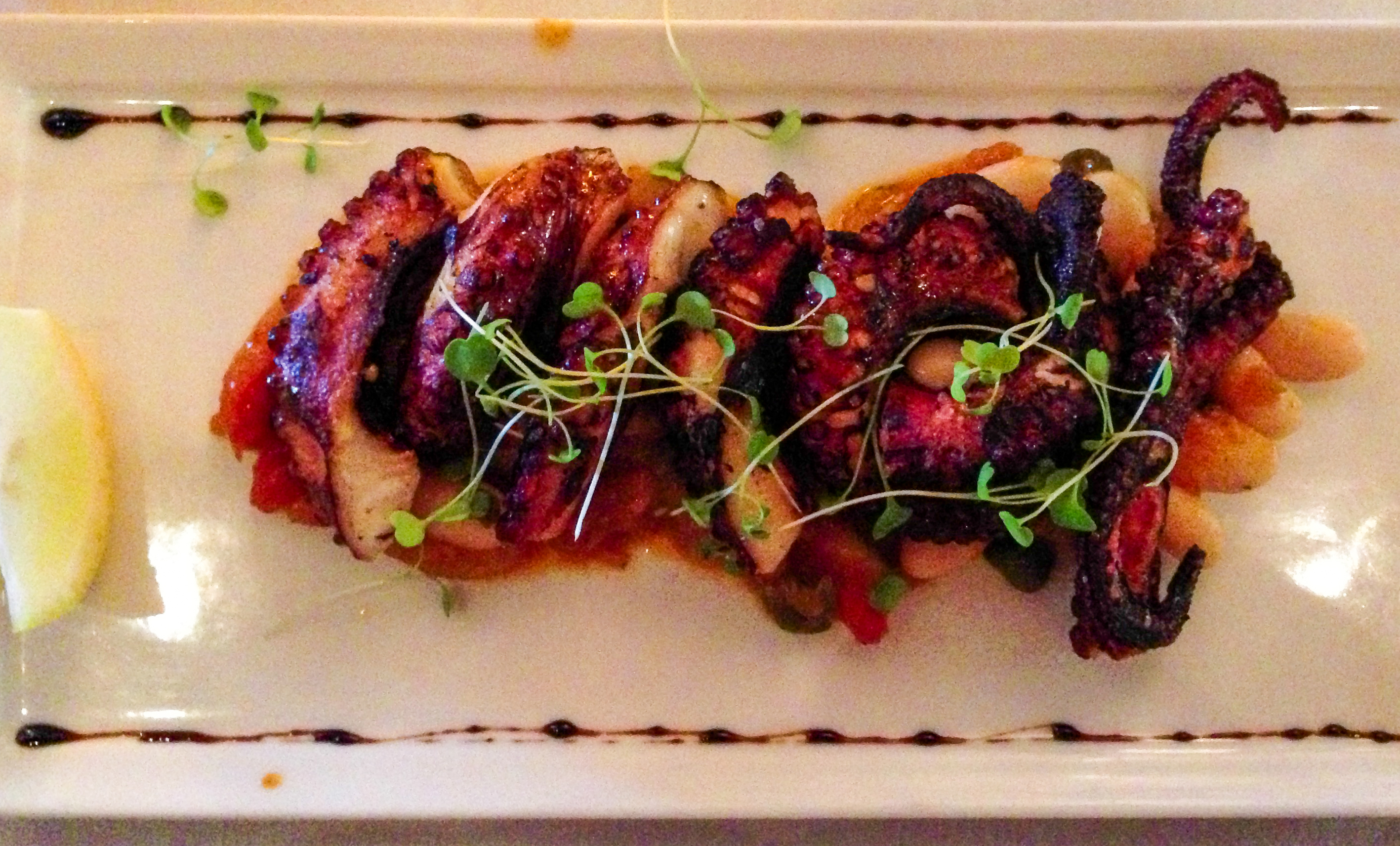 Knowing I had one more meal left in Paso, I paced myself during the afternoon to leave room for a small supper at Il Cortile, an excellent Sicilian-style restaurant downtown. Although there were no reservations available online for that evening, I stopped by shortly after noon and asked the manager if she could fit me in at any time. She gave me a table for one at 5 PM, which worked nicely. It was just enough time and food for a succulent and crispy grilled octopus appetizer, followed by a half-portion of a simple pasta with tomato sauce. The wine was a glass of 2008 Masi Rosso del Veronese, and the Corvino was a good match for both dishes.