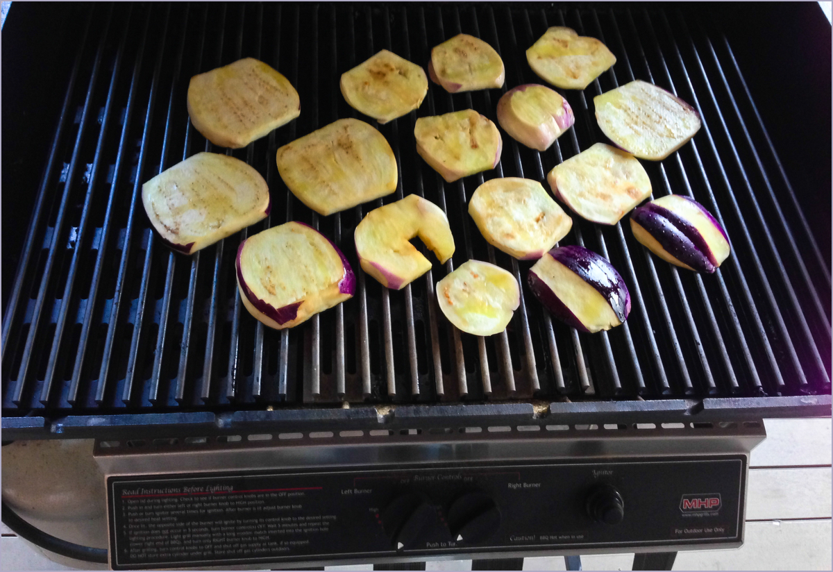 - wipe the eggplant slices dry, brush with olive oil, and grill both sides on the gas grill — not fully cooked but enough to get clear grill marks on the pieces