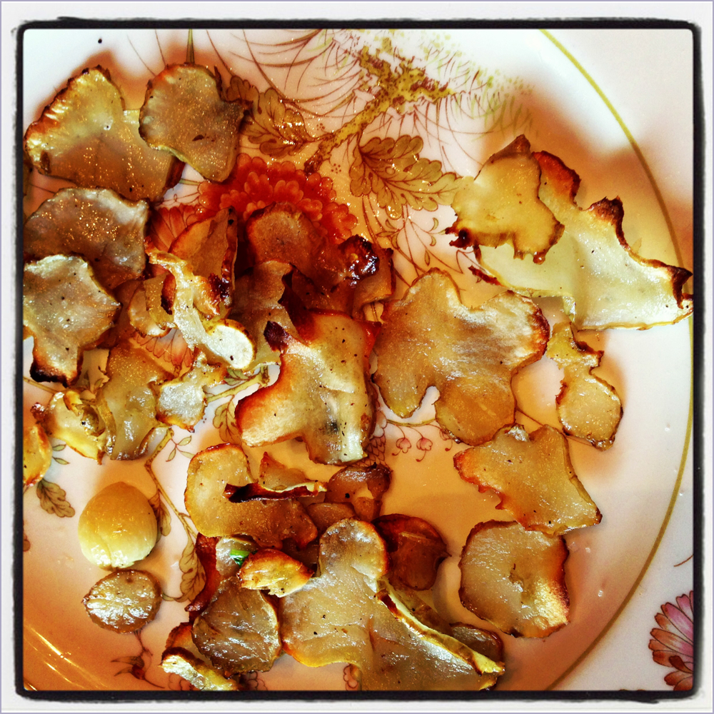 - wash, scrub, dry and thinly slice (on a mandolin) the Jerusalem artichokes