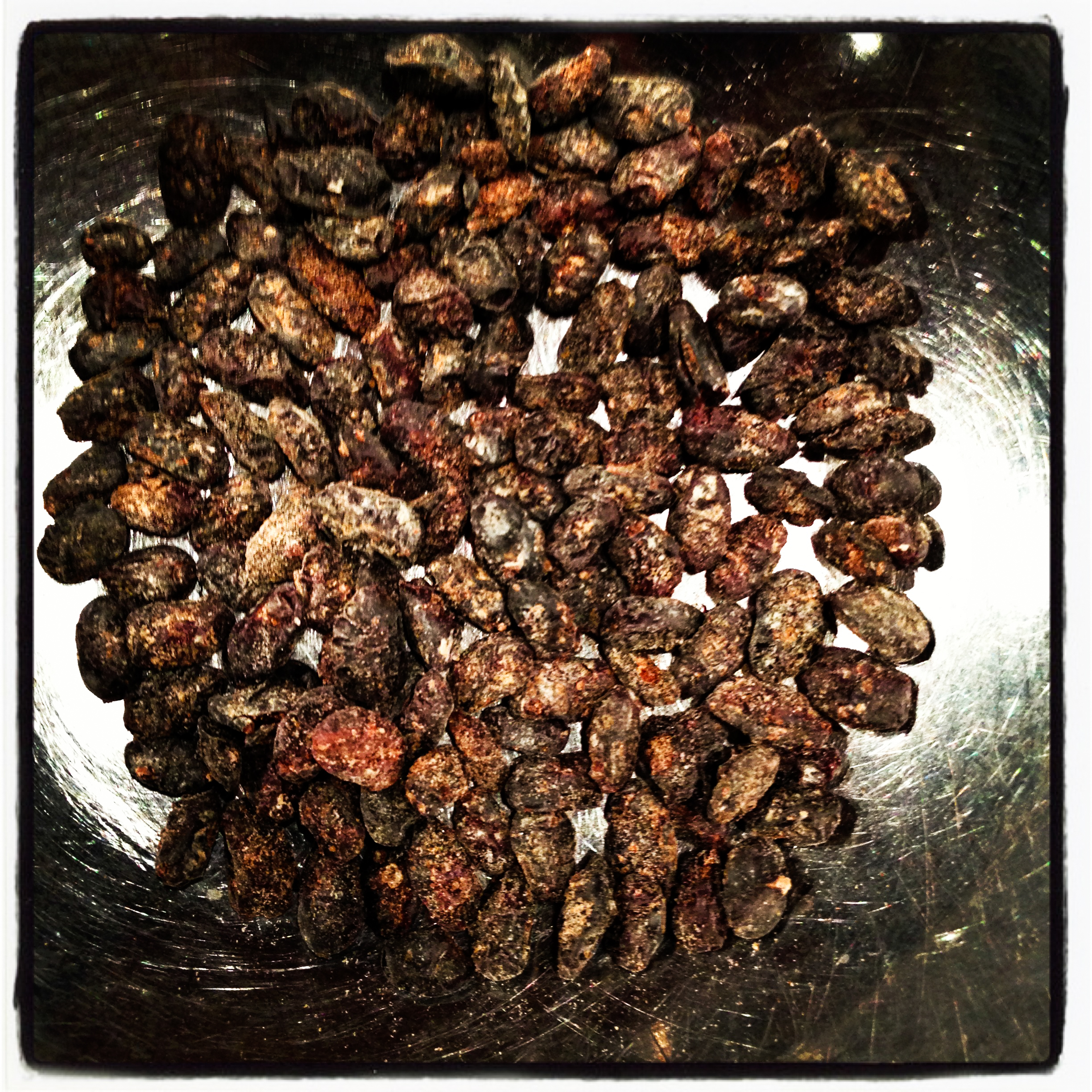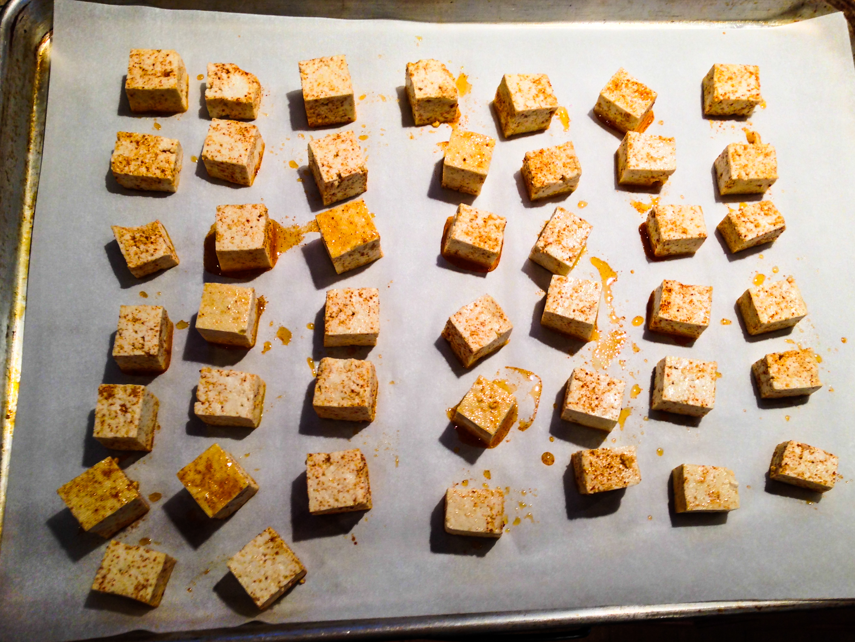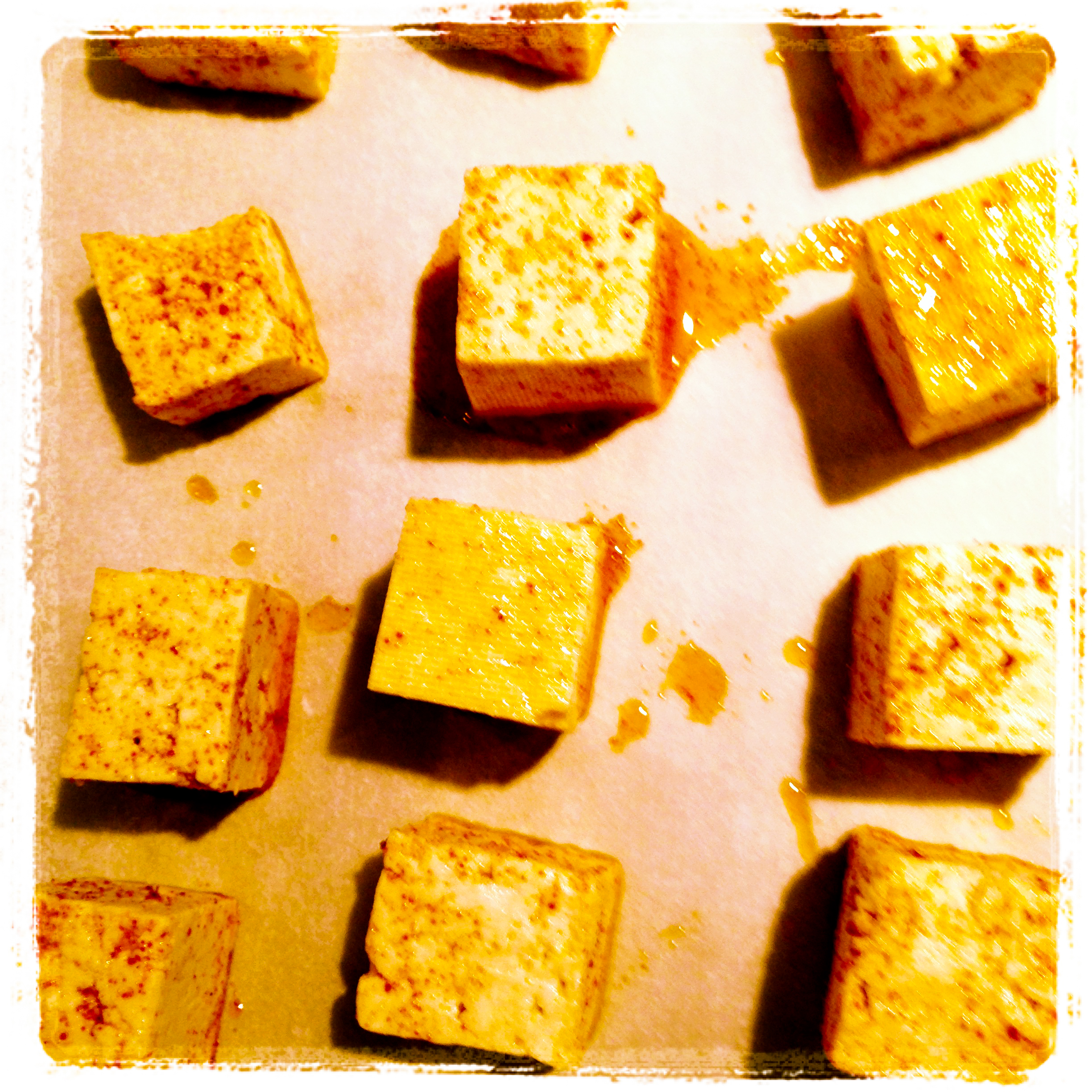 Step number one was to mix a small marinade of salt, olive oil and paprika to coat a pound of tofu cubes, cut from a block of Trader Joe’s organic firm tofu. These were placed on a sheet of parchment paper lining a roasting tray.