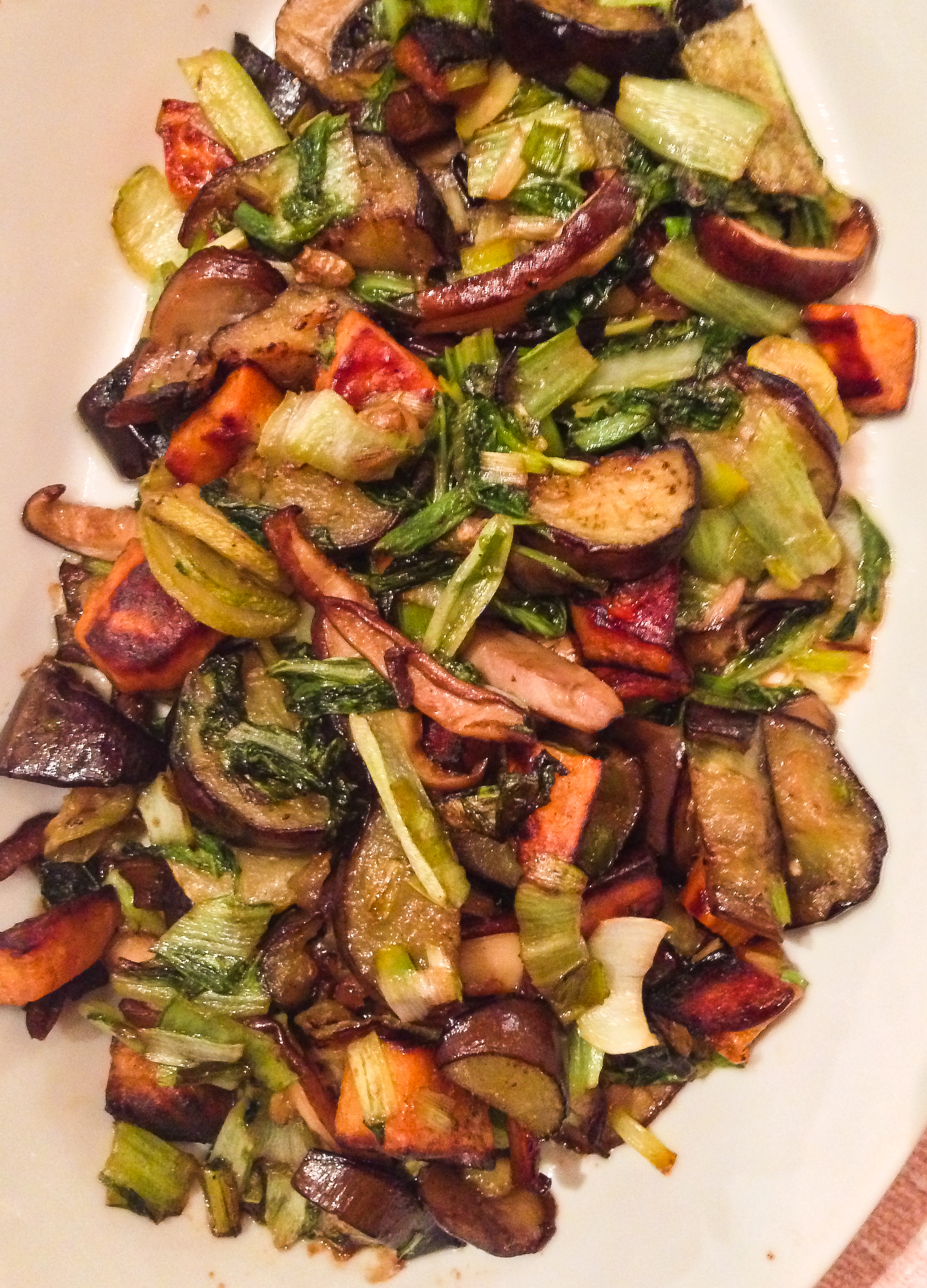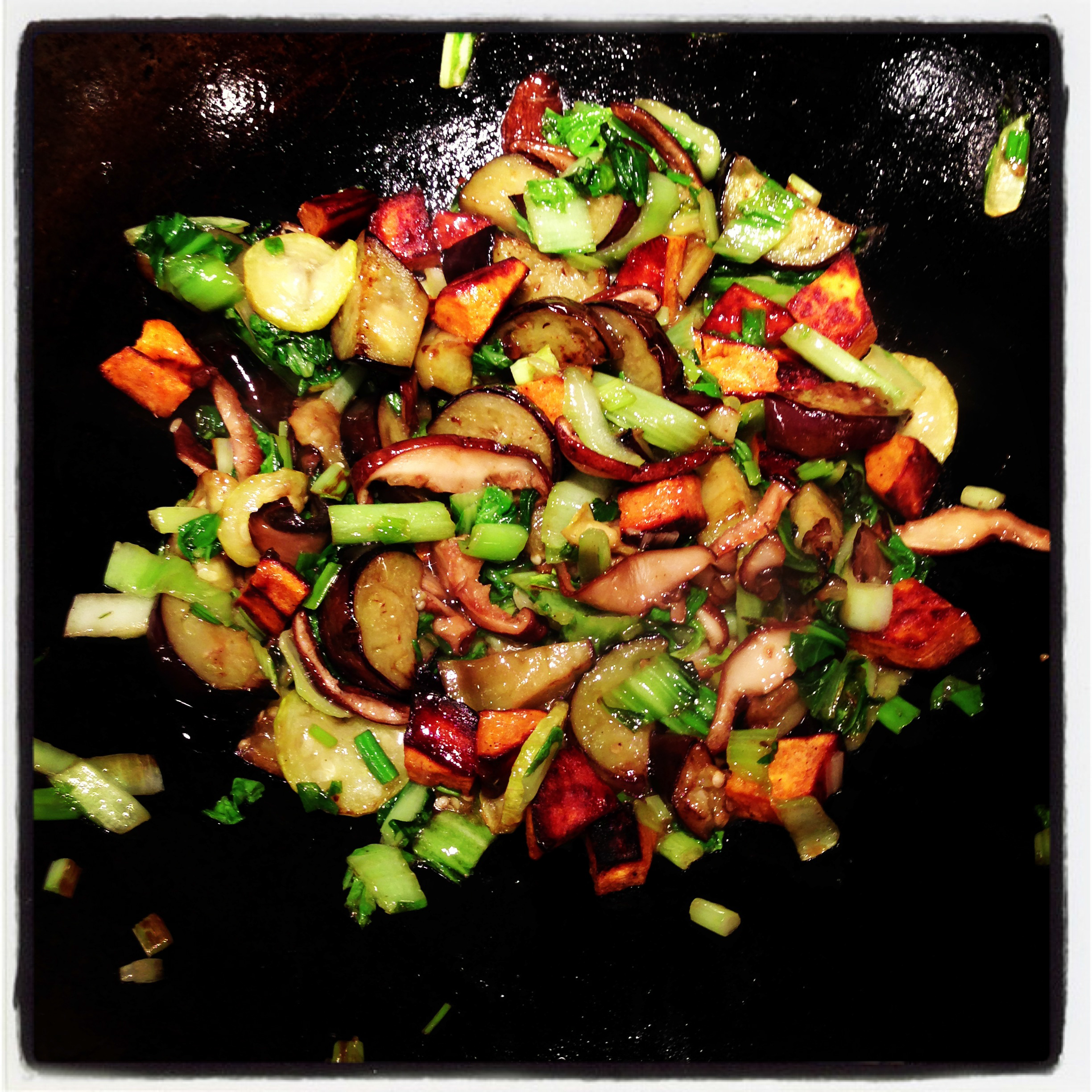 In the meantime I also roasted the sweet potato cubes in the oven. They took a little less time than the tofu and were also turned once. The wok was used to stir fry all the vegetables individually, starting with the garlic and lemongrass, then mushrooms, followed by eggplant, zucchini, Asian greens, and scallions — removing each to their bowls before proceeding to the next one. In the last step I threw all the ingredients of the stir fry into the wok, added a tablespoon of Nama Shoyu (soy sauce) plus some of the arrowroot in water mixture, and cooked a minute or two. Here is the finished product: