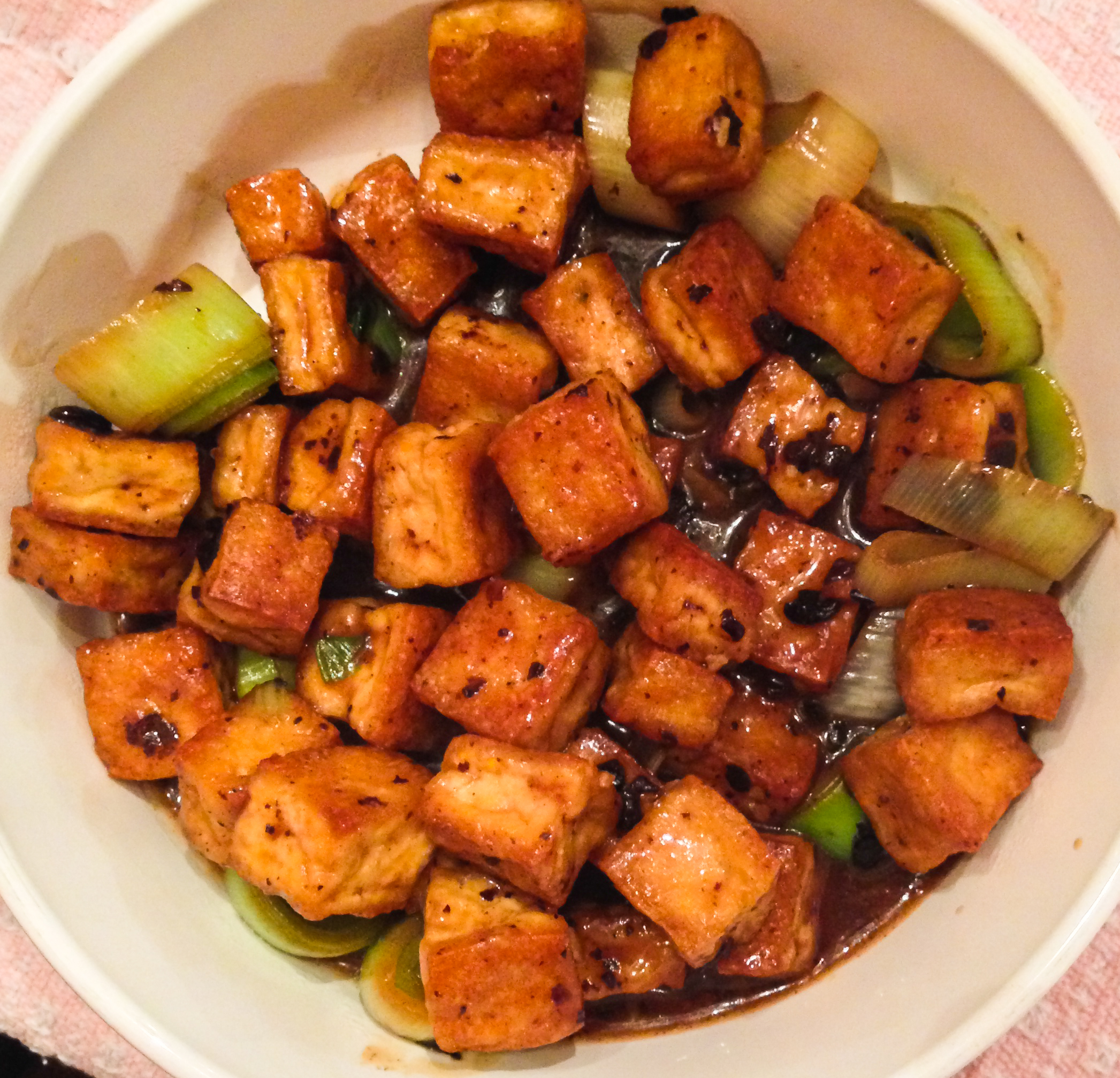 The tofu was then roasted for 30 minutes, turning each piece over once, and set aside. With my favorite wok over high heat, I cooked the fermented black beans and garlic for less than a minute, added the leeks and browned them, added the water and cooked until leeks were tender. Adding the arrowroot and water mixture and cooking that down produced a nice thick sauce, to which the roasted tofu cubes were added.