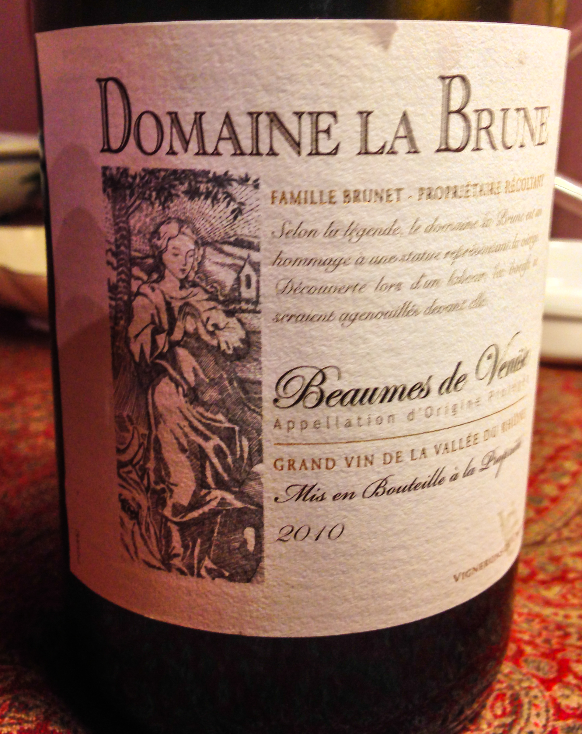 The wine might surprise you. Given the rich flavors of the garlic and fermented black bean sauce and the five spice powder with the sweet potato, I was confident that a dark, rich red wine could work. Once again, I turned to my recent visit to Social Wines, in this case a 2010 Domaine La Brune from Beaumes de Venise. This is a dry Grenache (66%) and Syrah (34%) blend from the Rhône Valley. I had opened the bottle two days before, but decided it did not go with the meal at that time. When I tried it tonight, I was thrilled with how good it was and how well it matched the meal.