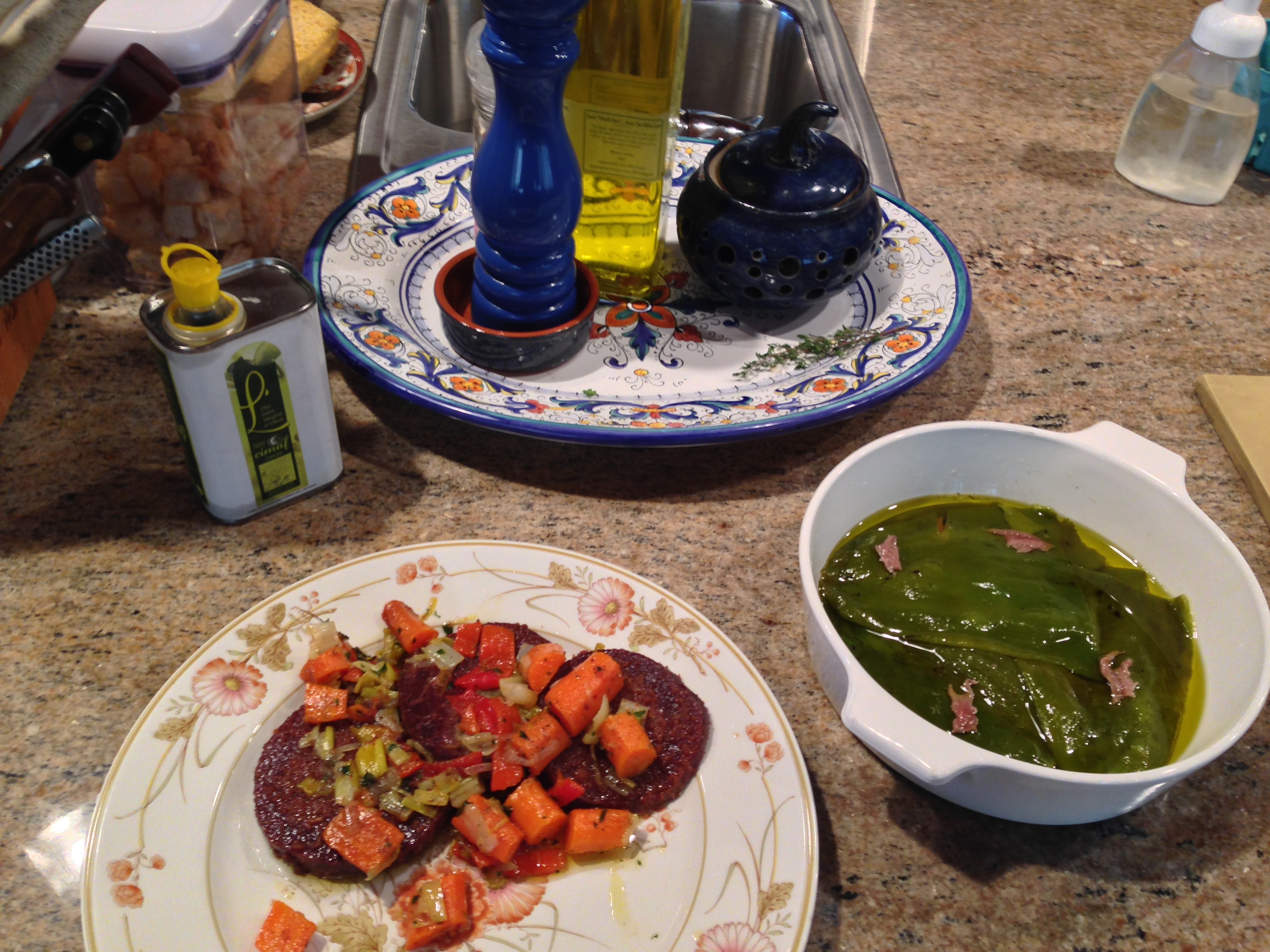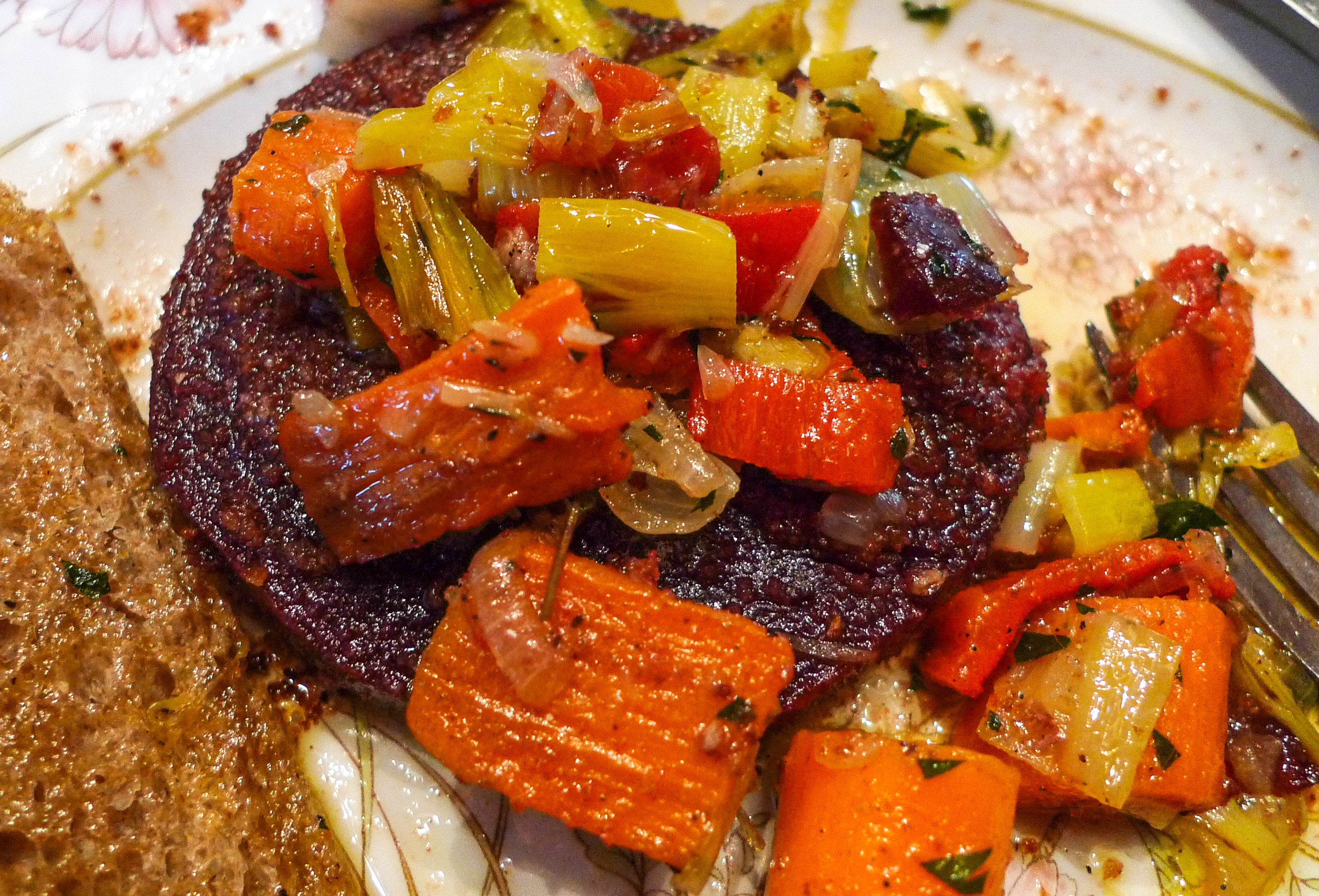 The next step was to use one large, leftover cooked beet. This one was the size of a large russet potato when Lynn dug it out of her garden and bestowed it on us, along with a couple of smaller ones. It was so big that I needed to use a 4-quart pot to cook it and keep it under water. Anyway, I recently read a cookbook in which the author cut thick slices of beet, coated with bread crumbs and fried it like a cutlet. So I cut 3/4″ slices, coated with salt, pepper and olive oil, dipped in bread crumbs and sautéed the slices — sort of filets de Beet (as opposed to Boeuf). Then I added some of the leeks, several pieces of leftover carrots I had braised in olive oil and herbs the night before, one filleted salt-packed Sicilian anchovy dissolved in warm olive oil, and the last special ingredient.