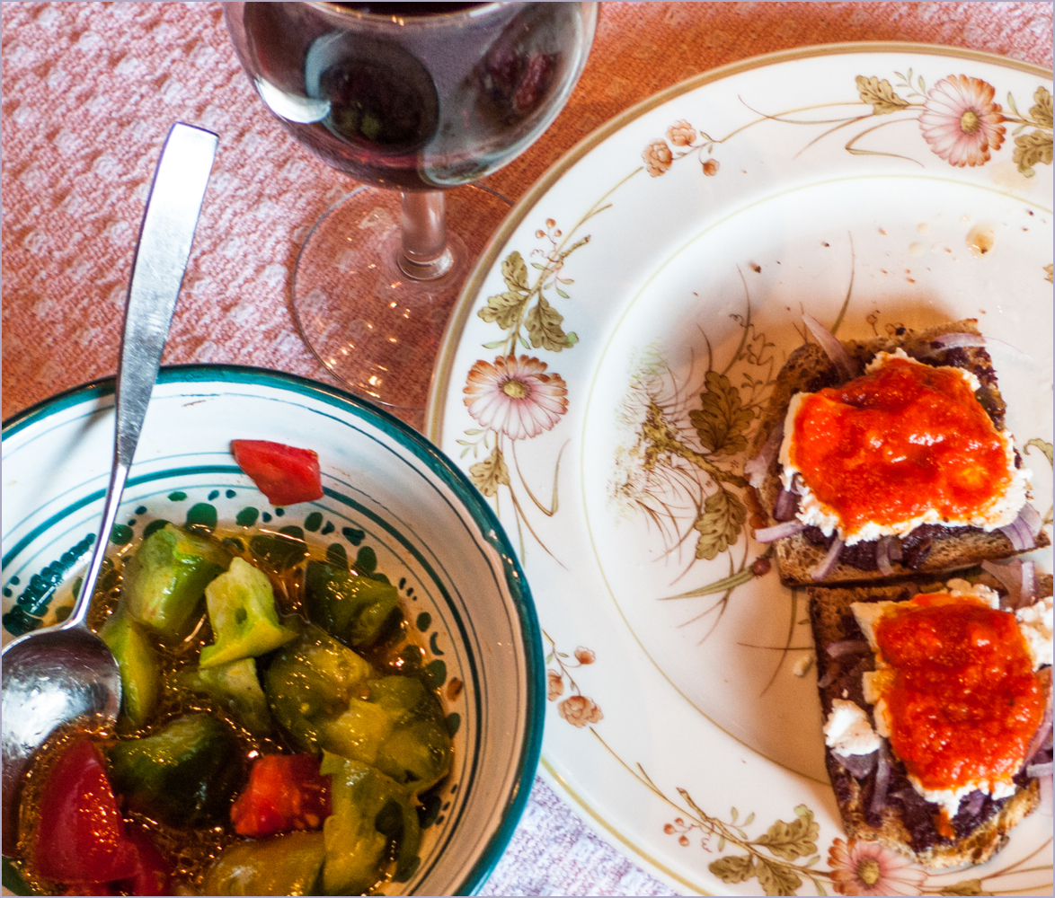 Tuesday lunch featured farmers market wonders such as heirloom tomatoes and fresh goat cheese, topped with red pepper purée on open-faced sandwiches on my whole grain toast. A touch of pimenton, along with the oil and vinegar, salt and pepper livened up the tomatoes.