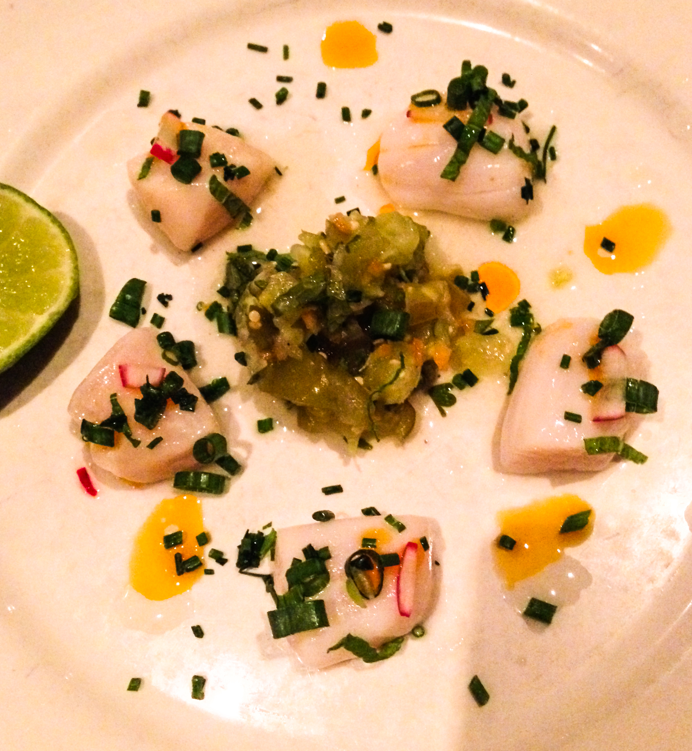 My dinner consisted of a cocktail (“Nehru” — made with house-infused Saffron Gin), followed by four dishes and a terrific glass of wine: