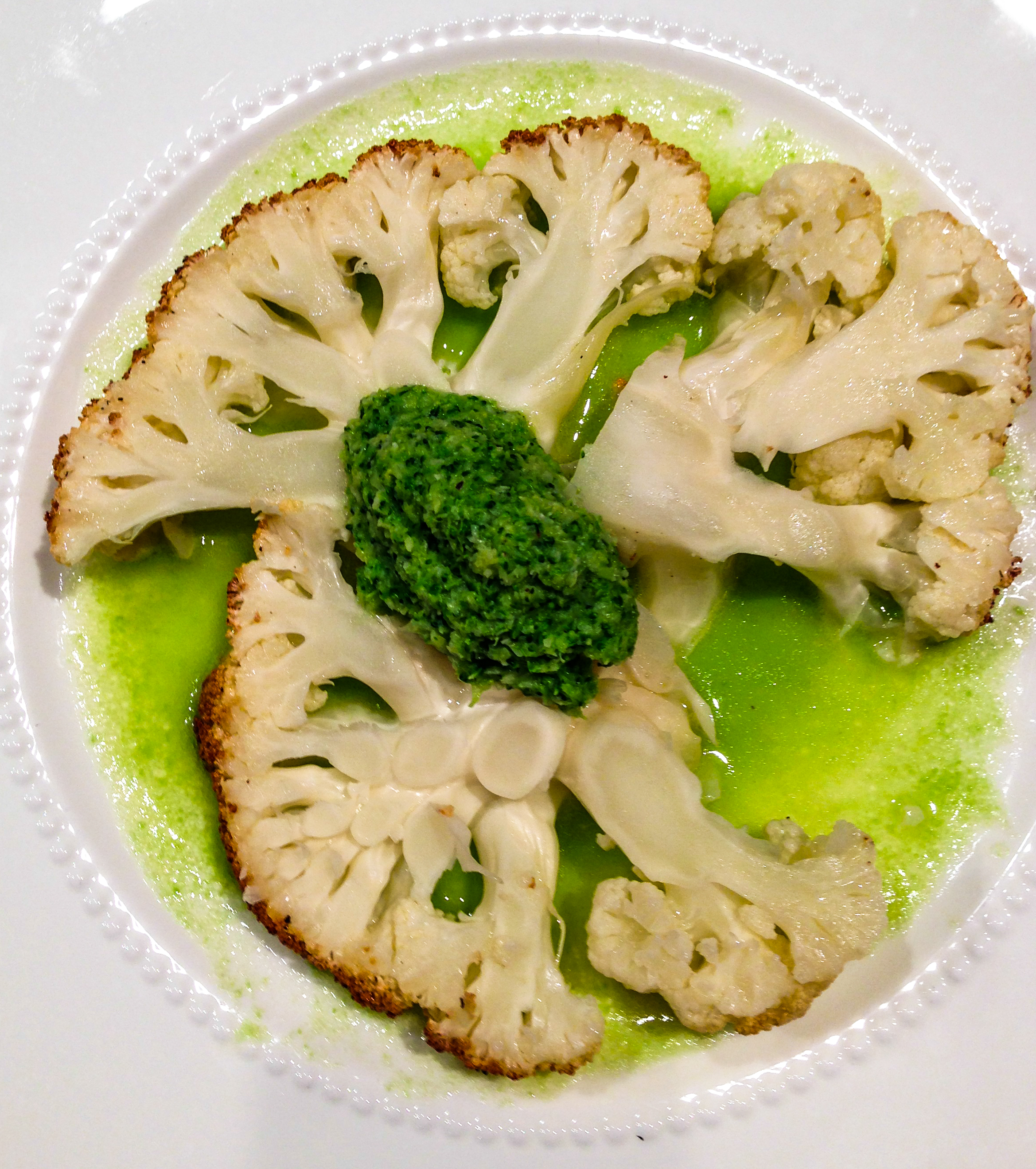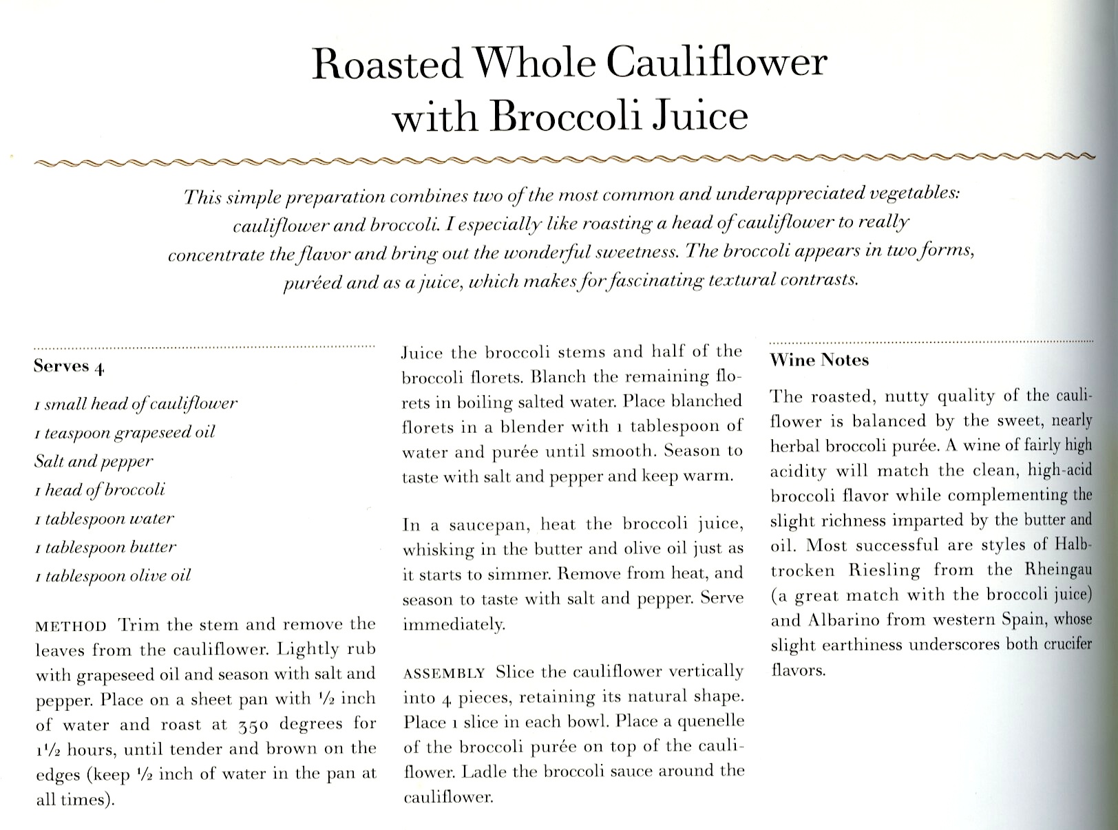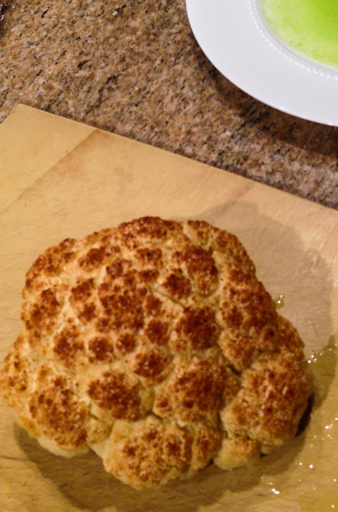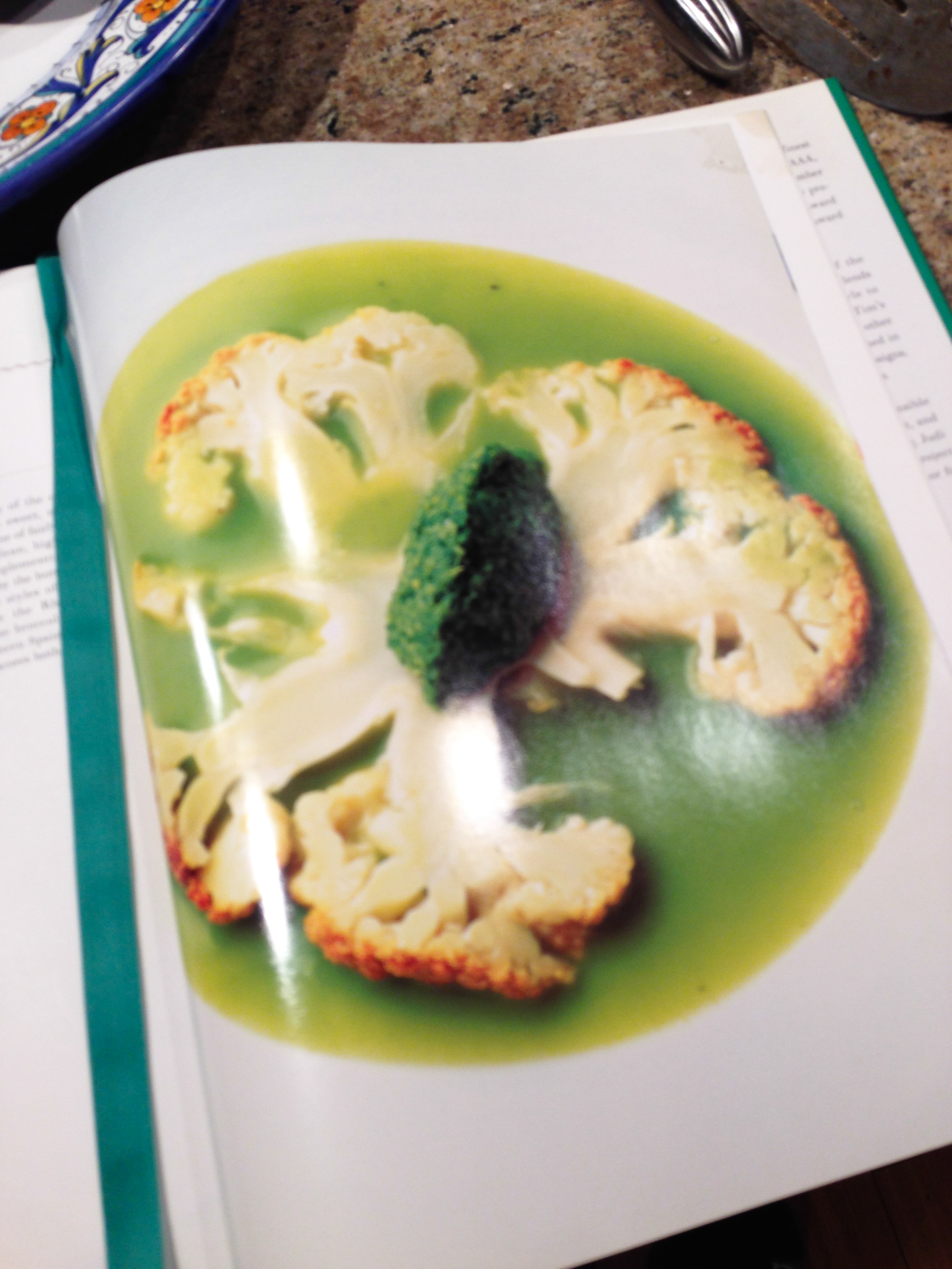 One of the recipes that caught my eye was “Roasted Whole Cauliflower with Broccoli Juice”. It was much less complicated than many others, and it was visually attractive.