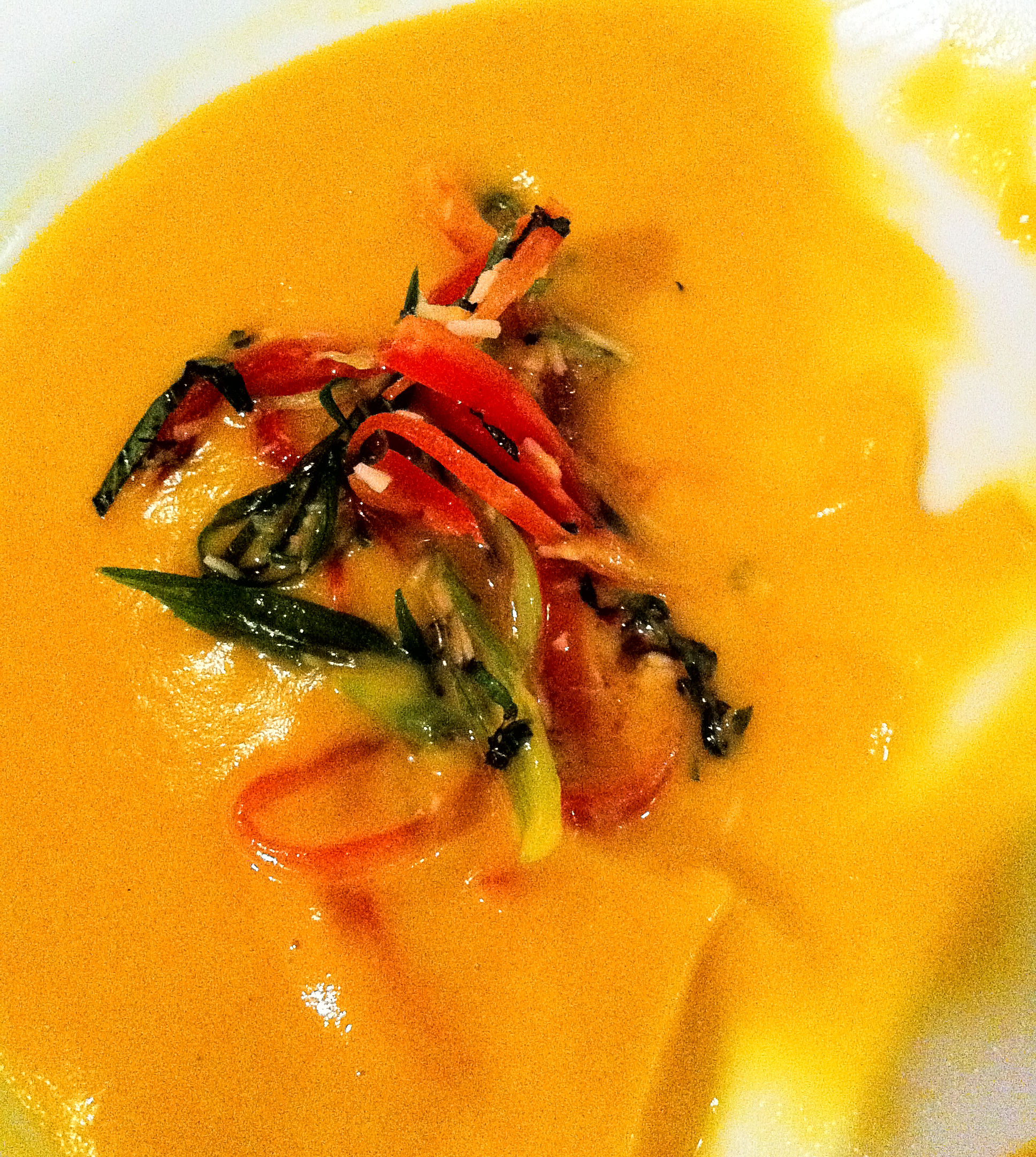 While we’re on the Dining Out theme, I wanted to mention a particularly good soup I had at lunch at EVOO in Cambridge while discussing a project with one of my grad students. The dish was a Thai Curry Sweet Potato Soup made with Coconut Milk. It also provided a lovely picture to share with you.