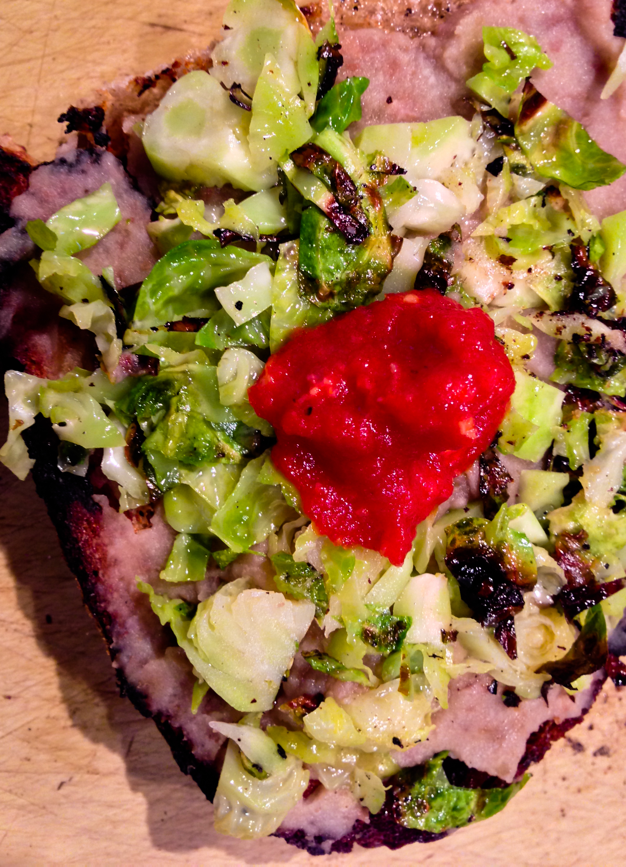• chop or thinly slice some of the brussels sprouts and heat a little of the concentrated tomato sauce you made last night