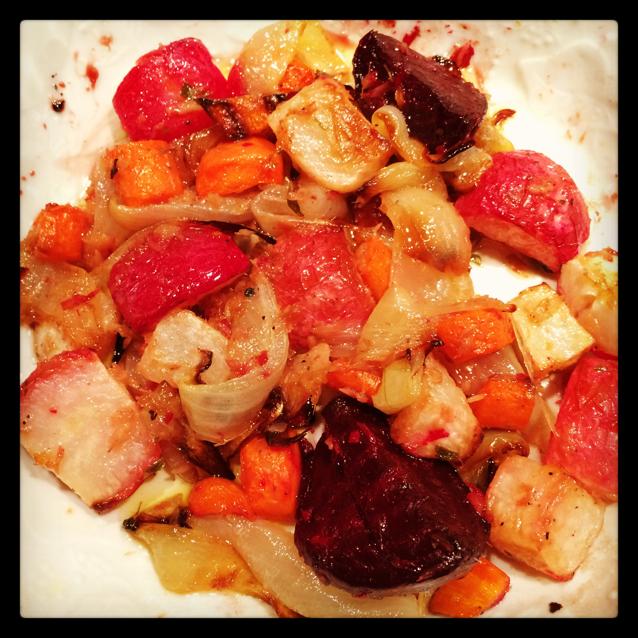 • roasted root vegetables with a horseradish-thyme vinaigrette (see this recent post)