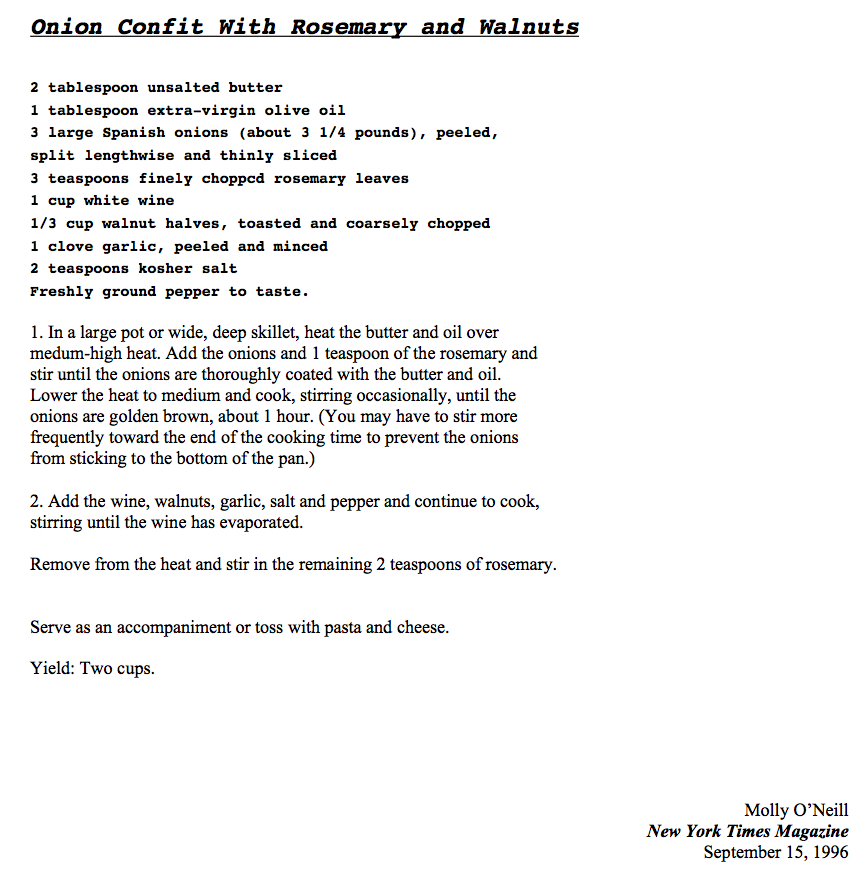 And so it was that almost exactly a year to the day, tonight we decided to have the same Ligurian vegetable soup we had a year ago. Same deal: I picked the recipe, and Barbara executed it to perfection. There were four minor variations: (1) she was too lazy to add the porcini mushrooms and soaking liquid for the extra depth of flavor, (2) we did not bother to make croutons, (3) we used Swiss chard instead of kale, and (4) I was in possession of two superb Ligurian wines to accompany the dish, thanks to my recent association with Social Wines of South Boston. The net effect was still a very satisfying dinner, supplemented ever so slightly by a small quantity of Spaghetti with Onion Confit with Rosemary and Walnuts Sauce, from a New York Times recipe by Molly O’Neill in 1996. I provide both recipes for you below for convenience. The photo of the soup is last year’s version, with peas and croutons, but this year’s was almost as good, and featured Ligurian olive oil, too.