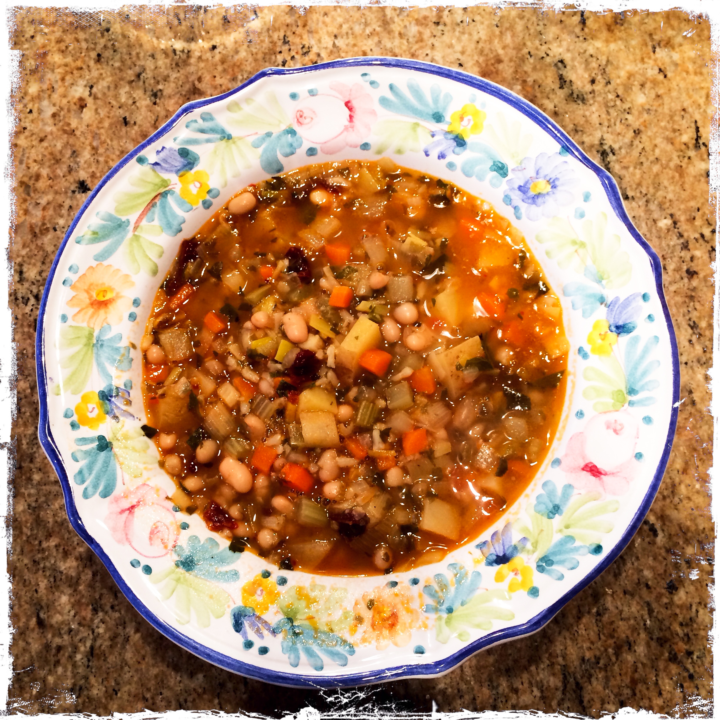 One of the important survival skills has to do with — what else? — food. A day like this just screams out for a comforting soup. And boy, do I love making, and eating, soup. Today’s version has no name, but you can think of it as essentially northern Italian with whatever I can find in the refrigerator and pantry. (This is not a day to go grocery shopping.) The ingredients go cheerfully into my new Emile Henry fig-colored dutch oven. Those ingredients enter the pot in stages, cooking on medium heat in each stage: