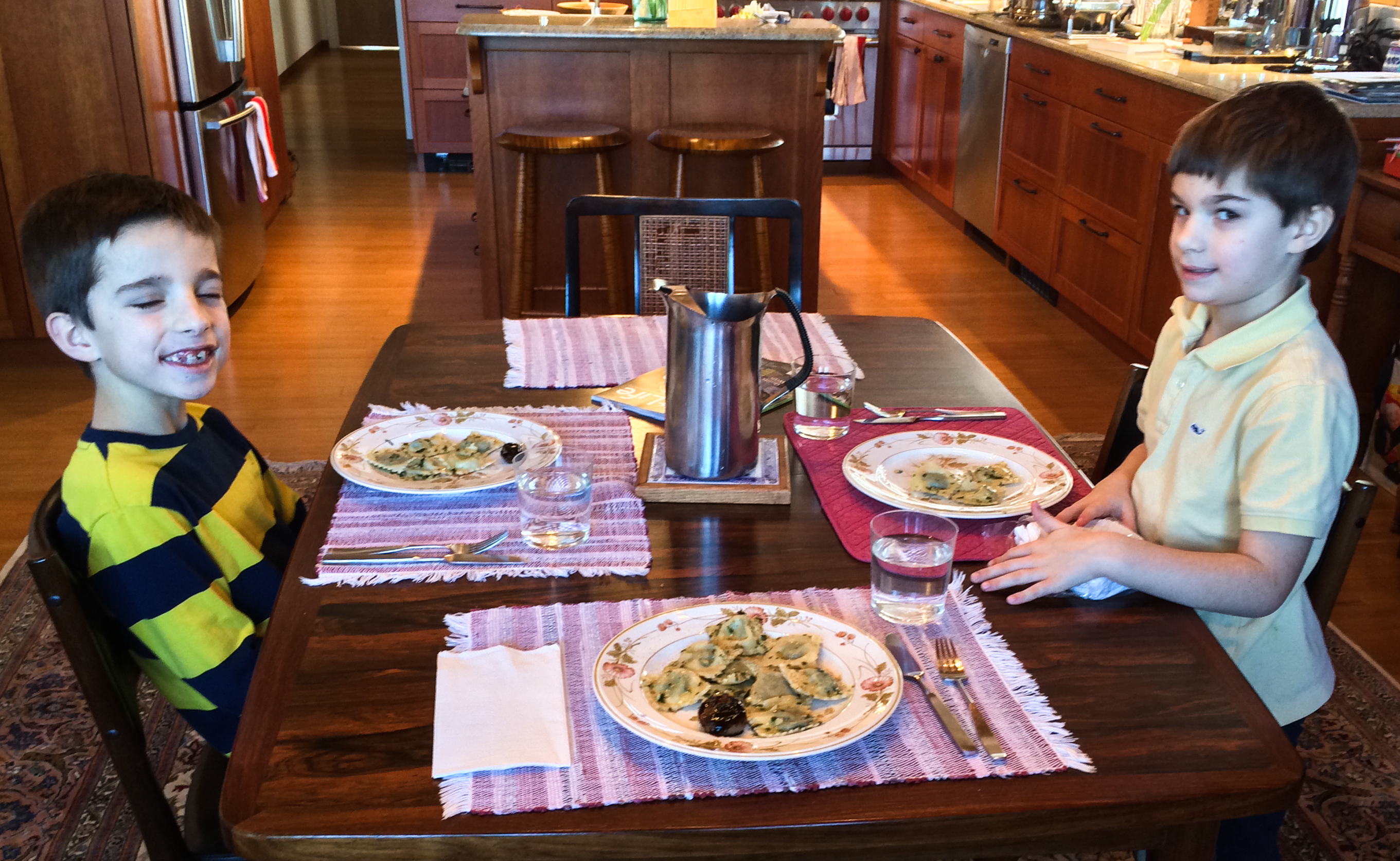 It was 1º F. when we woke up yesterday morning. Sarah and Nathan were dropping the D boys off at our place at 9 AM, and I had the pleasure of keeping them busy for the next 4-5 hours, until Barbara returned. Given the temperature, I quickly scrapped the idea of going sledding with them, and instead, decided to make ravioli from scratch. This would occupy almost 3 hours, provide lunch for us all, and be in my comfort zone for sure.