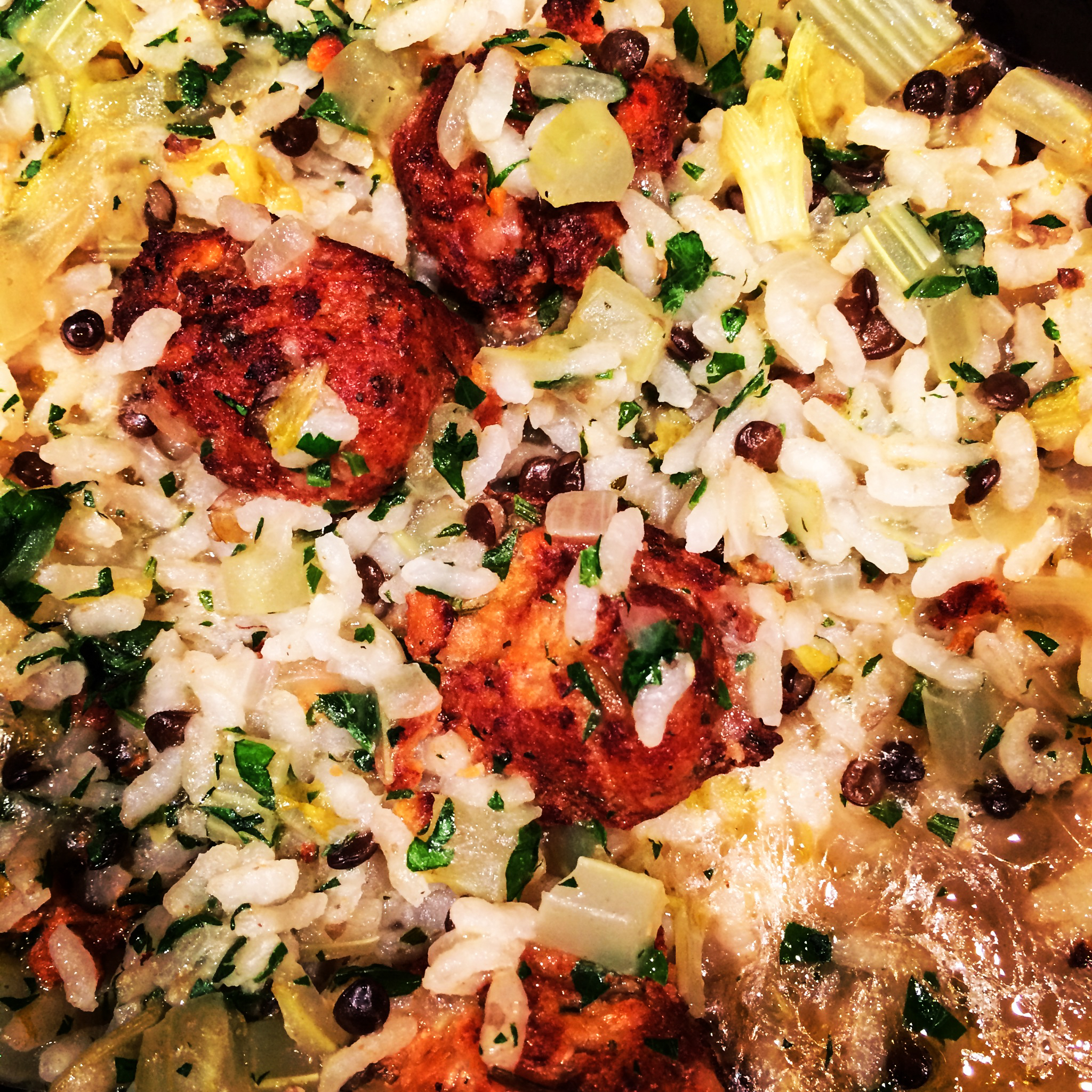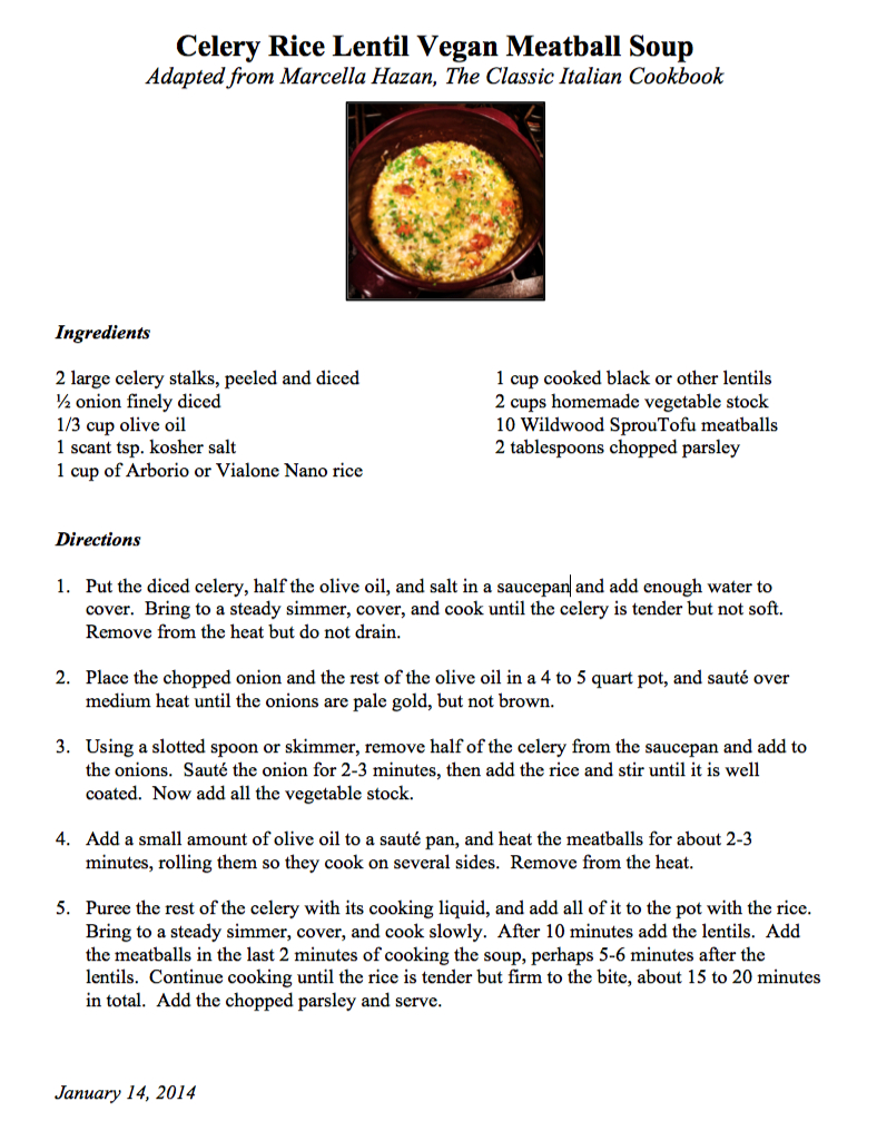 Once again I acknowledge my debt to Marcella. Her Rice and Celery Soup on page 62 of The Classic Italian Cookbook was the inspiration for tonight’s dinner. Furthermore, her menu suggestions at the end of the recipe mentioned following the soup with a dish of meatballs, and as luck would have it, I had just purchased a new package of a vegan version made from sprouted tofu, which I was eager to try. Finally, since I had some leftover cooked black lentils and was planning on serving that somehow with rice soon, I decided to put them all together in this soup.