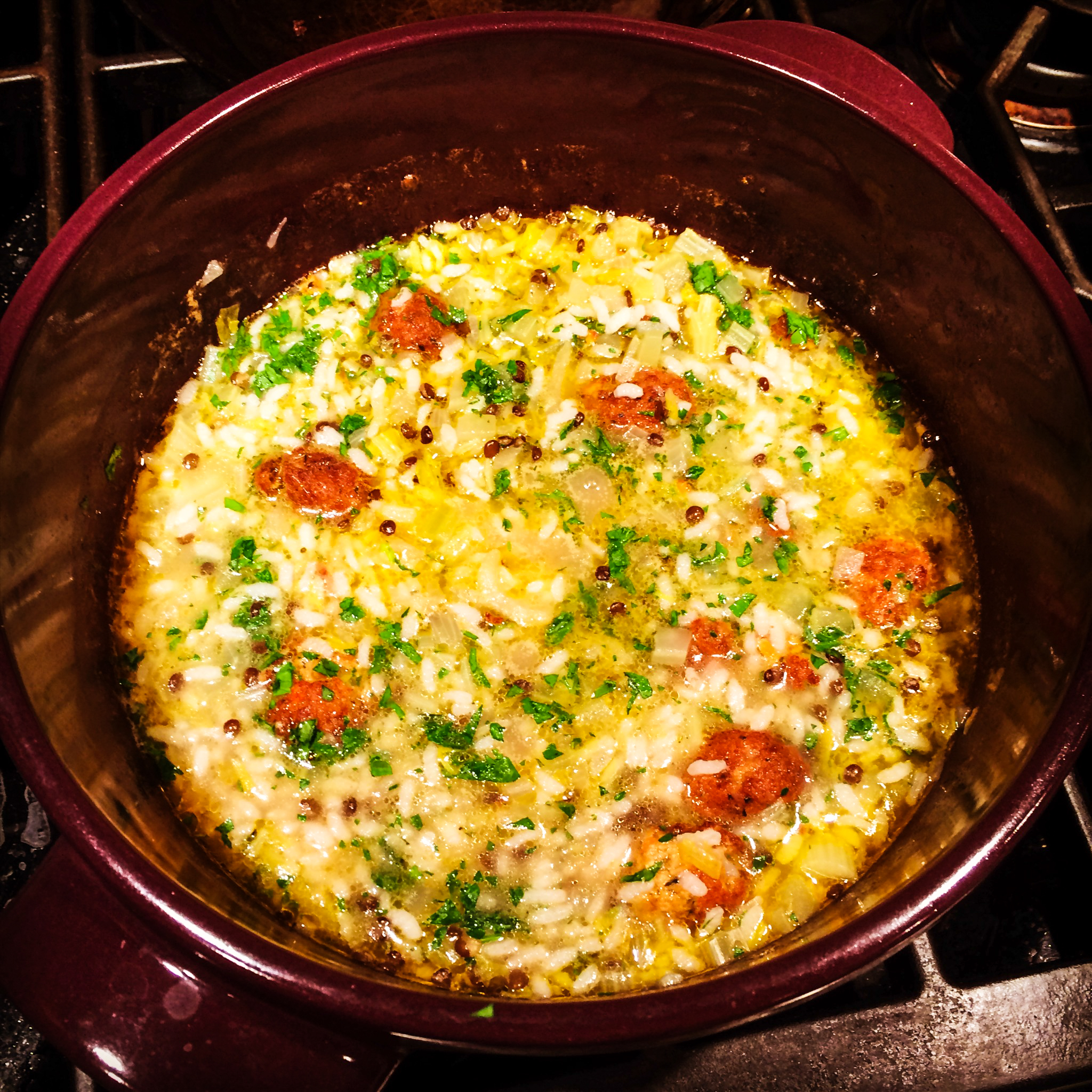As Adam (at the health food store had predicted) the texture and flavor of the meatballs were astonishingly good, and they were a little bit salty, so I adjusted the salt downward in the rest of the soup accordingly. The dish was terrific.