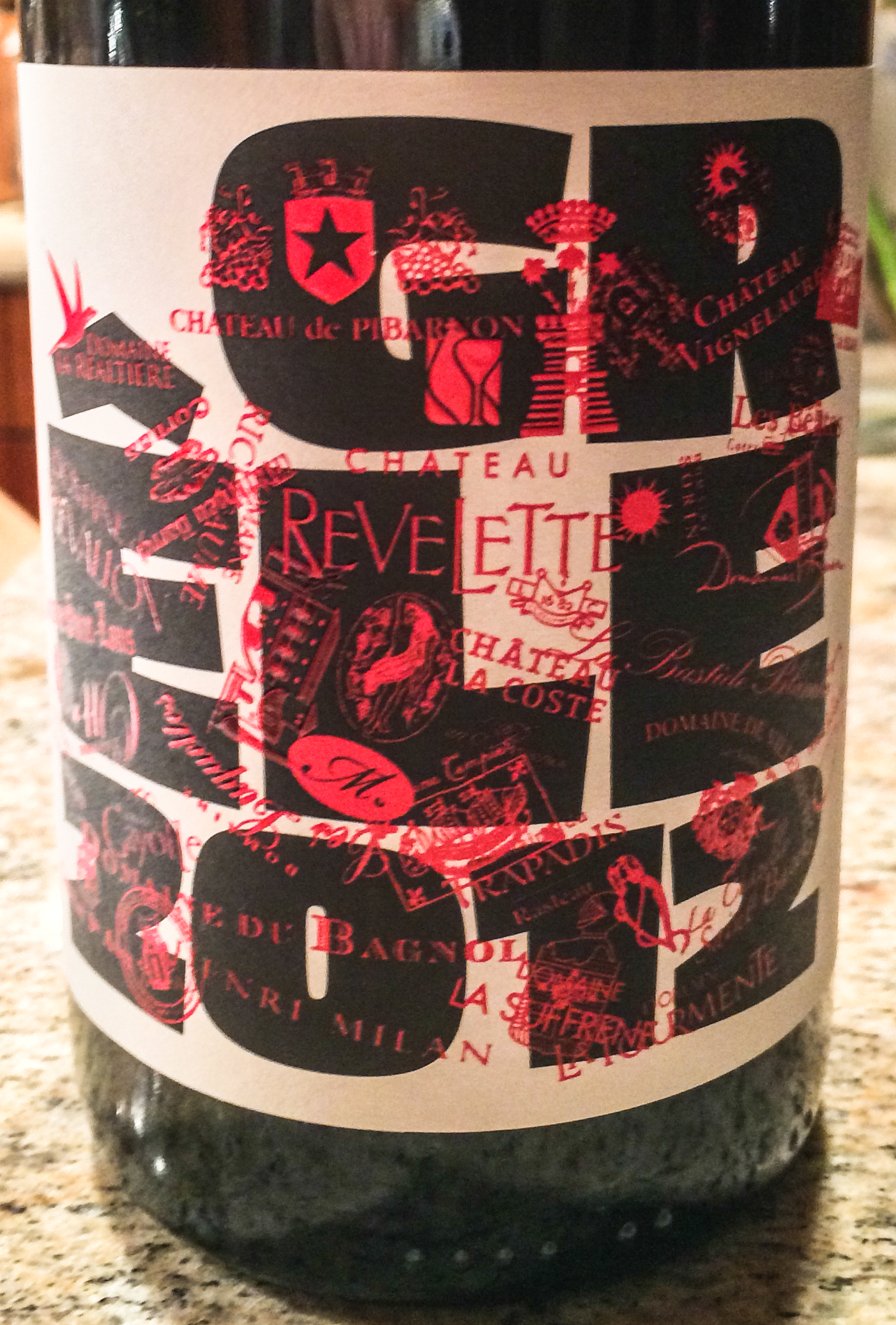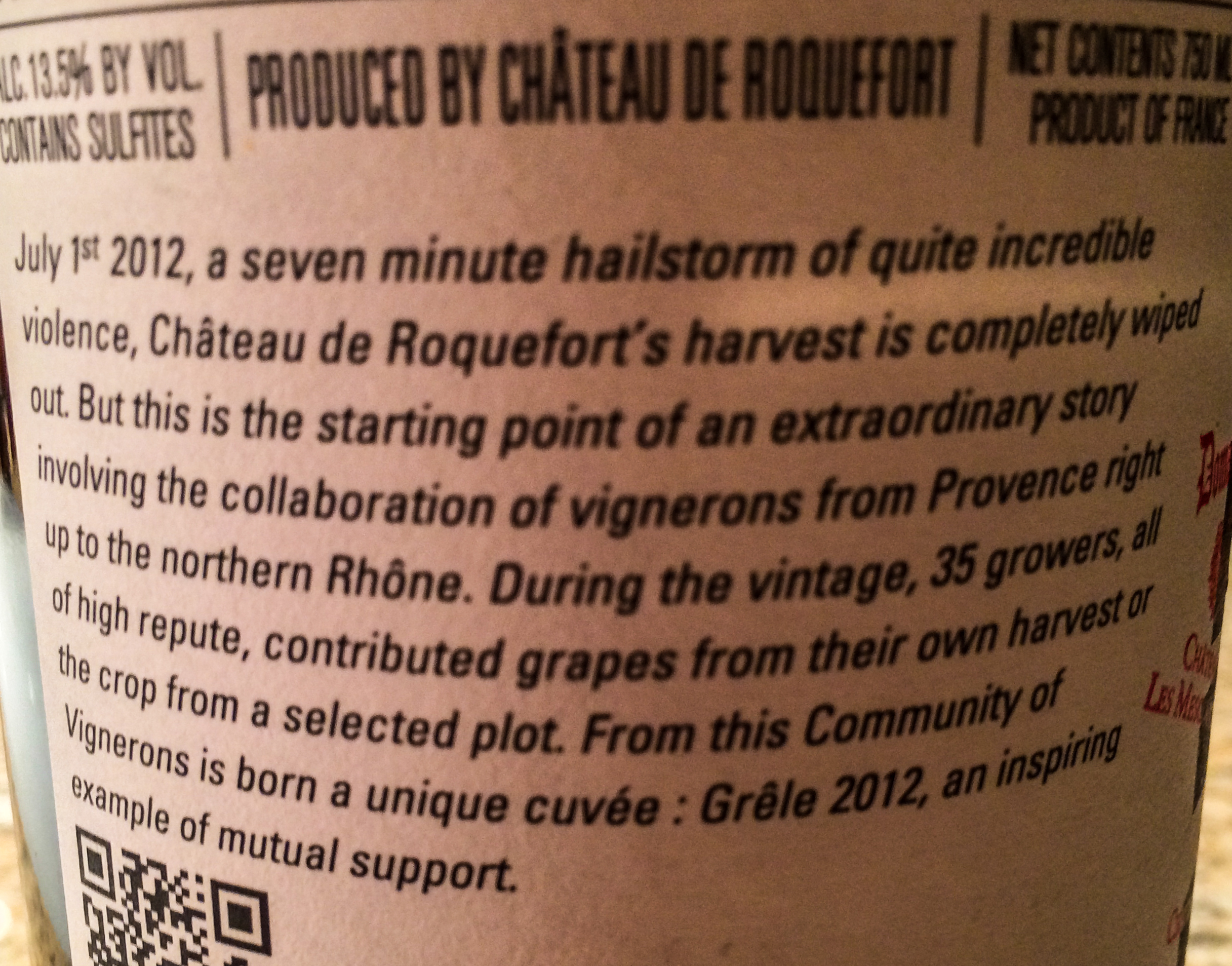 I feel these vegetables were indicative of the south of France or a good bit of Italy. So for a wine, I decided to go with a bottle 0f 2012 Grêle, from Château de Roquefort in France. Please read the back label for the remarkable story of this wine. Oh, yes, it was delicious. And will never be replicated, because — due to its origins — no one knows the actual blend of grapes that made it.