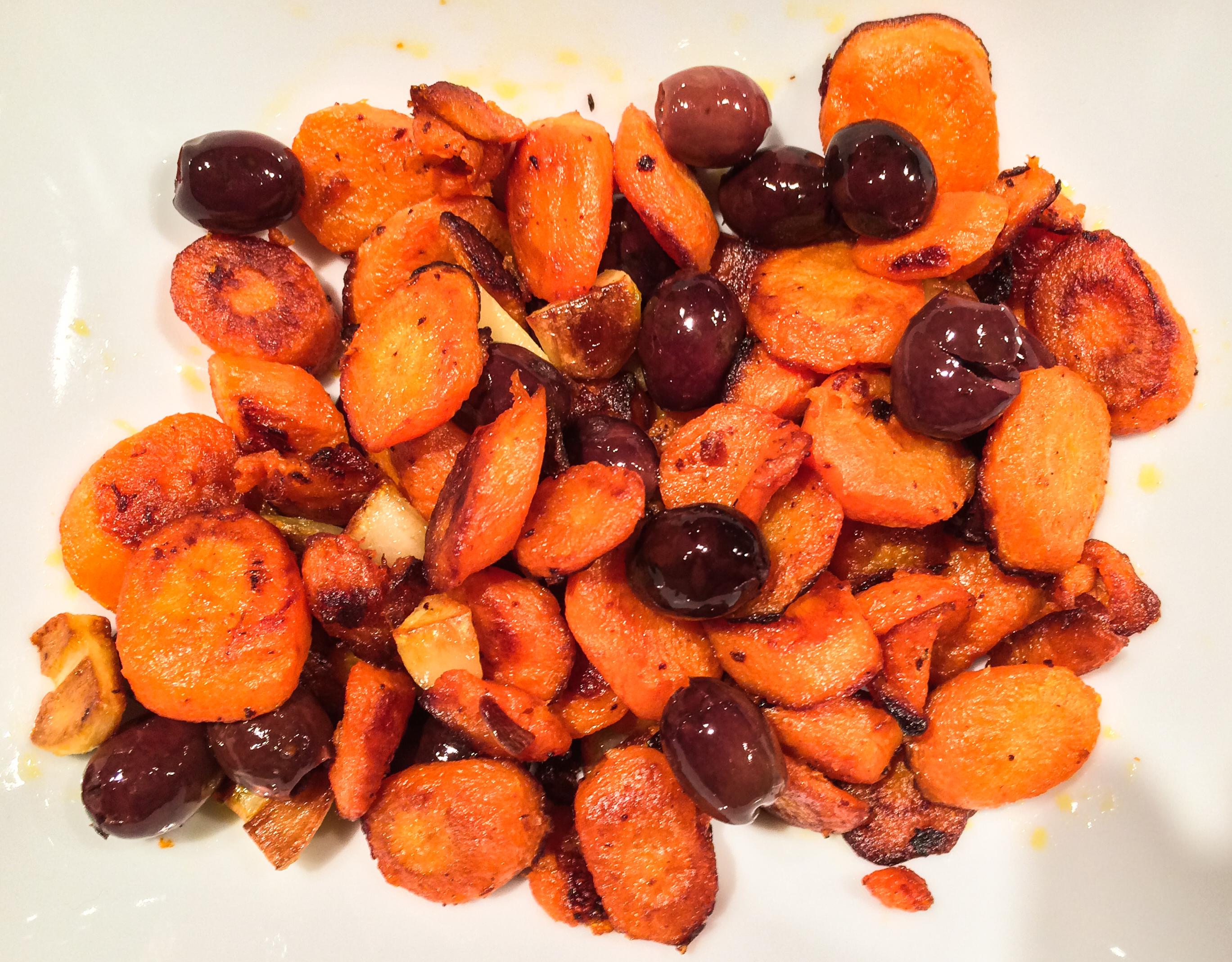 I opened a bag of organic baby spinach, and added a small amount of olive oil to the pan from the carrots. Cover and sauté/steam until just wilted. Serve.