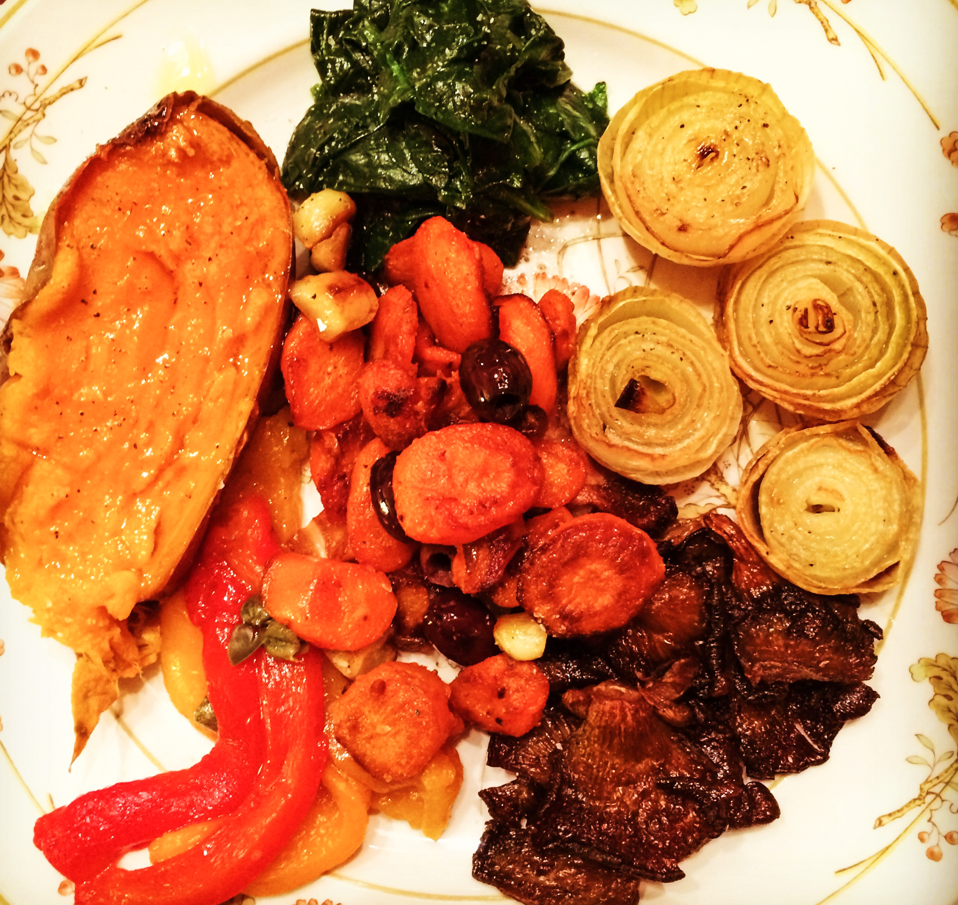 My passion du moment is roasting vegetables, and this time of year there are so many good choices. Last night’s dinner was a medley of some of my favorites: