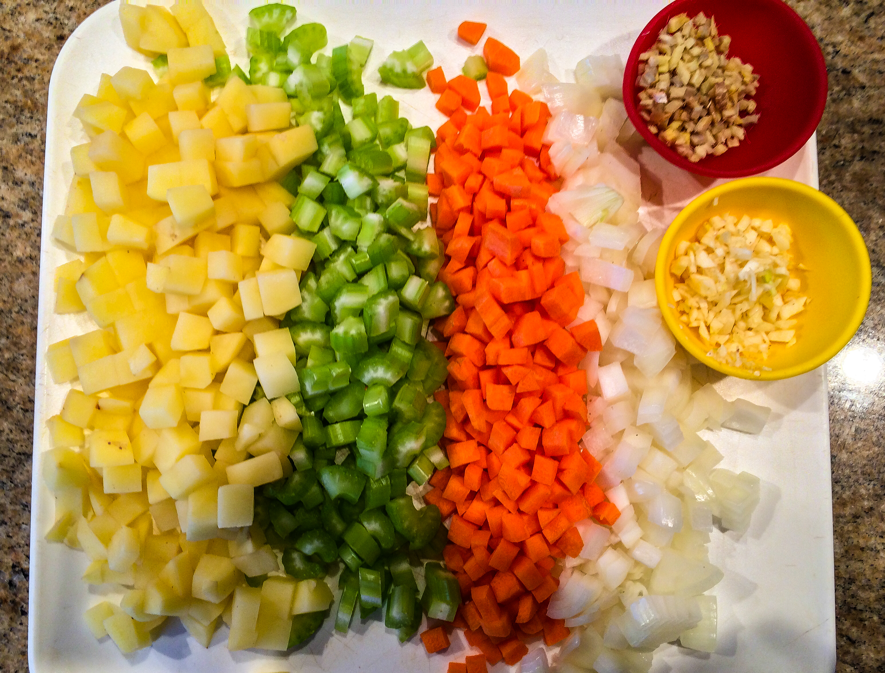 Barbara made a very good and healthy soup using primarily red lentils, other vegetables, and lots of fresh ginger.  I learned it was in process when I saw the prep work all done on the counter (except for the lentils, which were still in a jar):