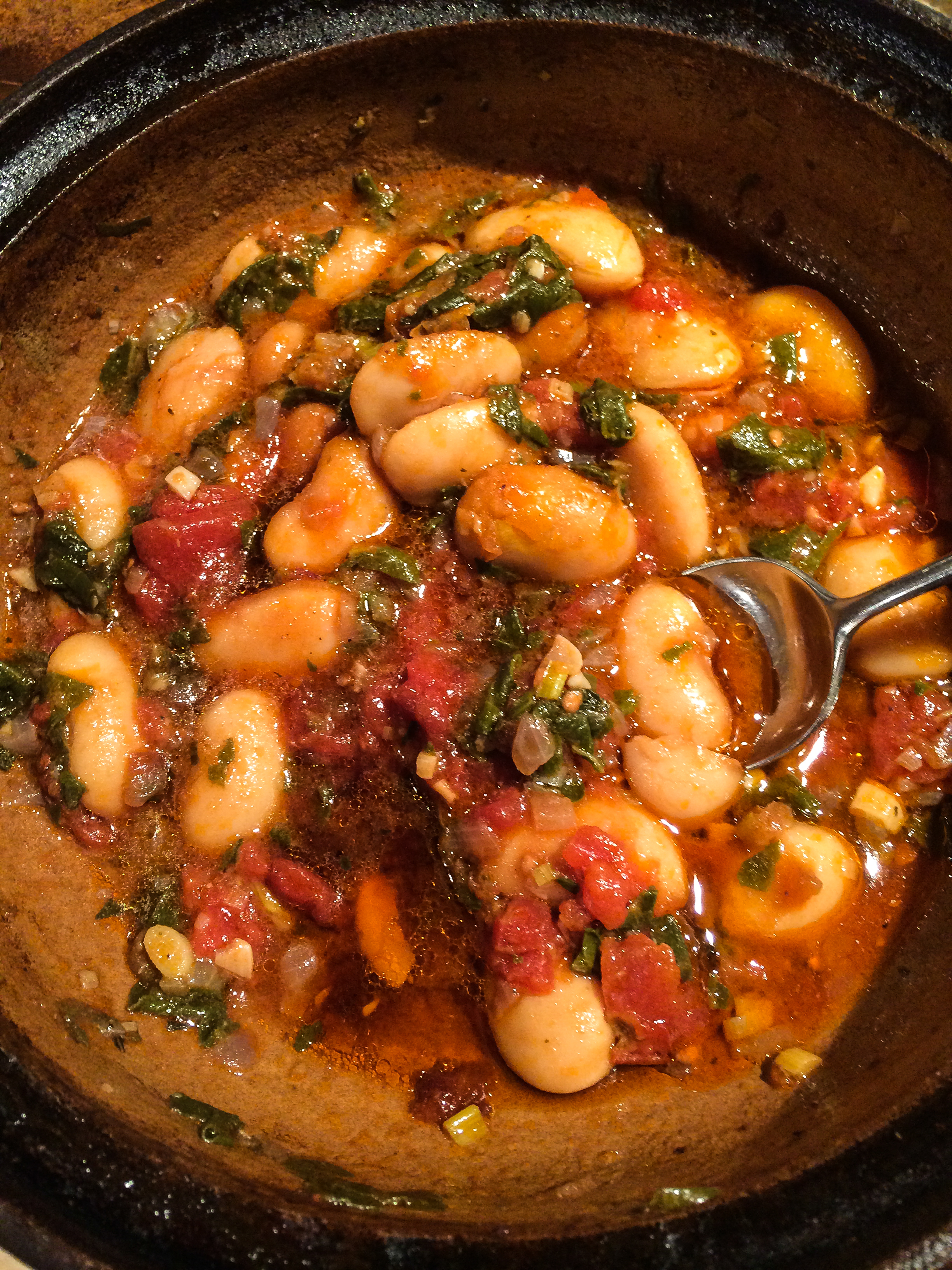 The dish proceeded simply enough. Preheat the oven to 350º F. Sauté the onions, garlic, and green garlic until tender. The ideal pot for this is a heavy clay one with a good cover, which fortunately we have because we bought it from a potter many years ago. Just when the garlic starts to color, add the white wine and cook until it has mostly evaporated. Add the cooked beans, Swiss Chard and tomatoes, salt and pepper, and the Maras (or Aleppo) pepper. Cayenne can work here instead, if you prefer. Bring to a steady simmer, cover, and put in the oven for 1.5 to 2 hours, until the beans are smooth and creamy, and the vegetables have melded together. You may need to add a little liquid if it gets too dry, but I found that the tomatoes and their juices (along with a tight pot cover) kept everything nice and moist. It was delicious.