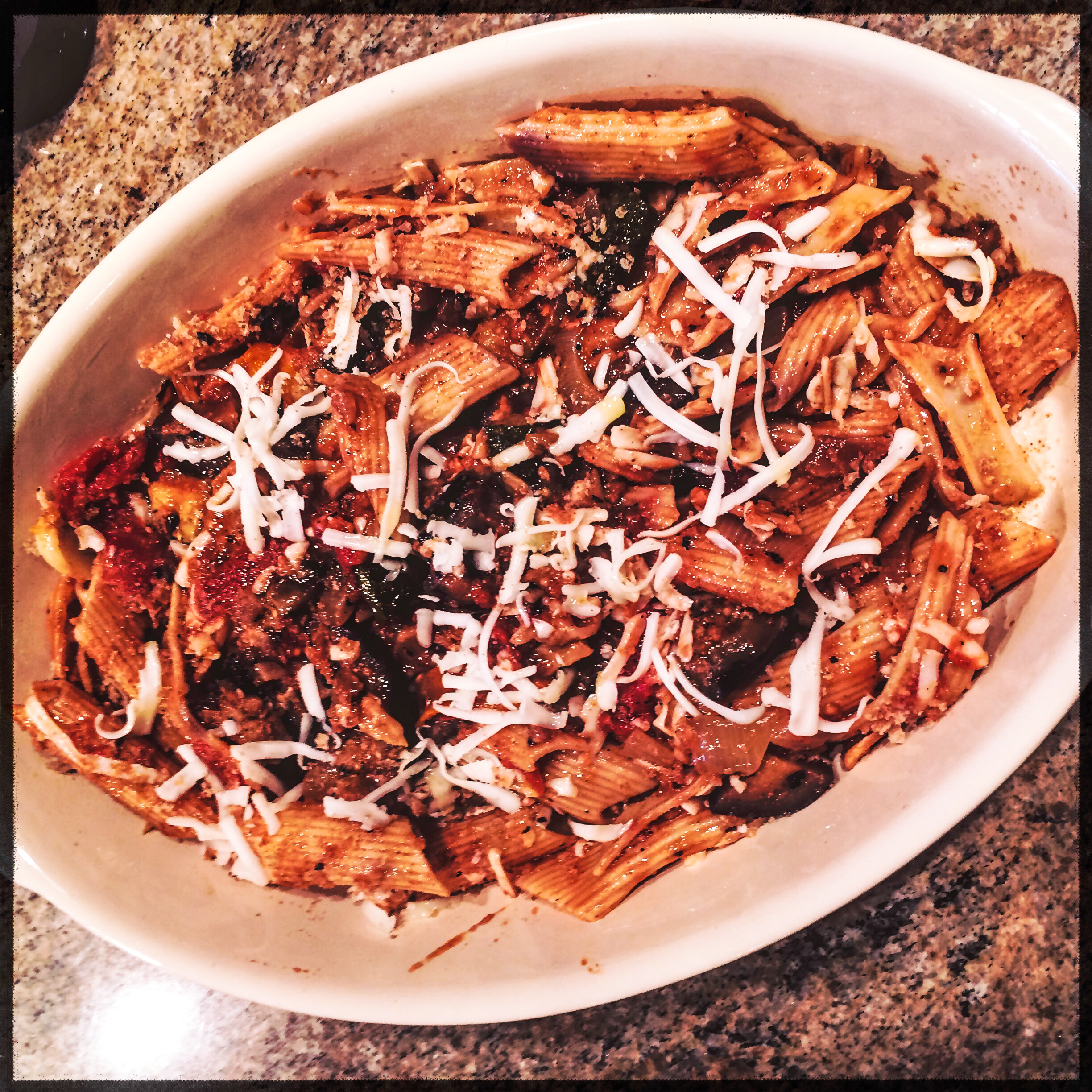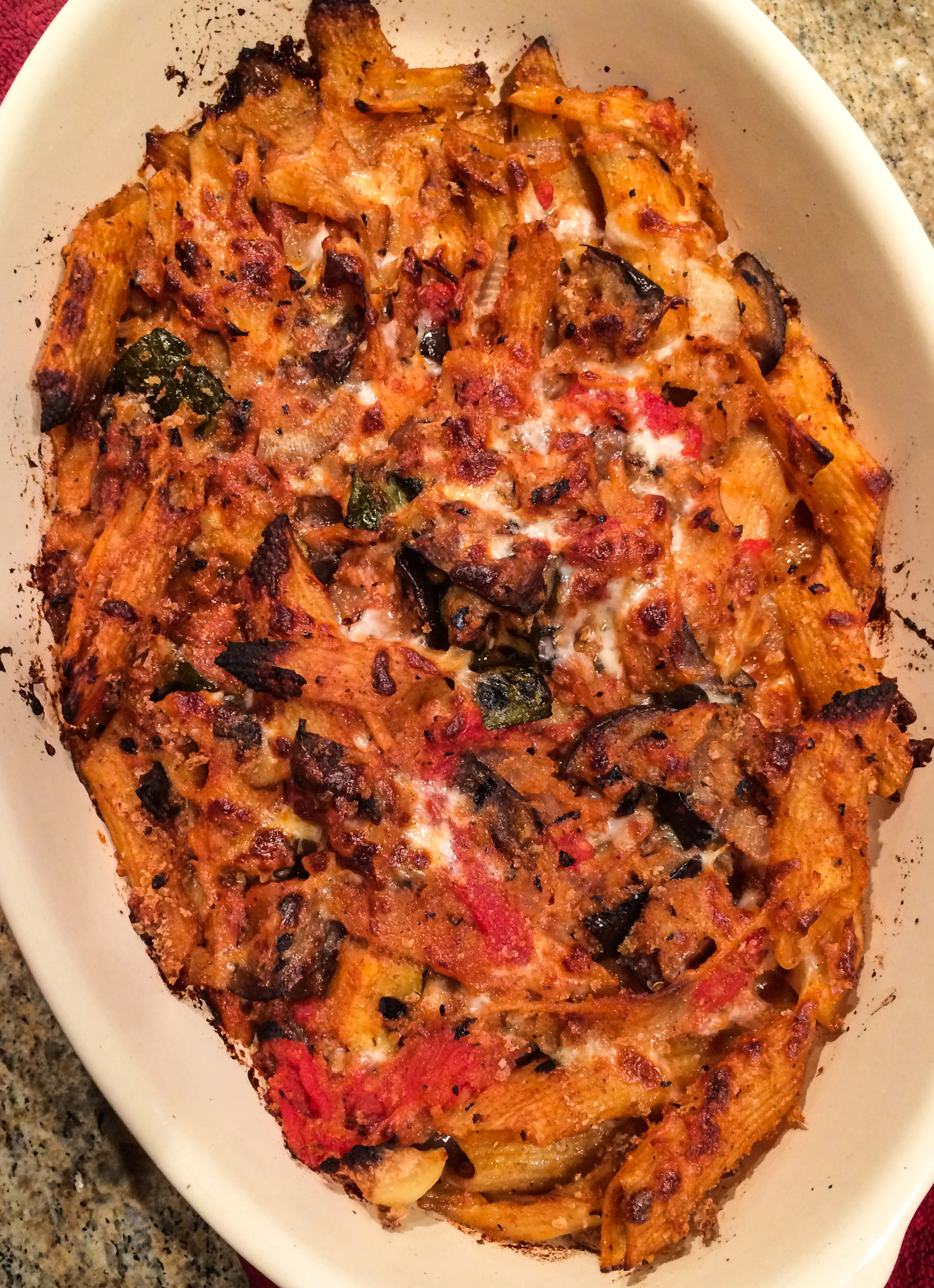Next course was leftovers — but pumped up for the occasion. A few nights ago I grilled a bunch of vegetables — eggplant, onions, zucchini — and added them with tomatoes to a dish with fine quality Penne pasta from Puglia. Naturally, I had some of the leftovers for lunch the next day, but now the remainder would have looked pretty wimpy in a pasta bowl reheated in the microwave. So I borrowed a page from Al Forno in Providence, and prepared the dish with some rice milk (instead of cream), a little grated mozzarella, some olive oil, more juice from the canned tomatoes used for the soup, and fresh bread crumbs grated from the heel of one of my whole grain breads. Tossing it all together in a bowl, I put the pasta in a shallow gratin dish and baked in a hot oven (475º F.) until crispy with some dark spots.