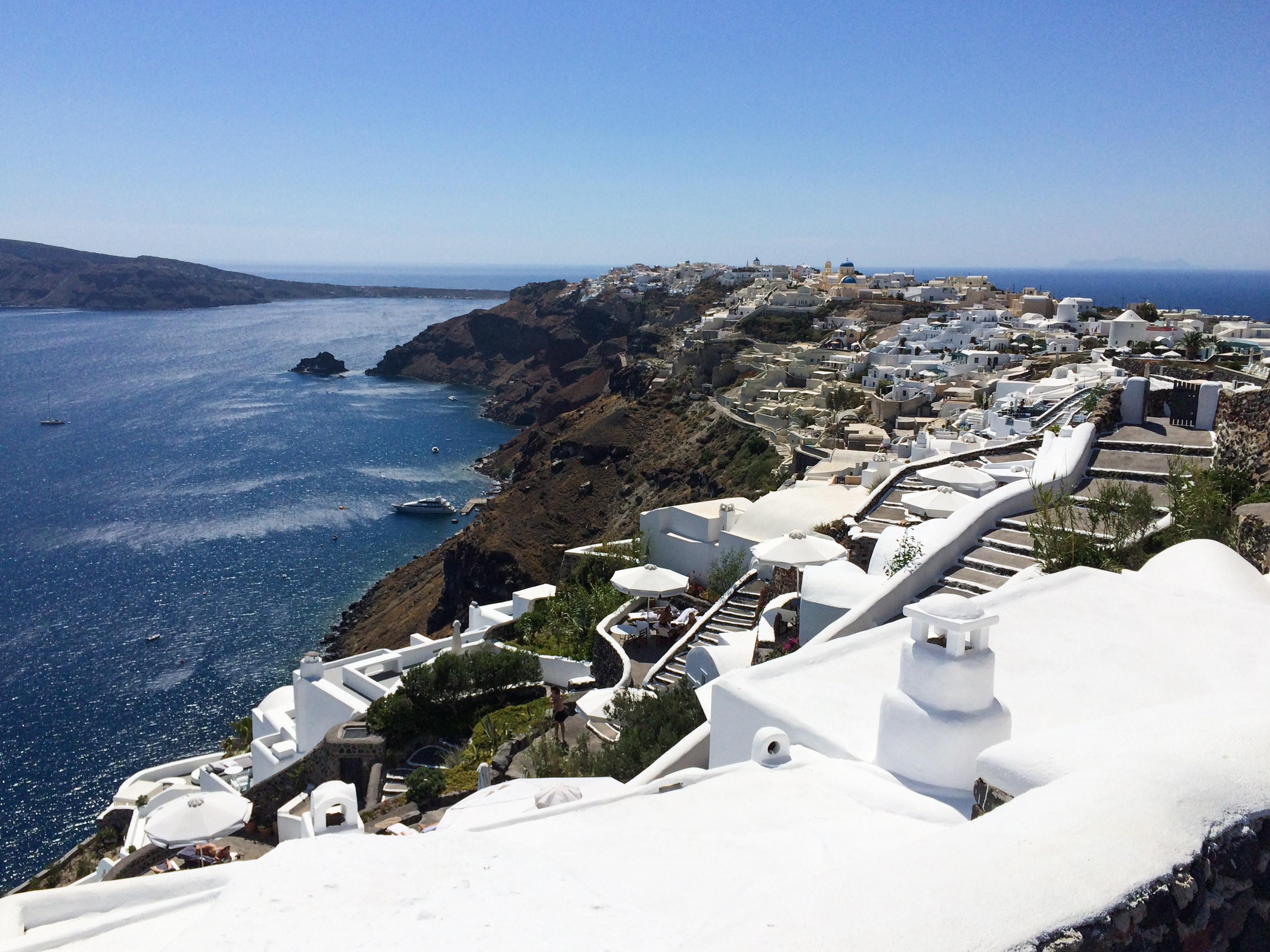 - the clifftop village of Oia is a very attractive and charming place to walk, eat, and/or stay