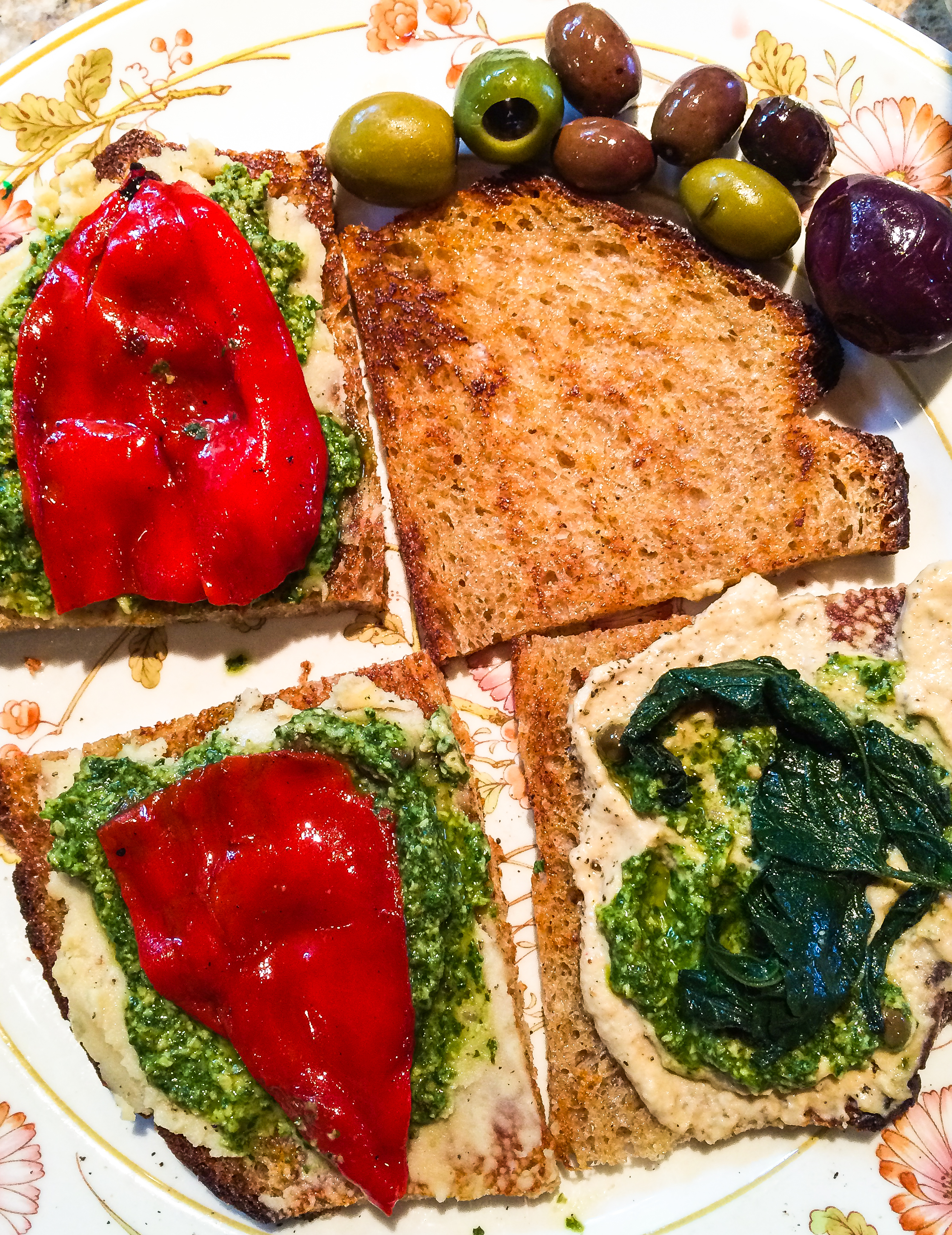 This week was purée week for lunches. I stopped at a local organic farm for some arugula, from which I made an arugula pesto (as a bonus I got some stinging nettles for tea and other purposes). Inspired by the Santorini-style favas, I decided to try again making a purée from organic, dried, real fava beans. I soaked them overnight, and then with considerable effort, peeled them before cooking the purée. I found it to be particularly good when combined with the arugula pesto on pan-grilled whole-grain bread I made recently, featuring einkorn and whole wheat flours, ground in my grain mill. Topping that with Spanish piquillo peppers or sautéed nettles completed the lunch.