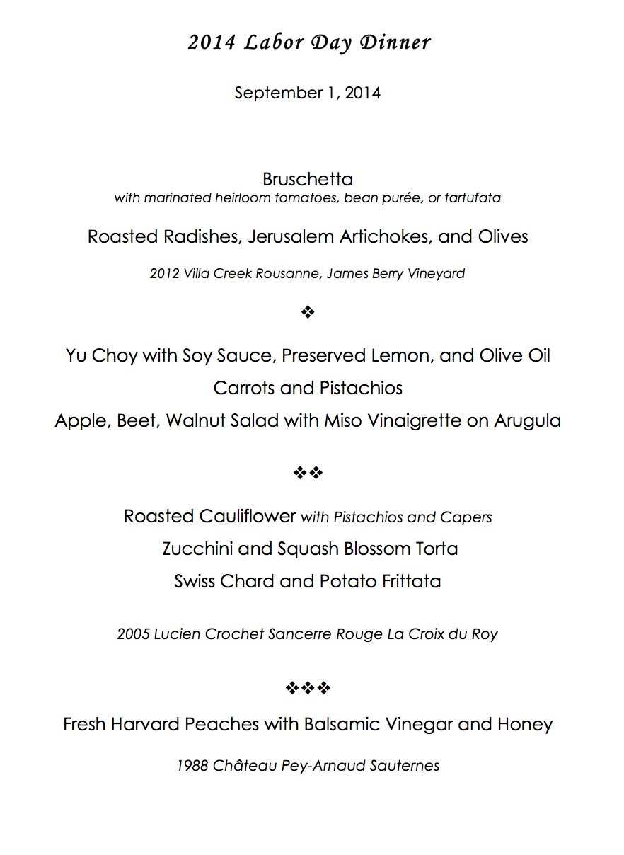 A long weekend is always an invitation for us to cook. This time Barbara was particularly inspired by the Oct/Nov 2014 issue of Fine Cooking, a magazine we had discontinued some time back but to which we recently re-subscribed. So we invited five of our very good friends over for dinner on Labor Day to share the food and wine. Here’s the menu: