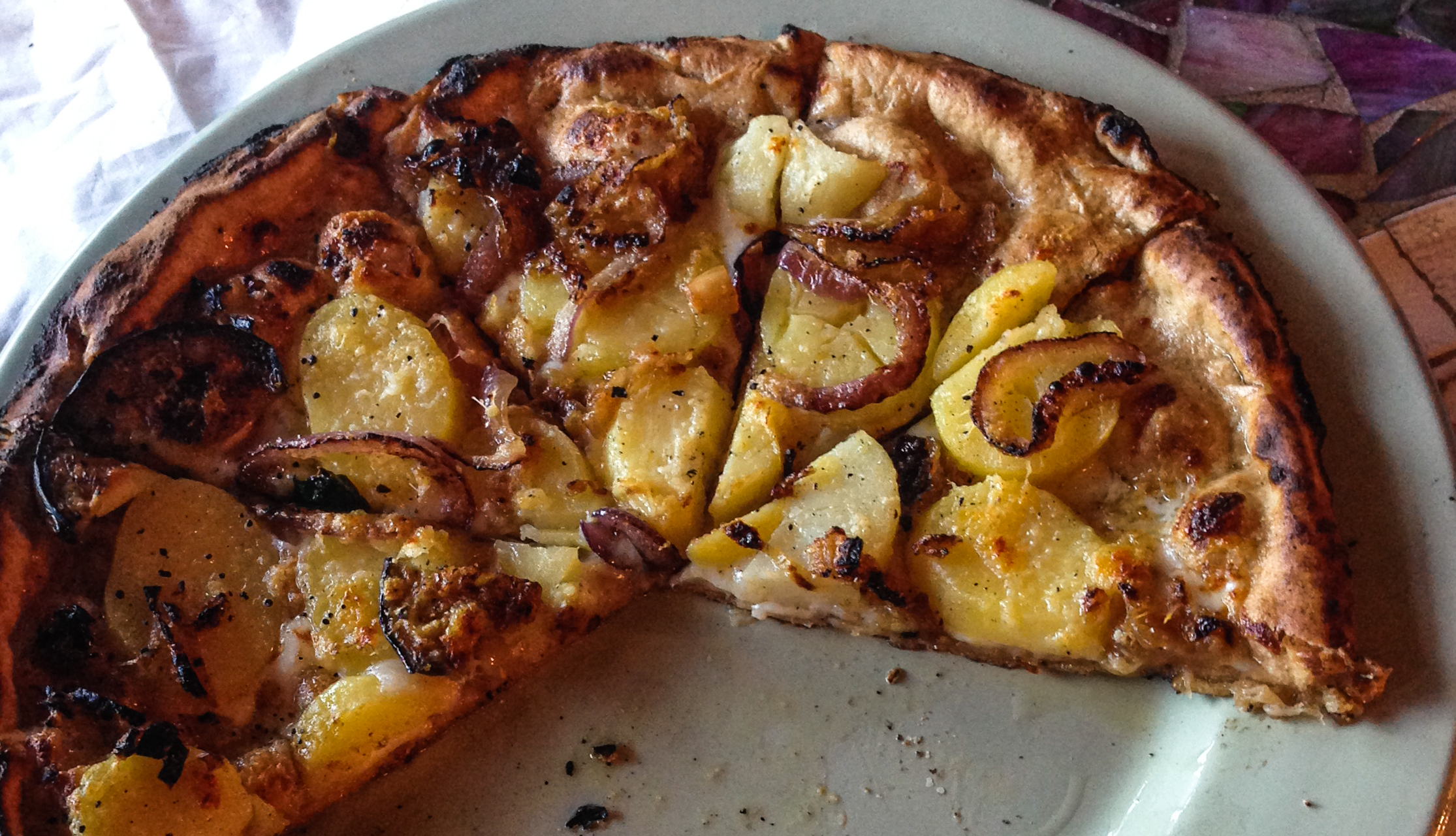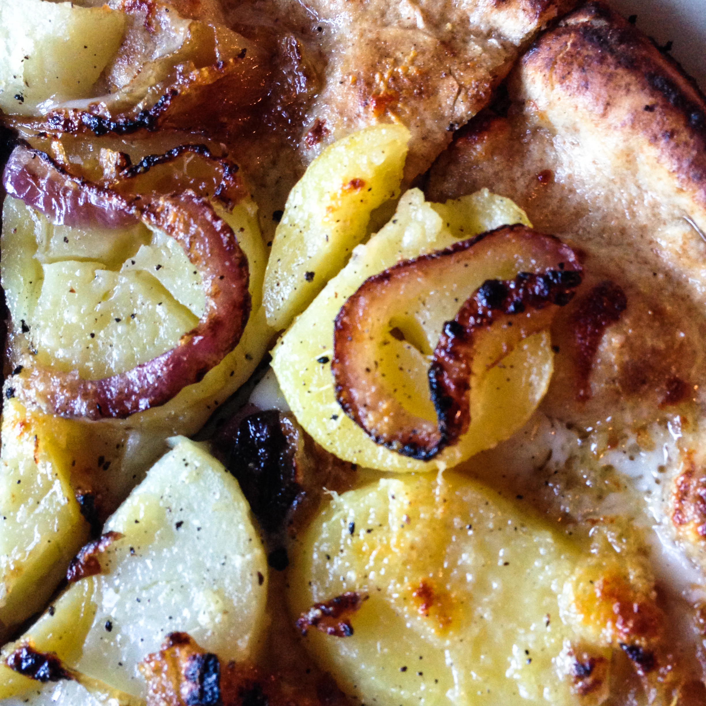- Satina potatoes from the West Acton Market (Hungry Bear Farm), partially boiled, then sliced, placed on top of shredded mozzarella cheese