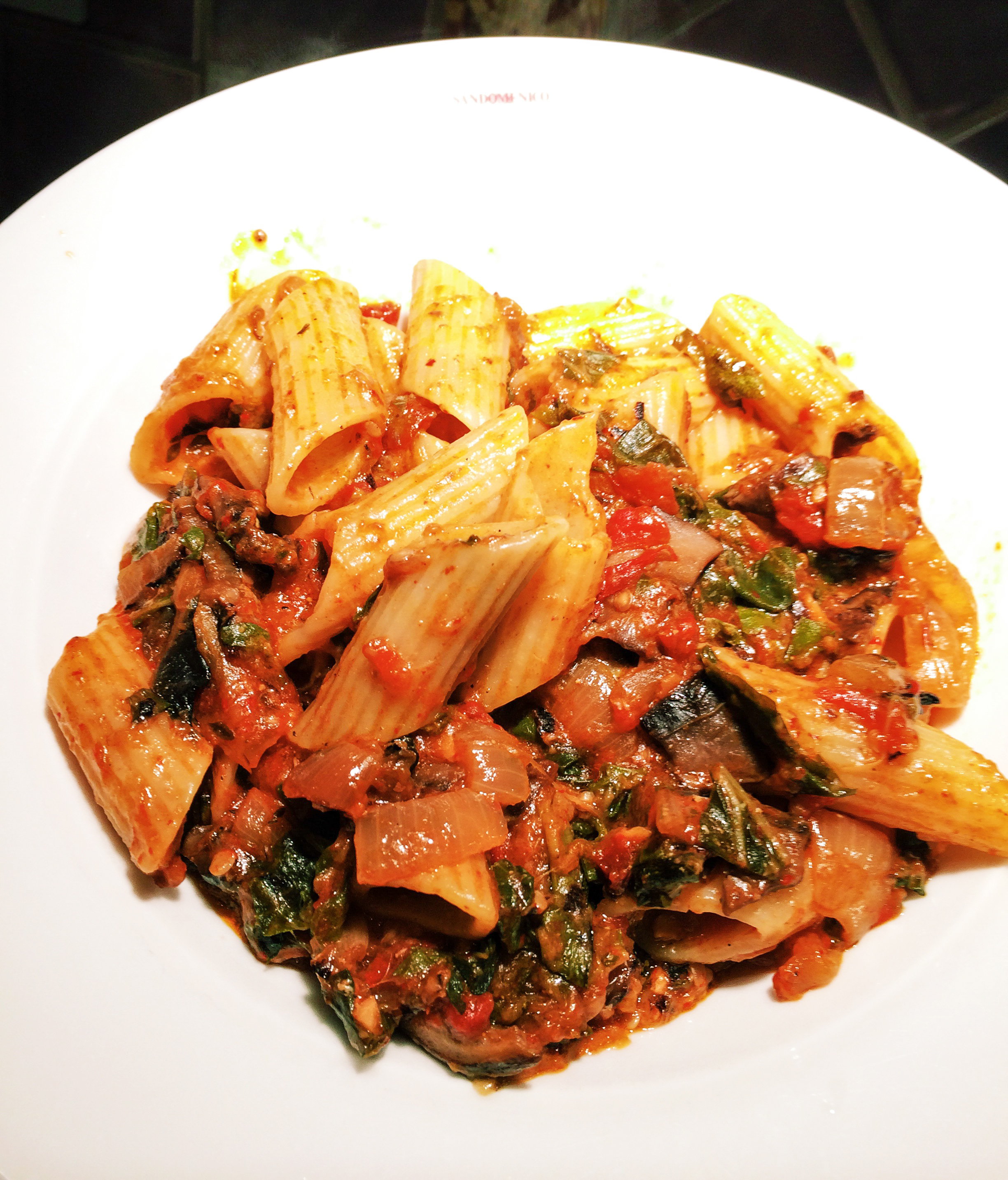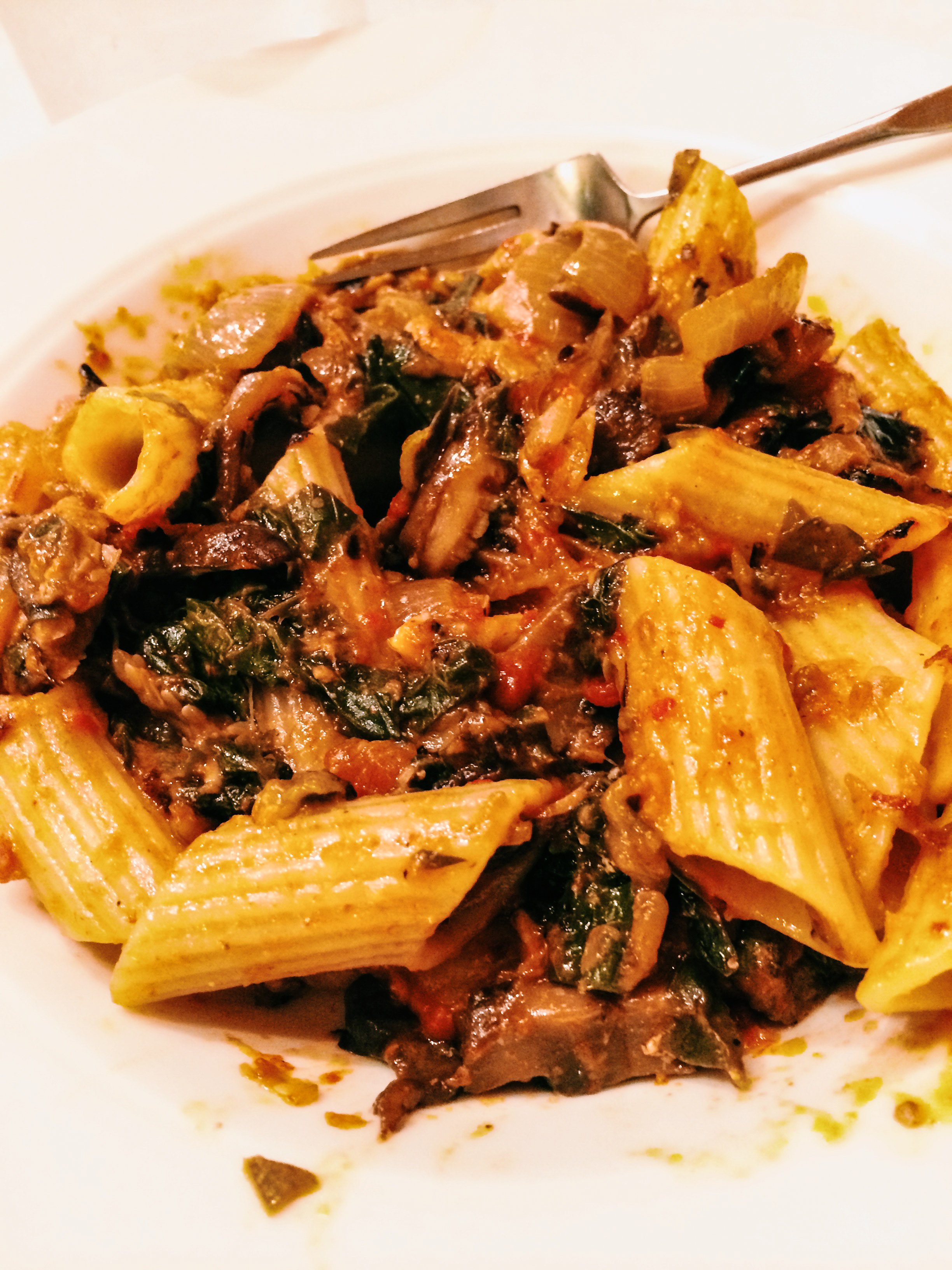 Some weekday pasta dishes are like old Italian houses. The main ingredients only need a few repairs, more stucco, and a fresh coat of paint to be charming. Such was supper tonight. I was a t school most of the day, and Barbara was off early this evening to her quilt guild meeting, so I was on my own. I decided to use the vegetables she had baked in a pasta-less lasagna dish previously described. It had eggplant, Swiss chard, grilled onions and eggplant slices, garlic and tomatoes, baked for some time. I pulled off and discarded the melted mozzarella, which was no longer appealing, chopped up the vegetables a bit, stirred in some red pepper purée made over the weekend from fresh grilling peppers, and warmed it for my sauce. To add a little zing, I chopped up one small Calabrian chili pepper stirred it into the sauce.