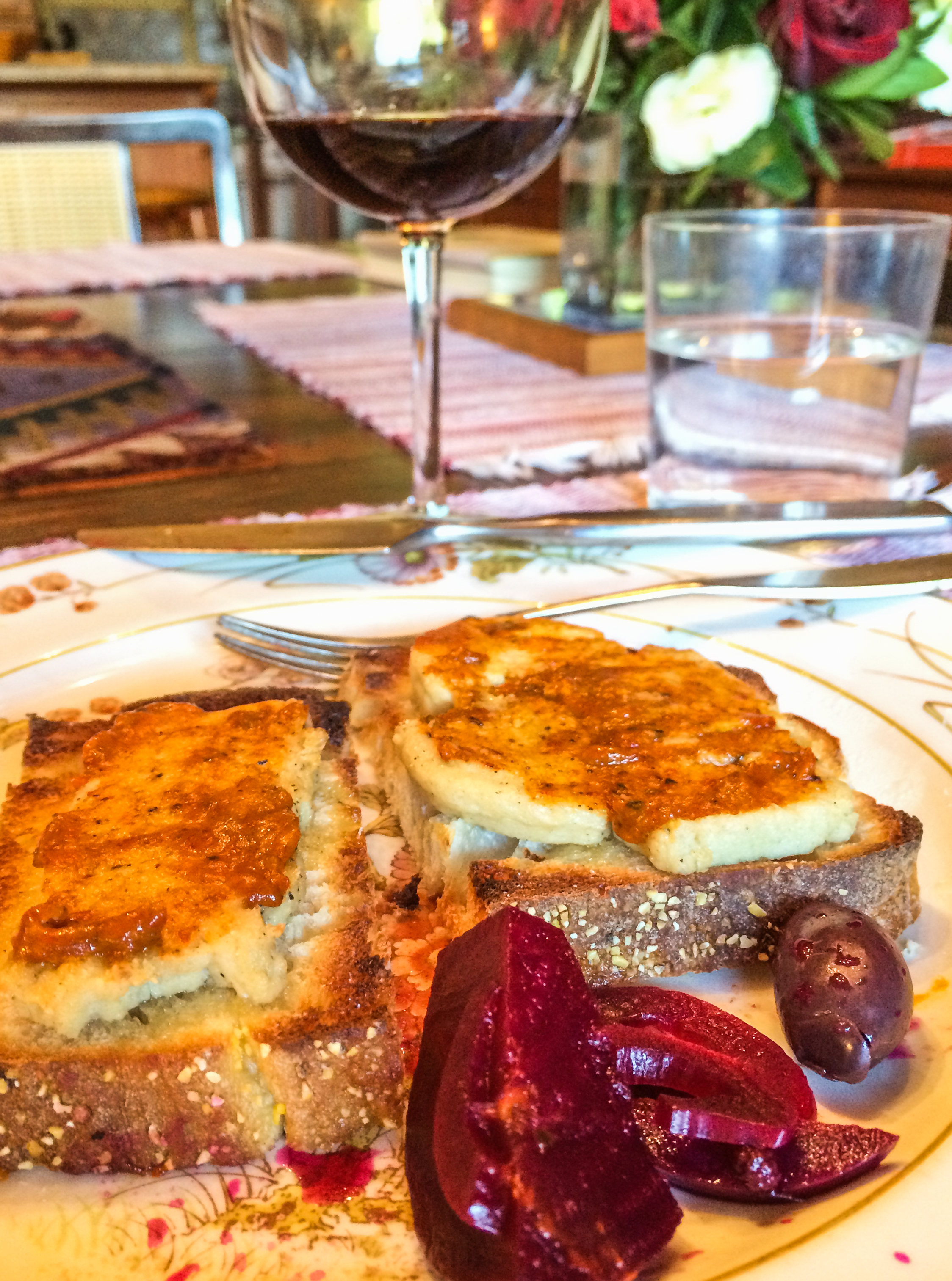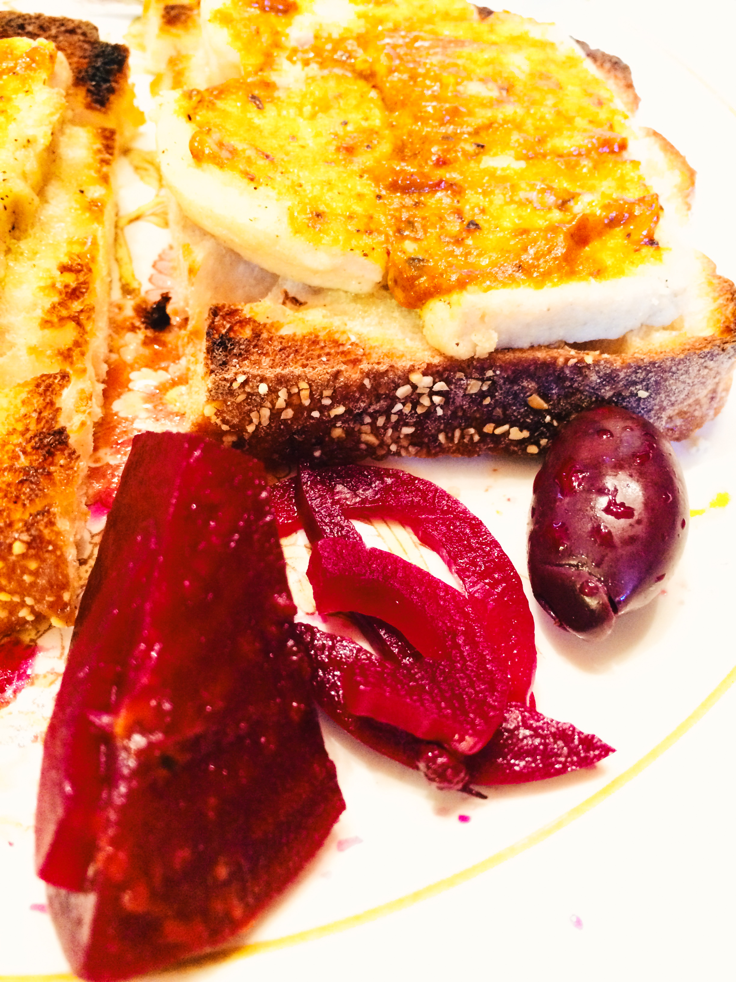 As I browsed the shelves in the store, one other wine struck my fancy: a SATRAPEZO saperavi_2006 from Georgia. This country in the Caucasus has a wine-making tradition going back 6,000 years. It has been intriguing me recently, but I had never found a bottle in a wine store previously. This one caught my eye because it was 30% off. That usually means (a) a crappy wine, or (b) a wine no one knows about, or (c) both. In this case the correct answer is (b), fortunately. I had the Saperavi with a lunch, consisting of my homemade pickled beets and grilled Tuscan pane topped with a cashew mozzarella-like cheese I had made last weekend, along with a hot yellow grilling pepper purée, also from the weekend cooking activities. Quite to my surprise, the nut cheese (which was cold and rubbery when uncooked) turned out to be very tasty when broiled. It was all delicious.