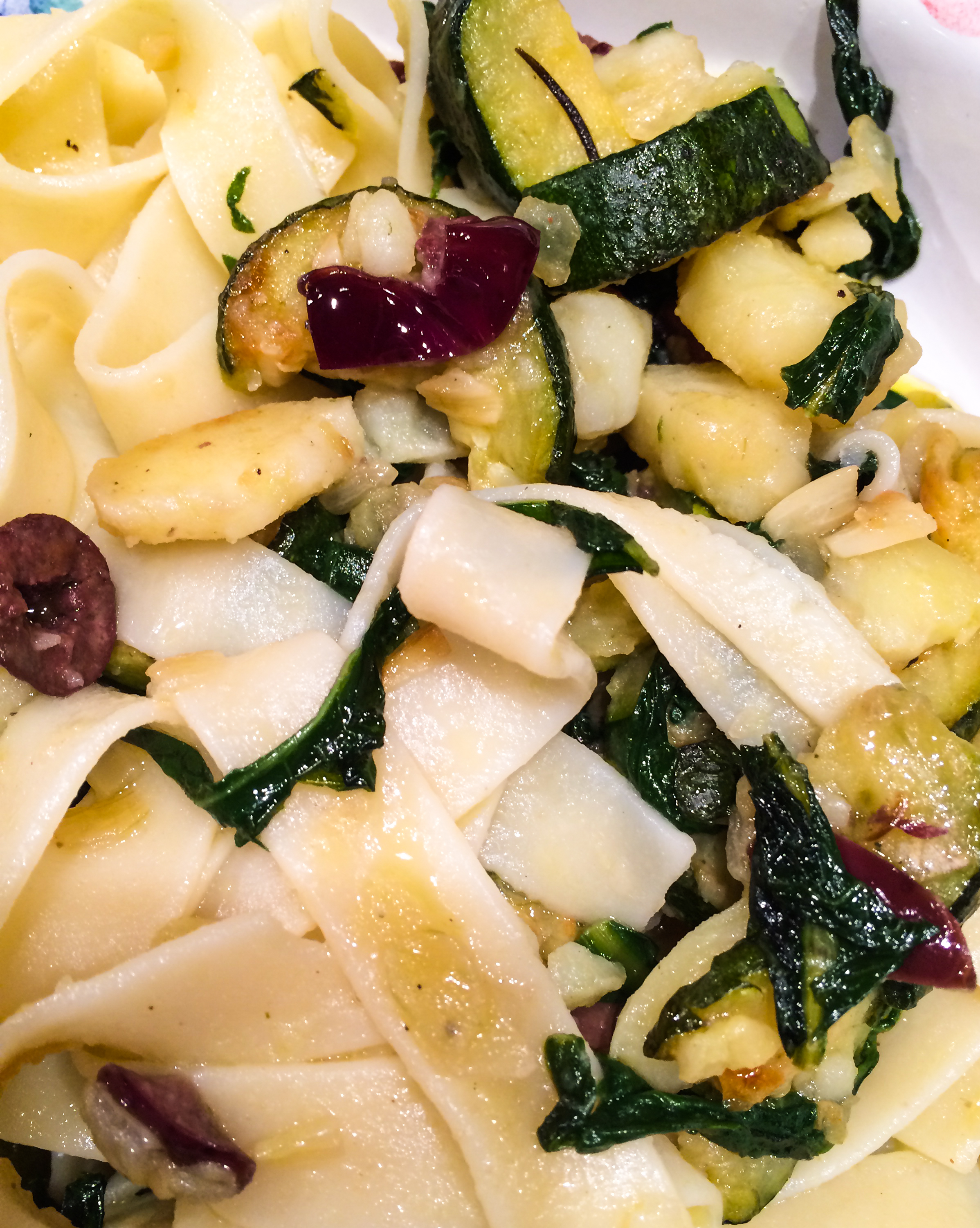 - now add the zucchini, onions and garlic, and chopped greens, along with some chopped pitted Kalamata olives