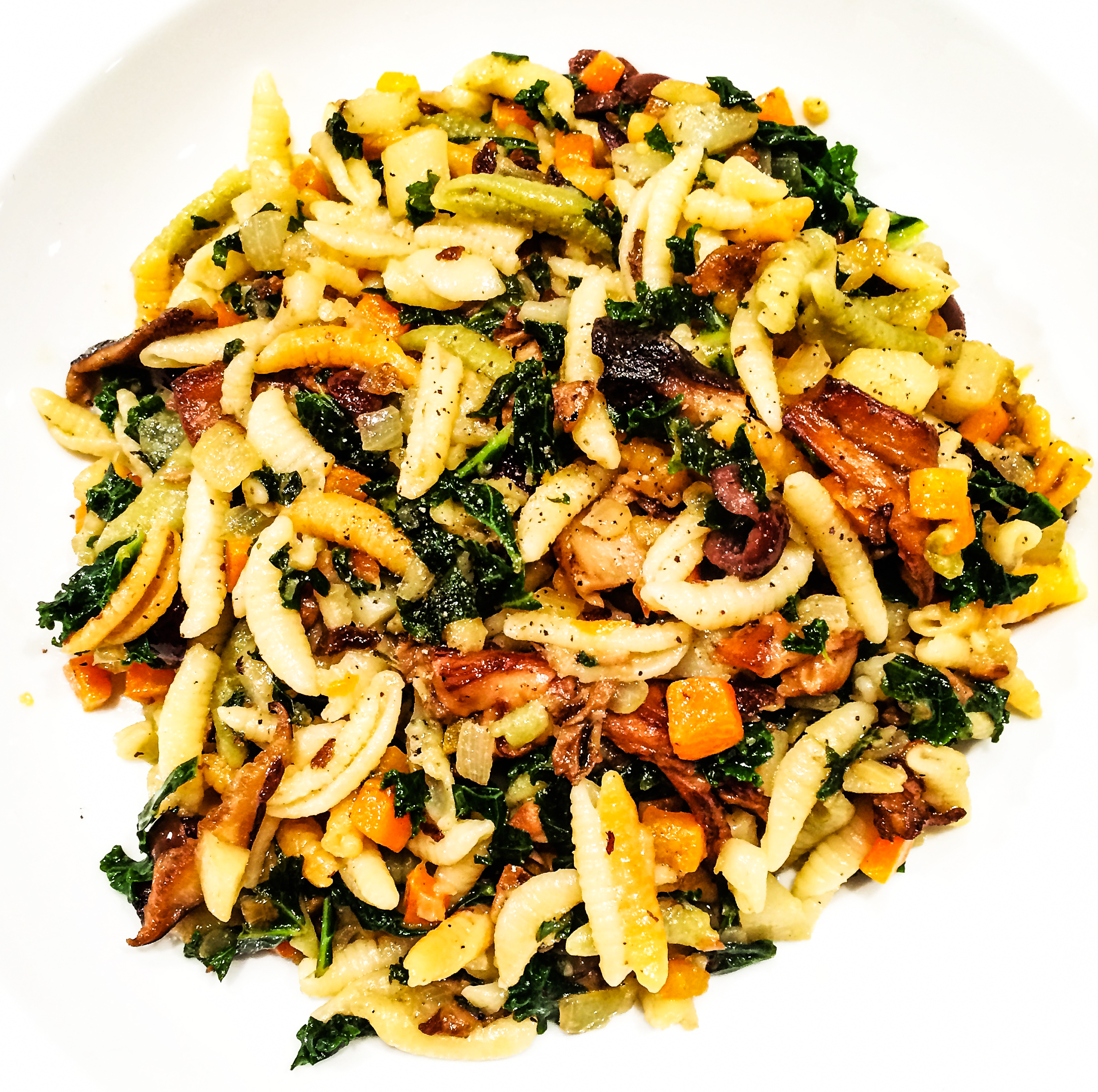 - combine sautéed vegetables, mushrooms, kale, and the gnocchetti in the sauté pan, add a handful of pitted, chopped Taggiasche olives, a little more olive oil, and sea salt (preferably from Ibiza), and cook two or three minutes until the flavors are well-blended.