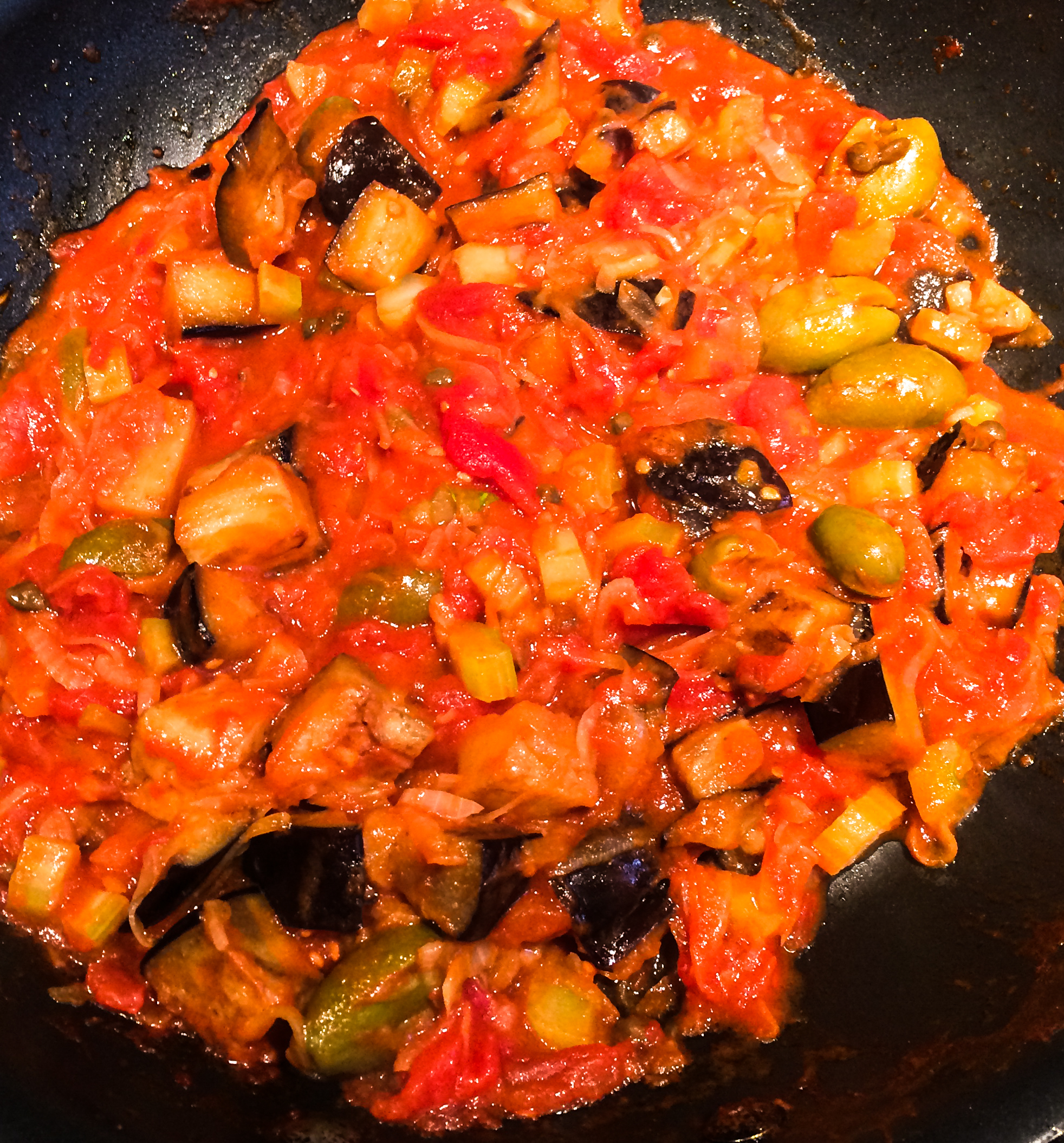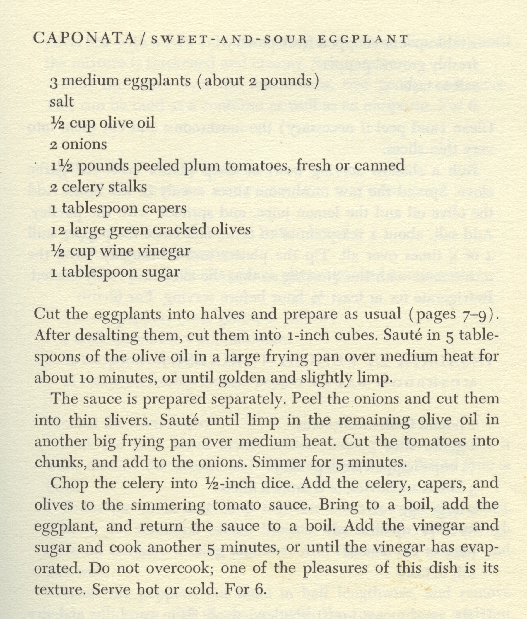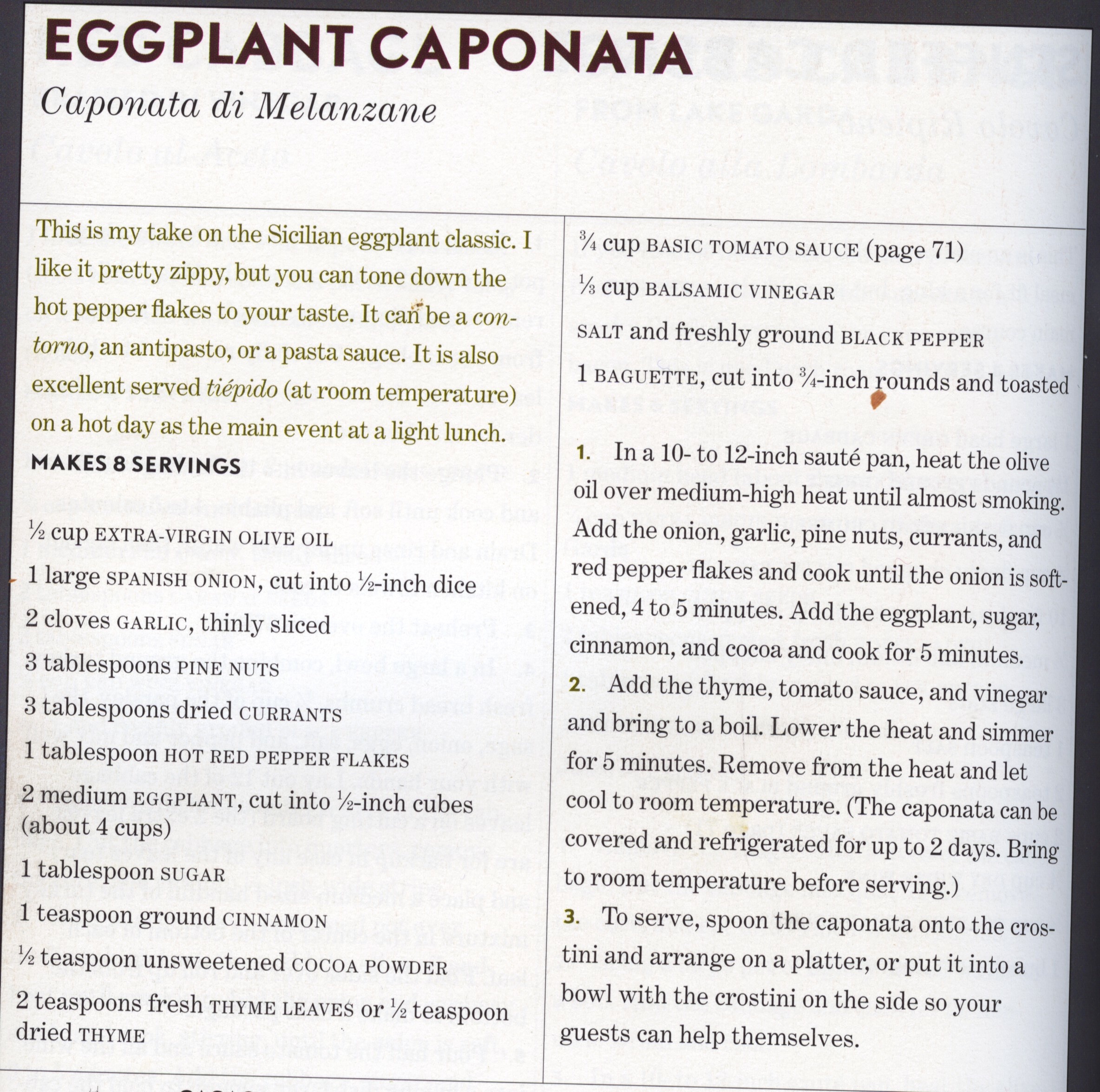 One of the Italian dishes I adore is Caponata, a Sicilian eggplant treat with strong overtones of the island’s Arabic influences. The current population of Italy is 60,254,297 people, so there must be at least 60 million recipes for Caponata. Virtually all of them have these elements in common:
