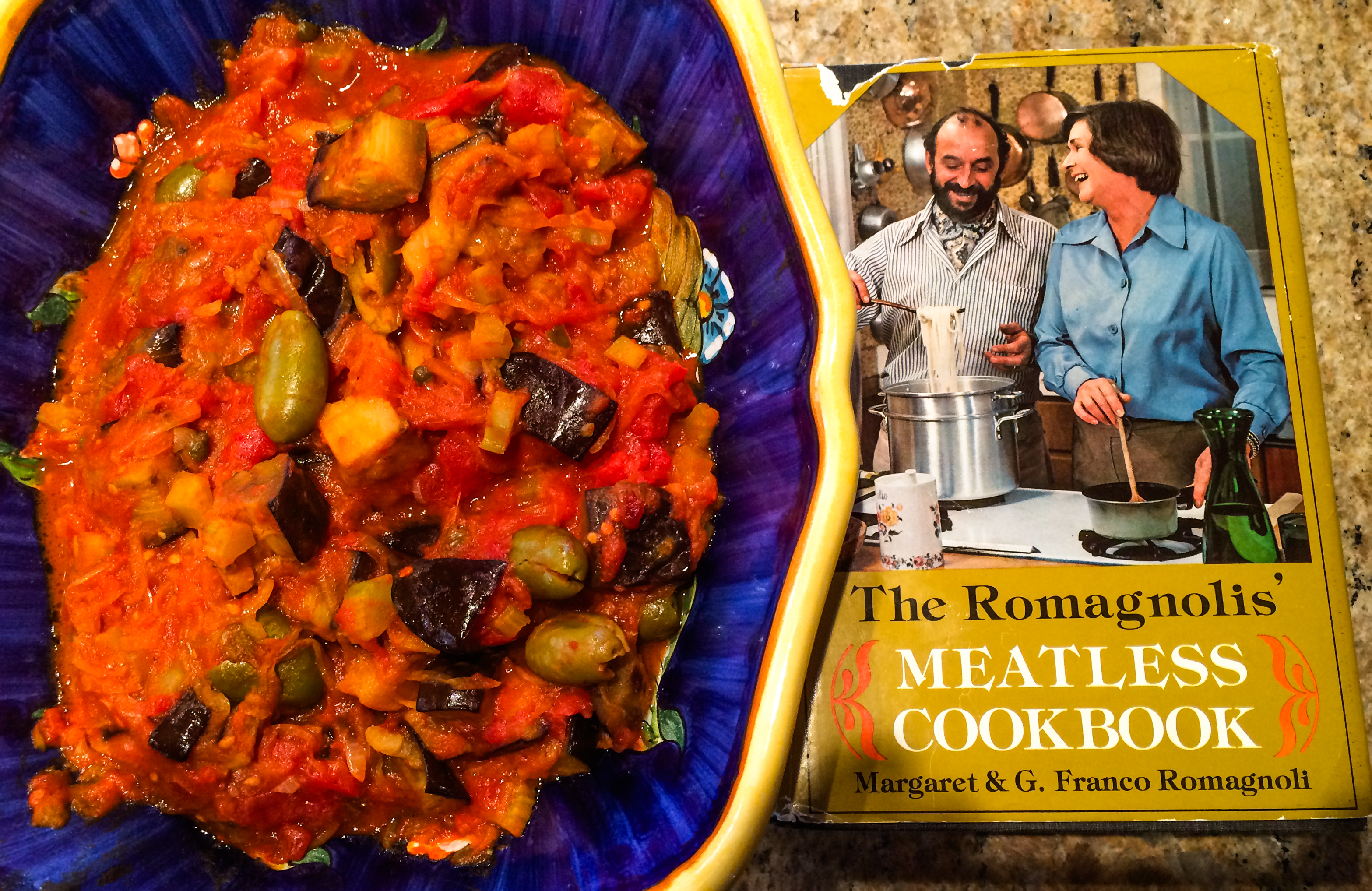 The one by the Romagnolis goes back to the mid-1970s, and it was my first encounter with this delicious way to prepare eggplant. The distinctive features are, in fact, green — namely the crunch of cooked celery, the saltiness of good capers, and the bite of cracked green olives. The recipe is simple and relatively quick to make: