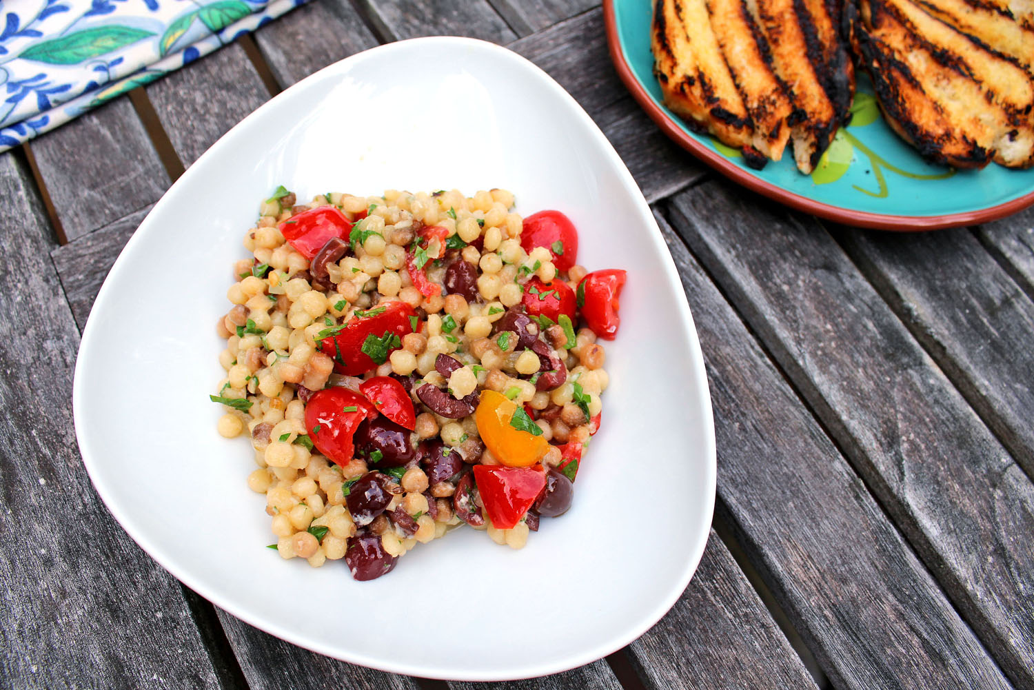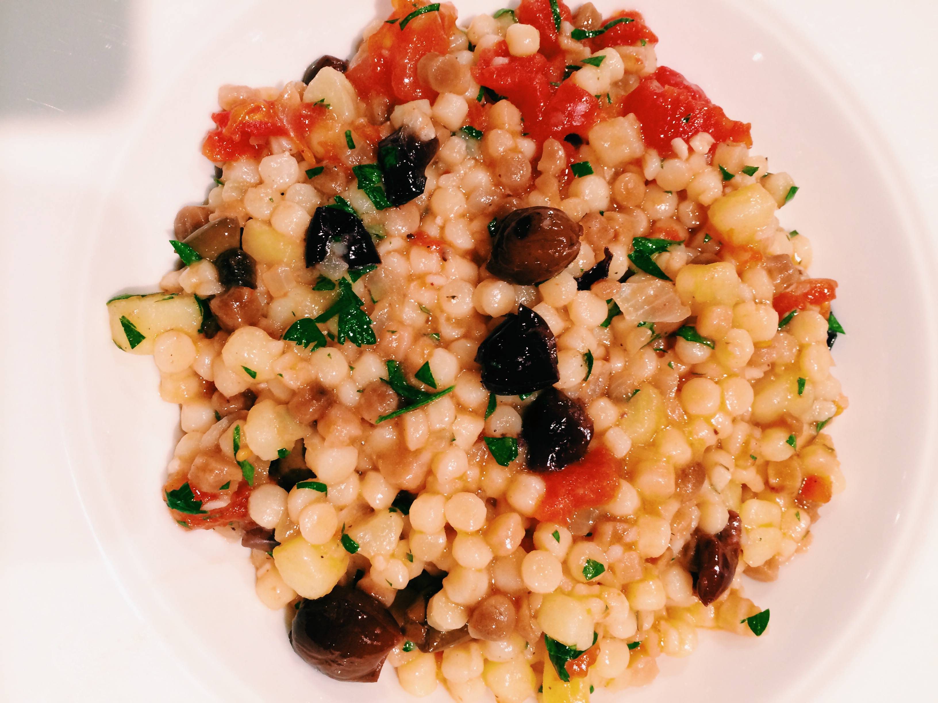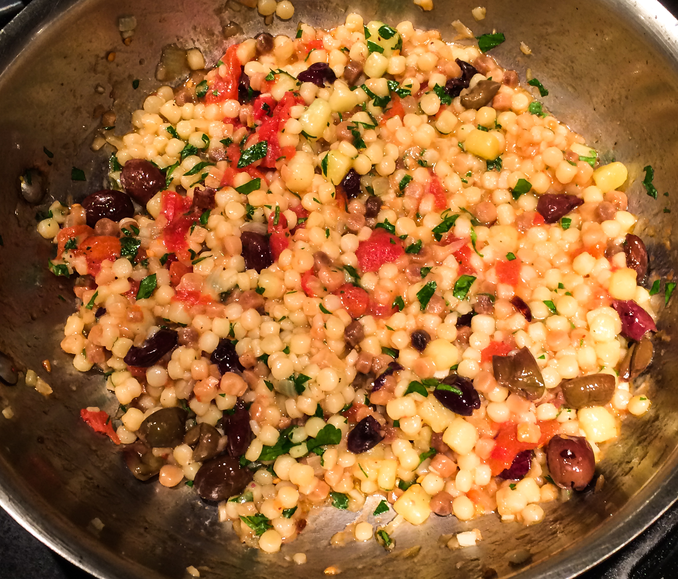 Remaining vegan in Cuba was nearly impossible, so we did the best we could. When we got home, I was eager to cook again. Since Barbara had choir practice the first night back, I cooked just for me, and I made a pasta she won’t eat — Sardinian Fregula, also known as Fregole or Fregola. I found a recipe I liked which I adjusted to include a Yukon Gold potato cut in small dice, about the size of the pasta, and I simmered it for 12 minutes before adding to the dish pictured below from the web: