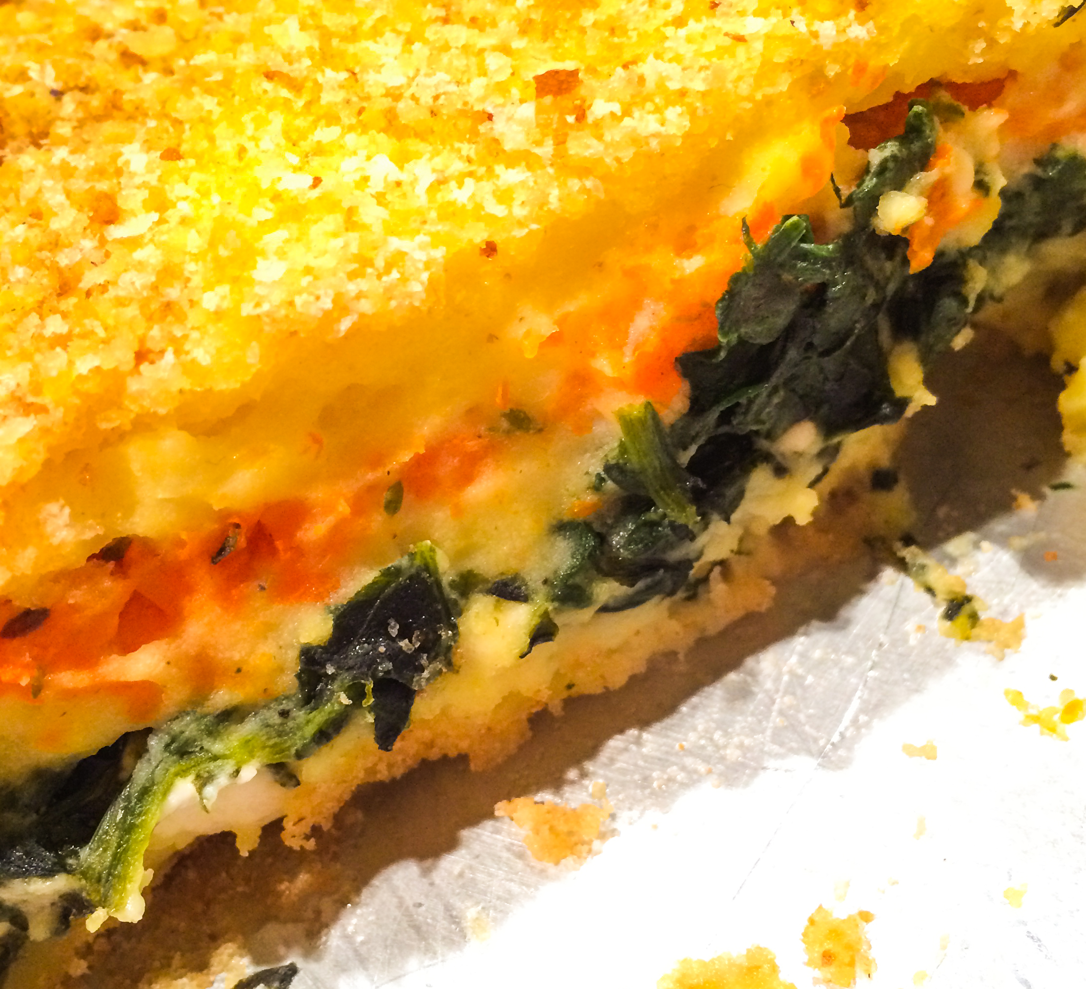 At this point I wisely turned the kitchen over to Barbara, who conceived of and executed a superb vegetable torta. She cooked spinach with garlic, boiled potatoes and carrots, mashed the potatoes and crushed the soft carrots, then seasoned them with lemon zest, and added a few more touches she’ll be glad to tell you about if you want to know. Mixing the mashed potatoes with two eggs, a little butter and two thin slices of Greek feta cheese, she took out a springform pan and dusted it with bread crumbs.