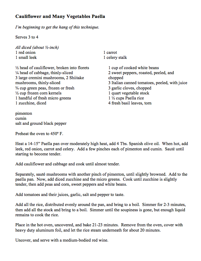 Next to pasta, one of my favorite suppers is paella.  Fortunately, I am getting comfortable now with the methodology, so I can make it with whatever is available or suits my fancy.  Tonight’s version features half a head of cauliflower, with almost a dozen other vegetables.  As always, a good stock is an important part of the key to success with this dish.