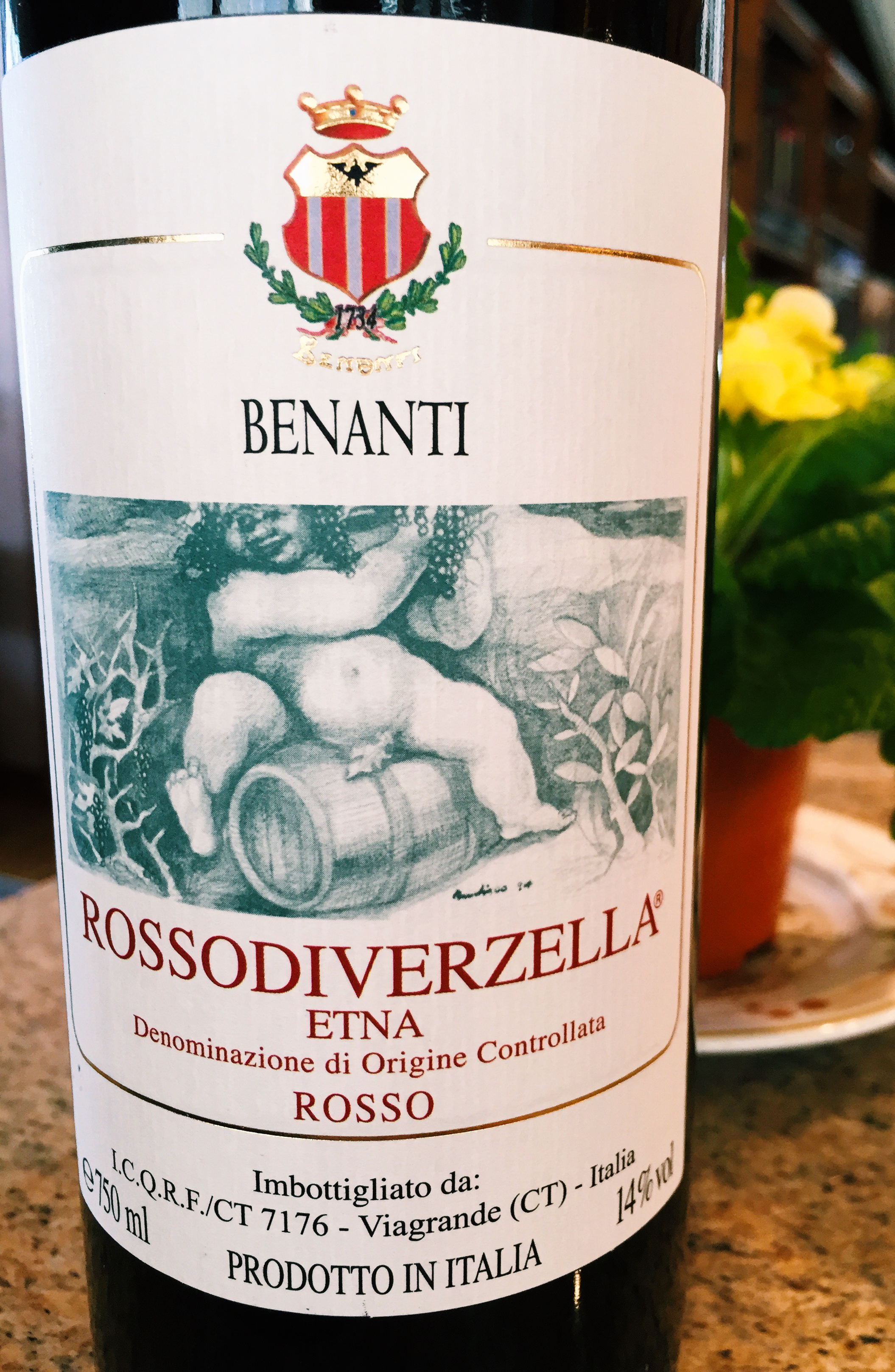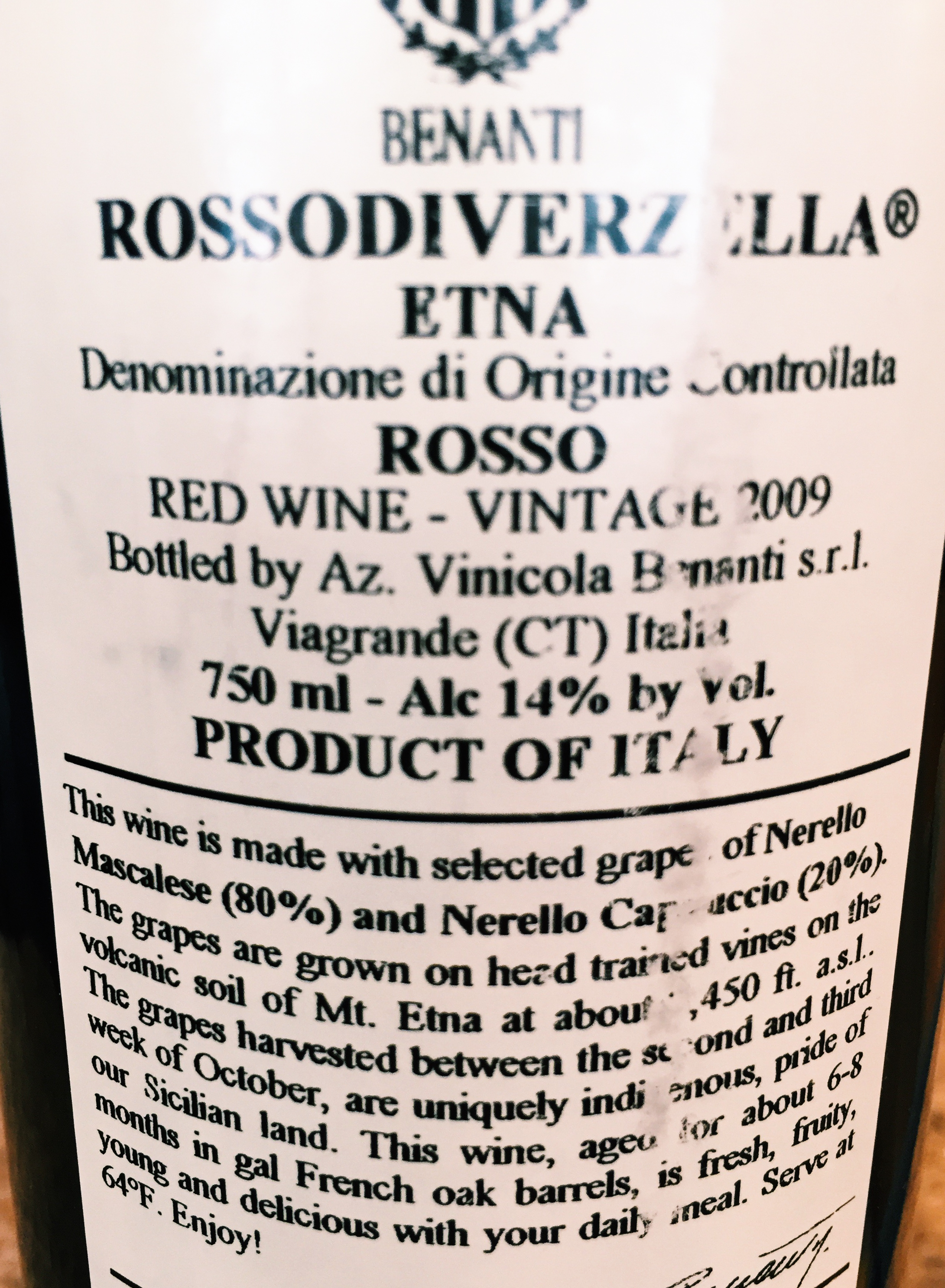 The wine was a Sicilian red, Benanti Rossodiverzella from Etna, quite good.
