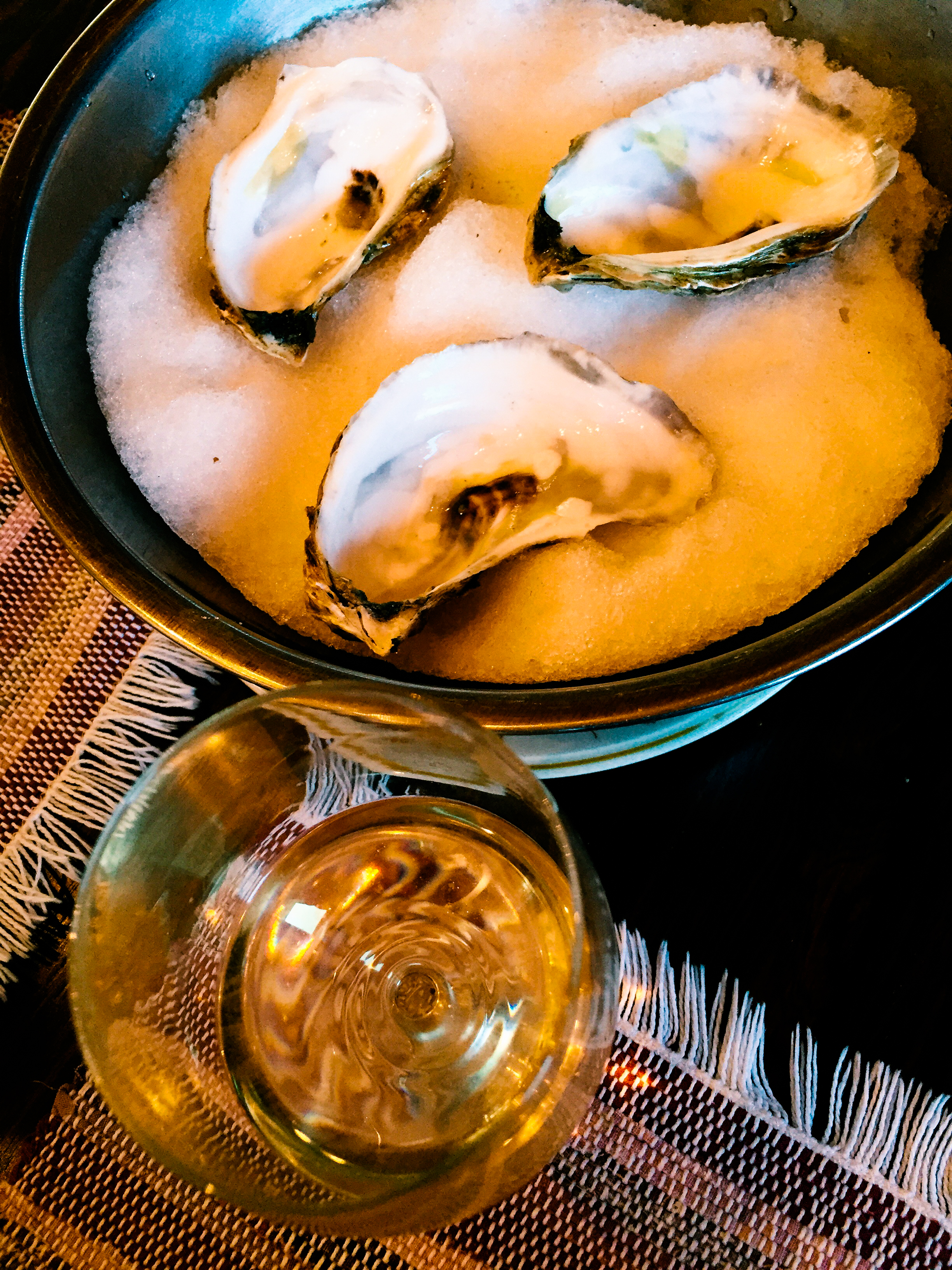 One huge benefit of all this snow is that I can scoop a pile of it into a dish or bowl and plop some freshly-shucked oysters on top at any time. Here are some Cape oysters (only the shells remain), and a glass of Minutolo, a delicious Jan D’Amore Polvanera Fiano from Puglia.