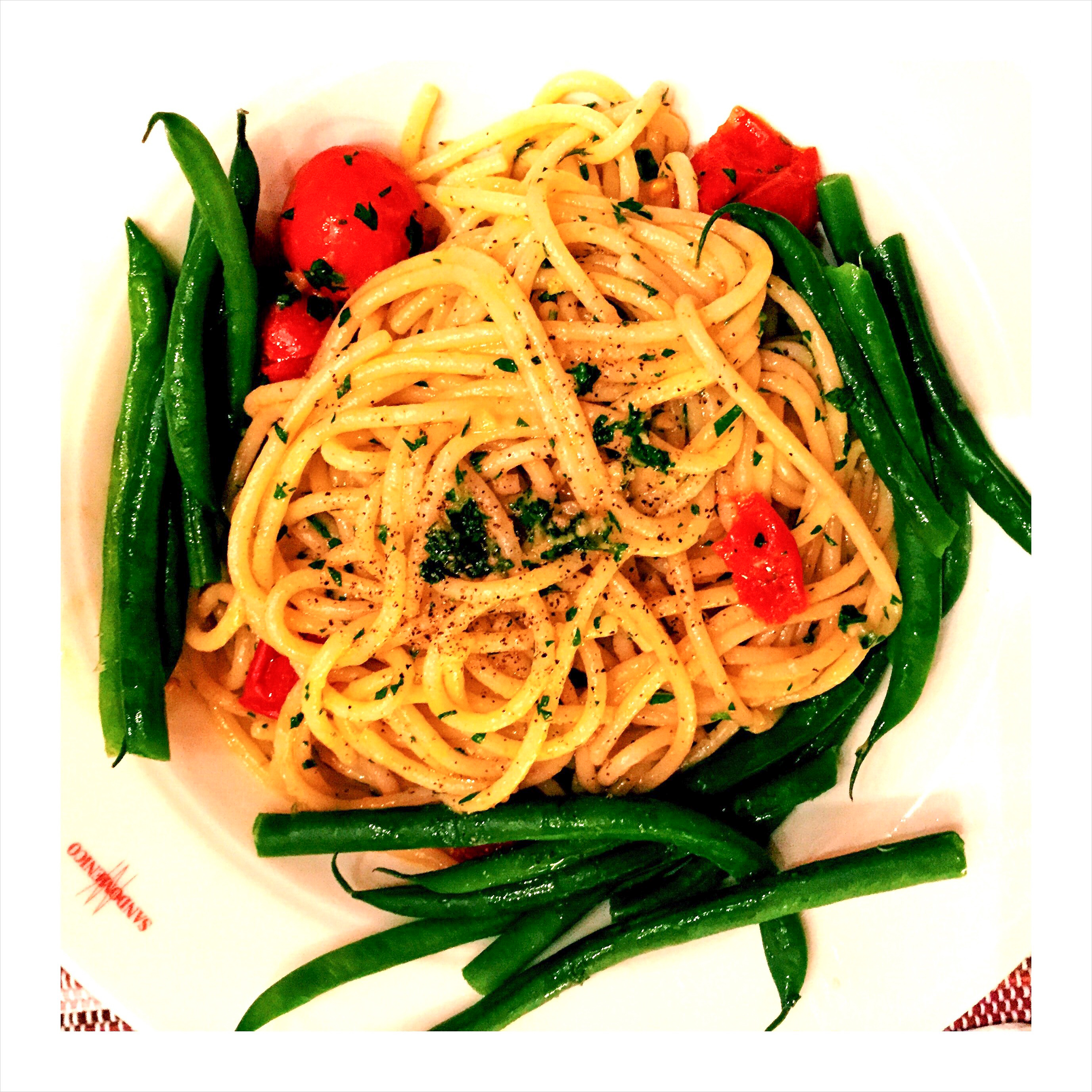 Spaghetti with Colatura, Cherry Tomatoes and Haricots Verts