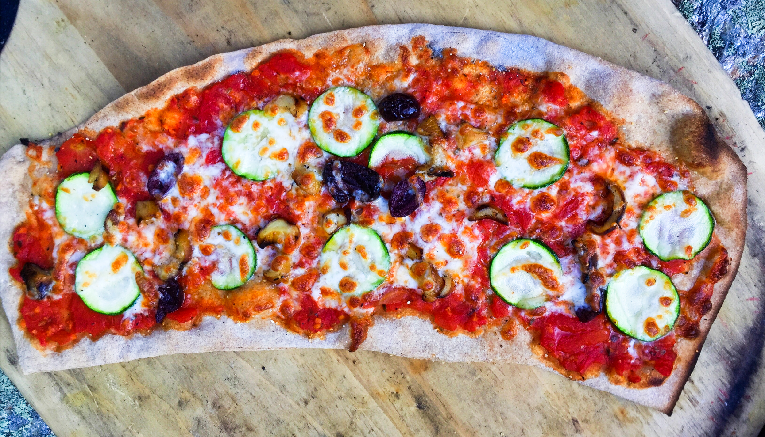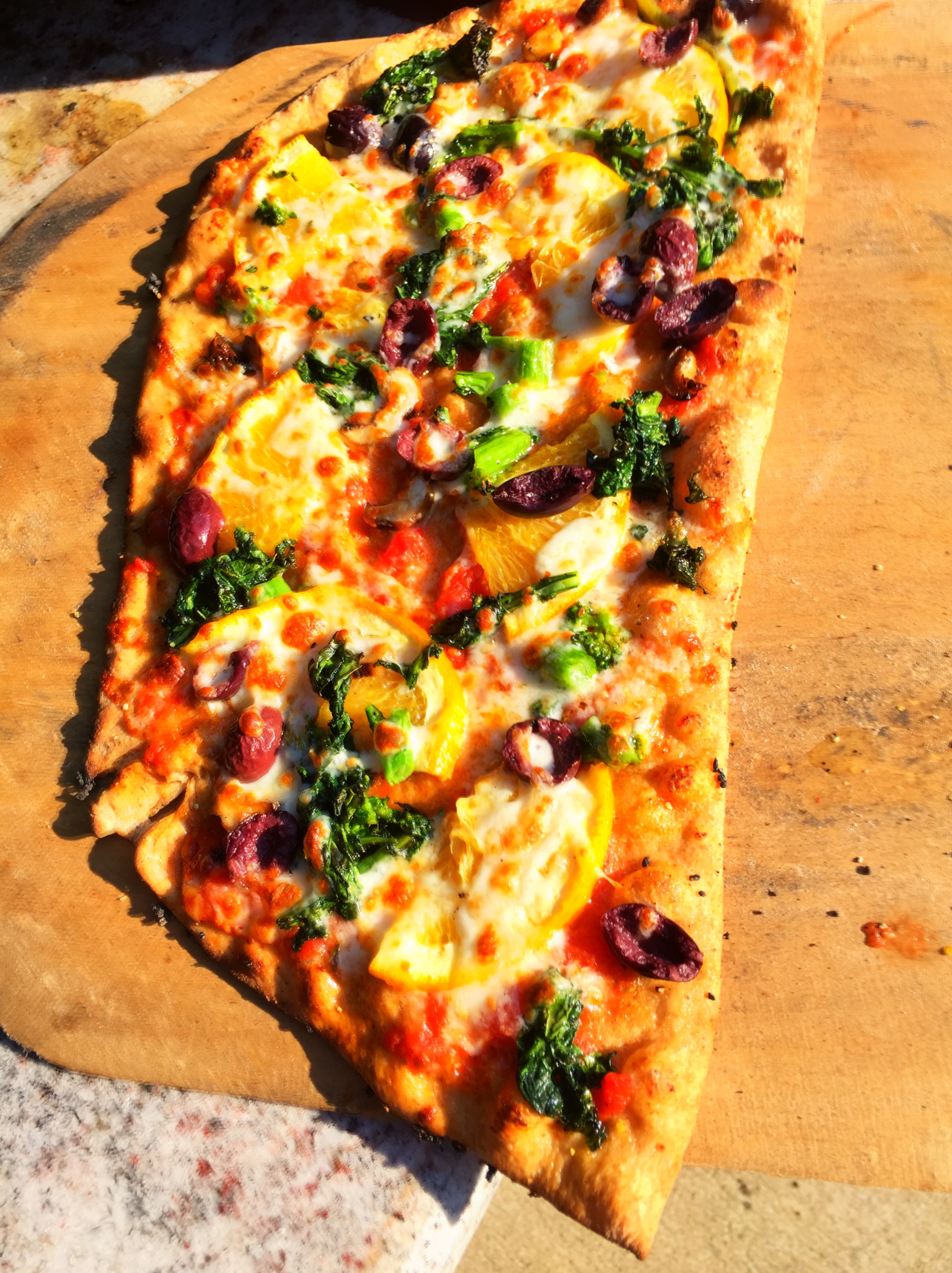 After our experience with the Orange and Olive Pizza at Osteria Pane e Salute, we were eager to try making pizza in our pizza oven with the lower temperatures suggested by Caleb. I did not go quite as low as he did (more like 550º vs. 465º). Since this was new and could possibly be a failure, I also prepared a small amount of pizza dough (a la Chris Bianco), rather than screw up the good 50% whole wheat crusts Barbara makes, so we could be sure of a good dinner, even if the experiment failed.