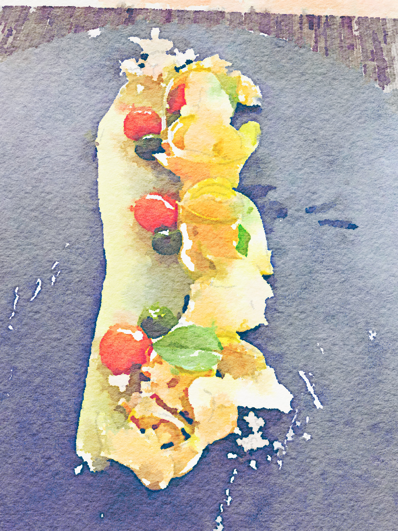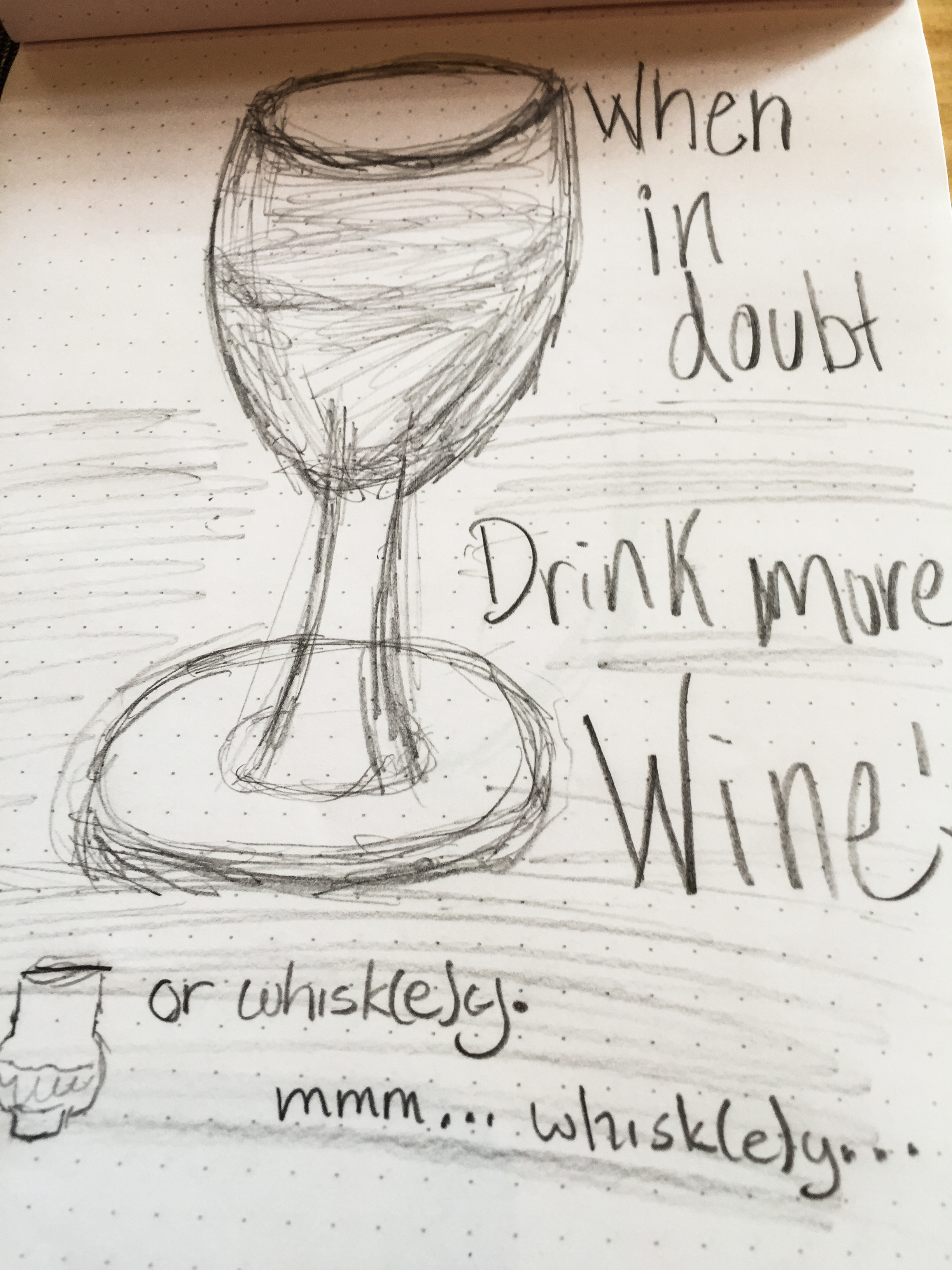 One irony: she is in the wine business. As we talked during the meal, she picked up one of the pads of paper and pencils provided for the ‘students’ (i.e. diners). As she opened it to write something, we found this little sketch from a previous diner:
