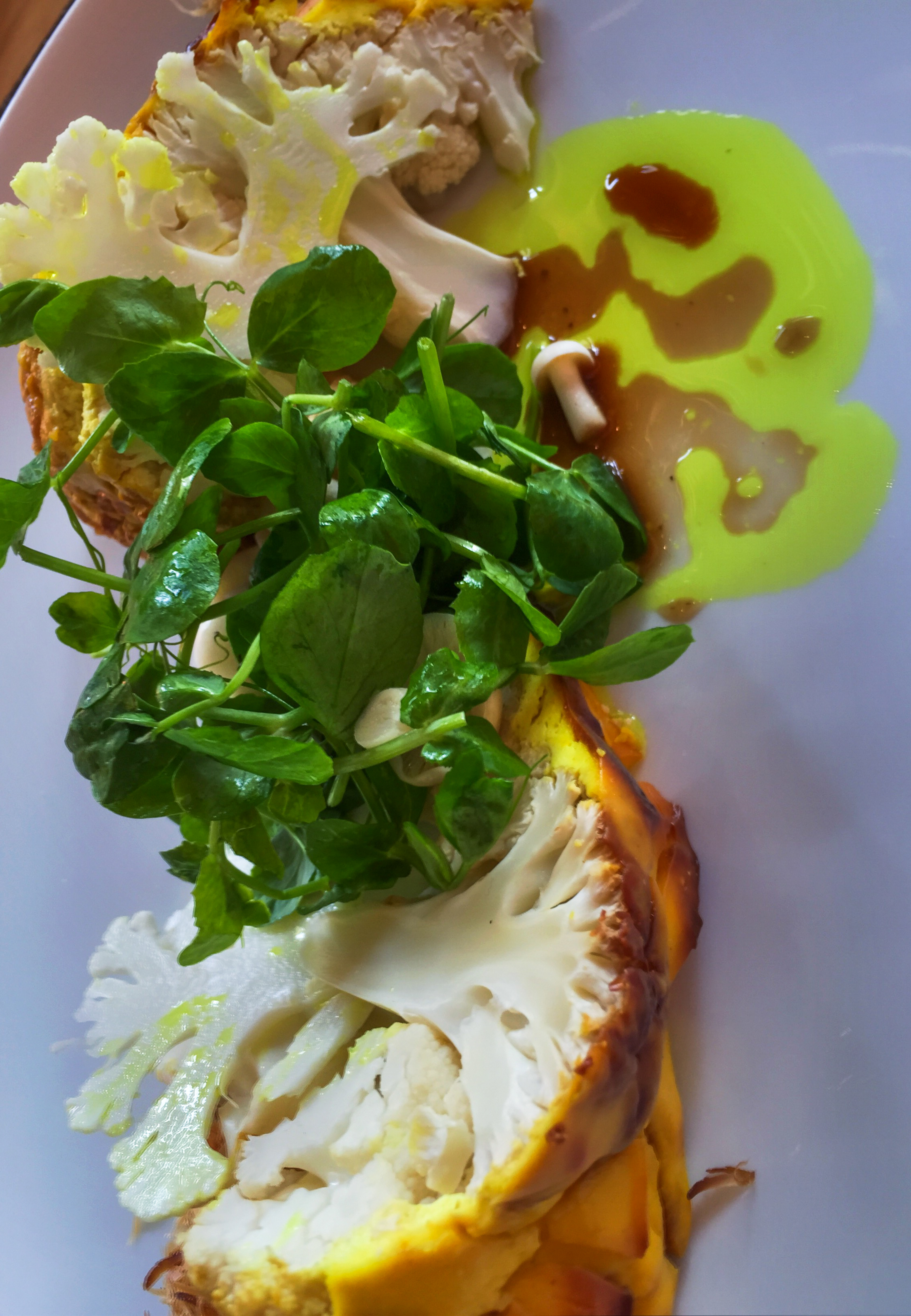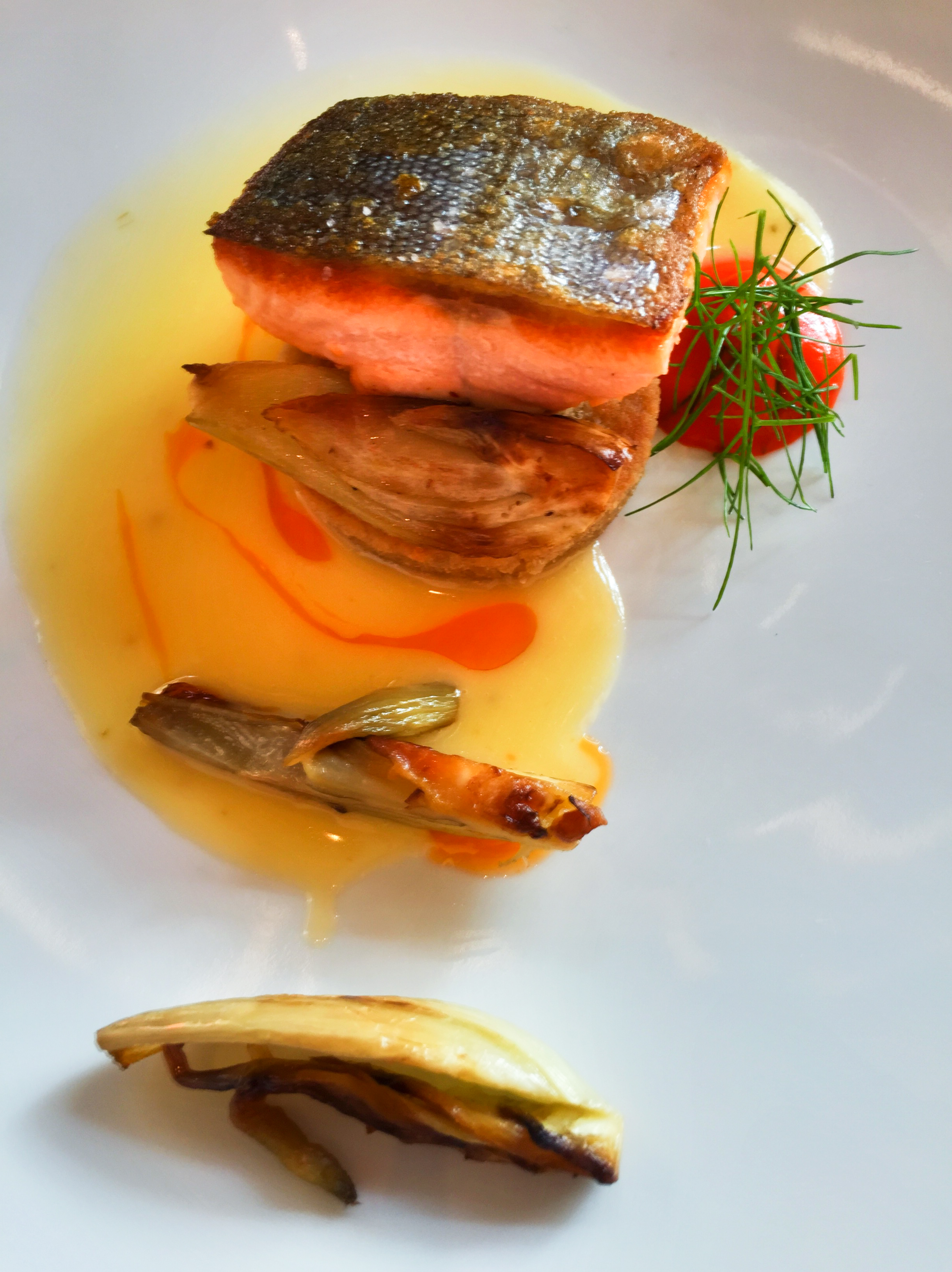 We had a fine meal, artfully prepared and served, and I couldn’t pass up a chance to share it with you. I had a beautiful squash salad and a roasted cauliflower plate. Eileen had a perfectly-made piece of Arctic Char, served with vegetables and a tasty sauce.