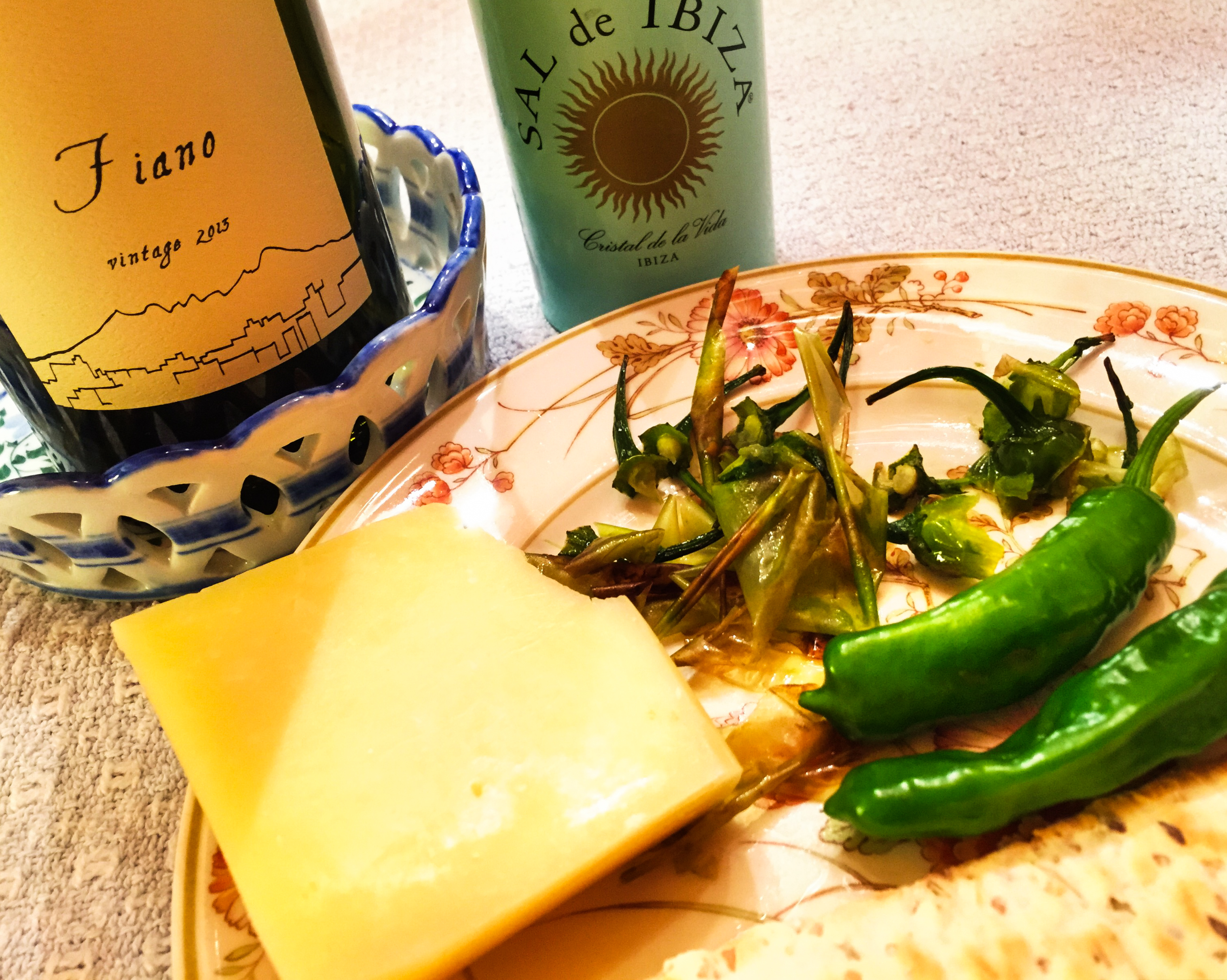 One of my favorite wines this year is Villa Creek’s 2013 Fiano, a Campania grape that somehow appears to do beautifully in Paso Robles, CA. The other night I needed a late night snack. The solution was pan-fried Shishito Peppers with sea salt from Ibiza, some slices of a vegan cheese (Chao), and two glasses of Fiano. Perfetto!