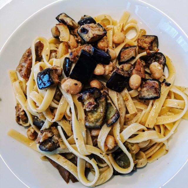 I’ve been cooking all weekend, so I was not desperate to use a bunch of items. I did, however, have a nice, small Italian eggplant that warranted attention, and some leftover fennel, vegan sausage, and white beans I should use up. Furthermore, it’s been DAYS since I had pasta, so the path was clear:
